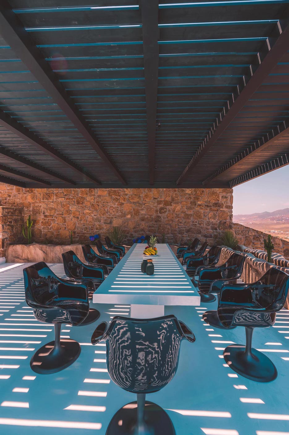 Located in an outstanding and unique location 4 kilometers away of the heart of Mykonos Town with uncanny views of the Aegean sea and the most iconic sunset. Villa Dione is a designed sensation worthy of an international jetsetter. Modernist in structure, but with a strong Cycladic heart, villa Dione is a stunning contemporary home imbued with a soulful bohemian character, standing nearly at the edge of the land, at times seeing to merge into the sea itself. Parties, champagne corks popping and private super yachts parading before your eyes. If you love nothing more than a touch of glam and indulgent luxury, then look no further than this one of a kind summer lair for up to 10 guests.
