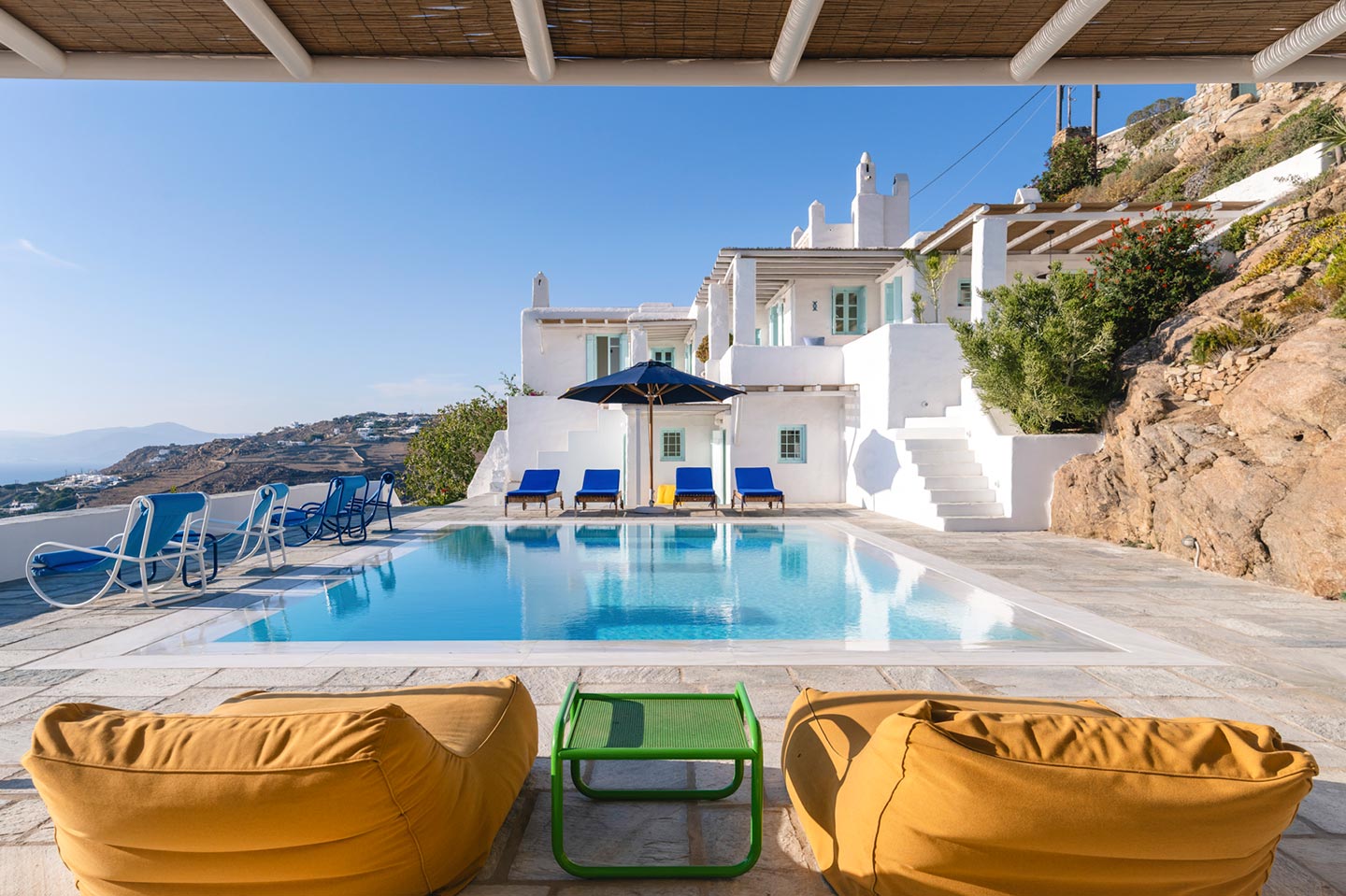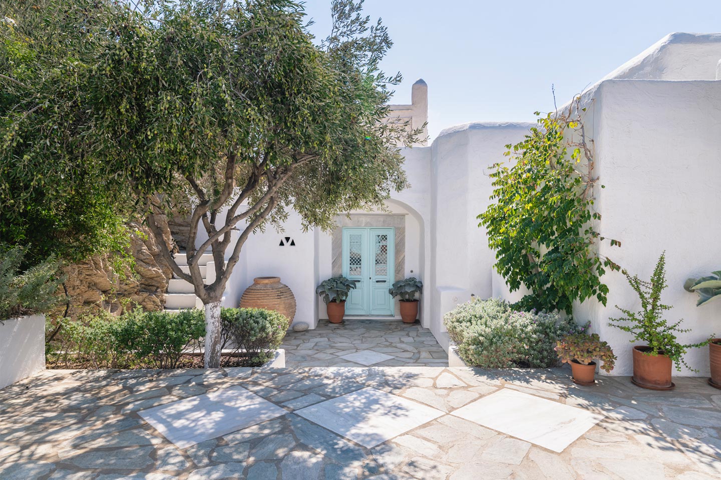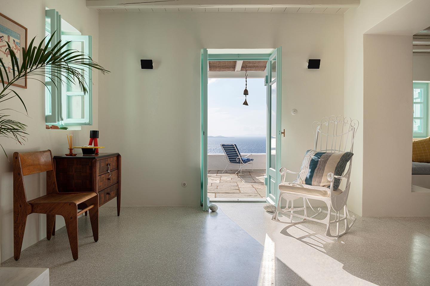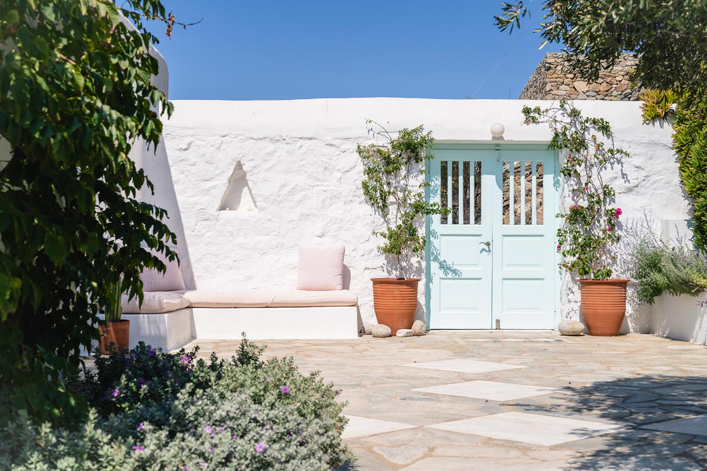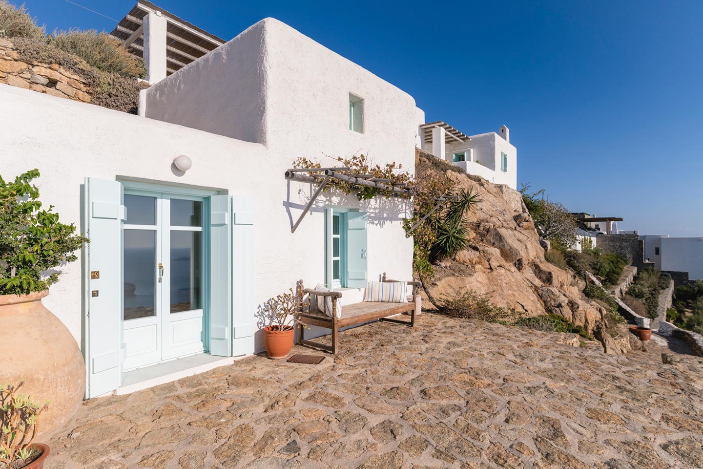 The original 1980’s building has been completely renovated in 2019 and personally decorated by the owners with handpicked design objects, antique furniture, original artworks and modern equipment, in a way that feels casual, laid back and effortless. The villa’s cool interiors feature pristine terrazzo floors throughout, rustic wood-carved doors, traditional ceramic tiles and superior local marble for the bathrooms and kitchen. Outside, a variety of terraces, balconies and niches distributed around the property allow for increased privacy even among a large group of guests. The villa is situated in Agia Sofia, an area that is sought-after for its breathtaking views, increased sense of privacy and close distance to Mykonos town and the entertainment spots on the island.