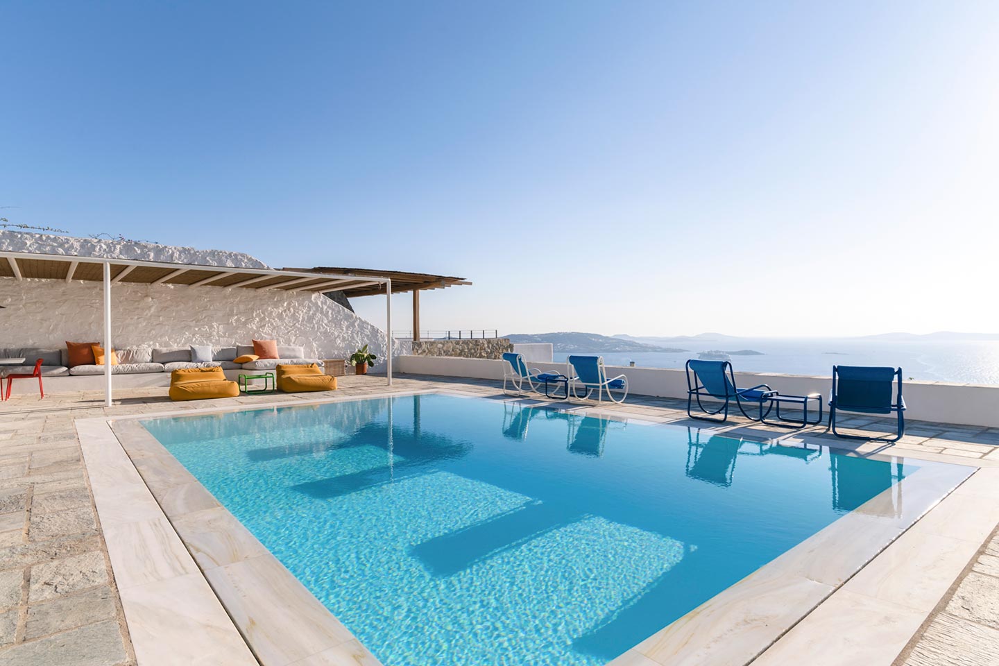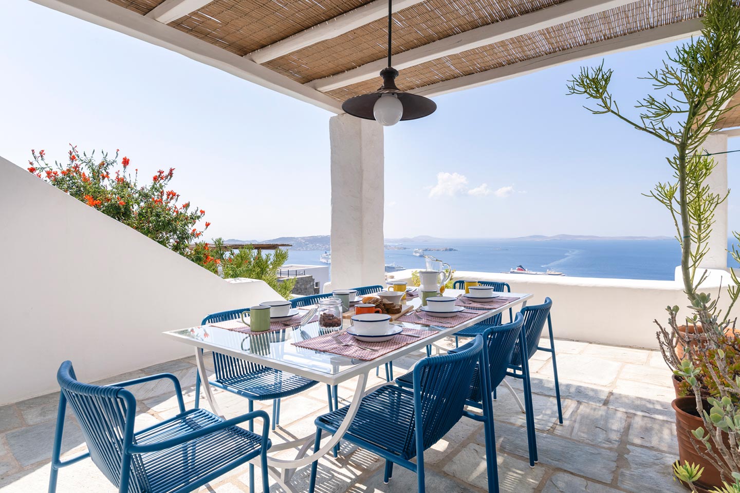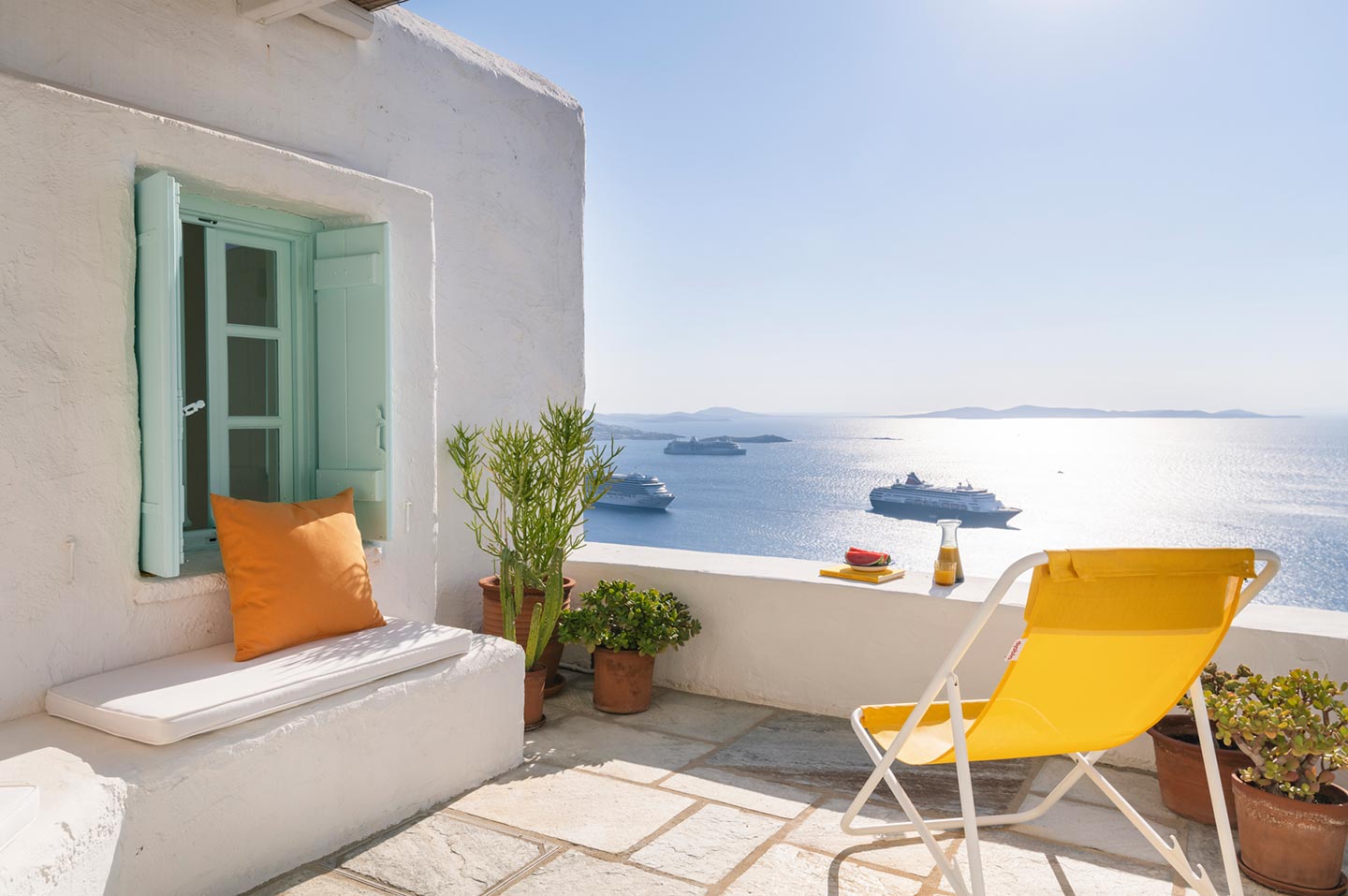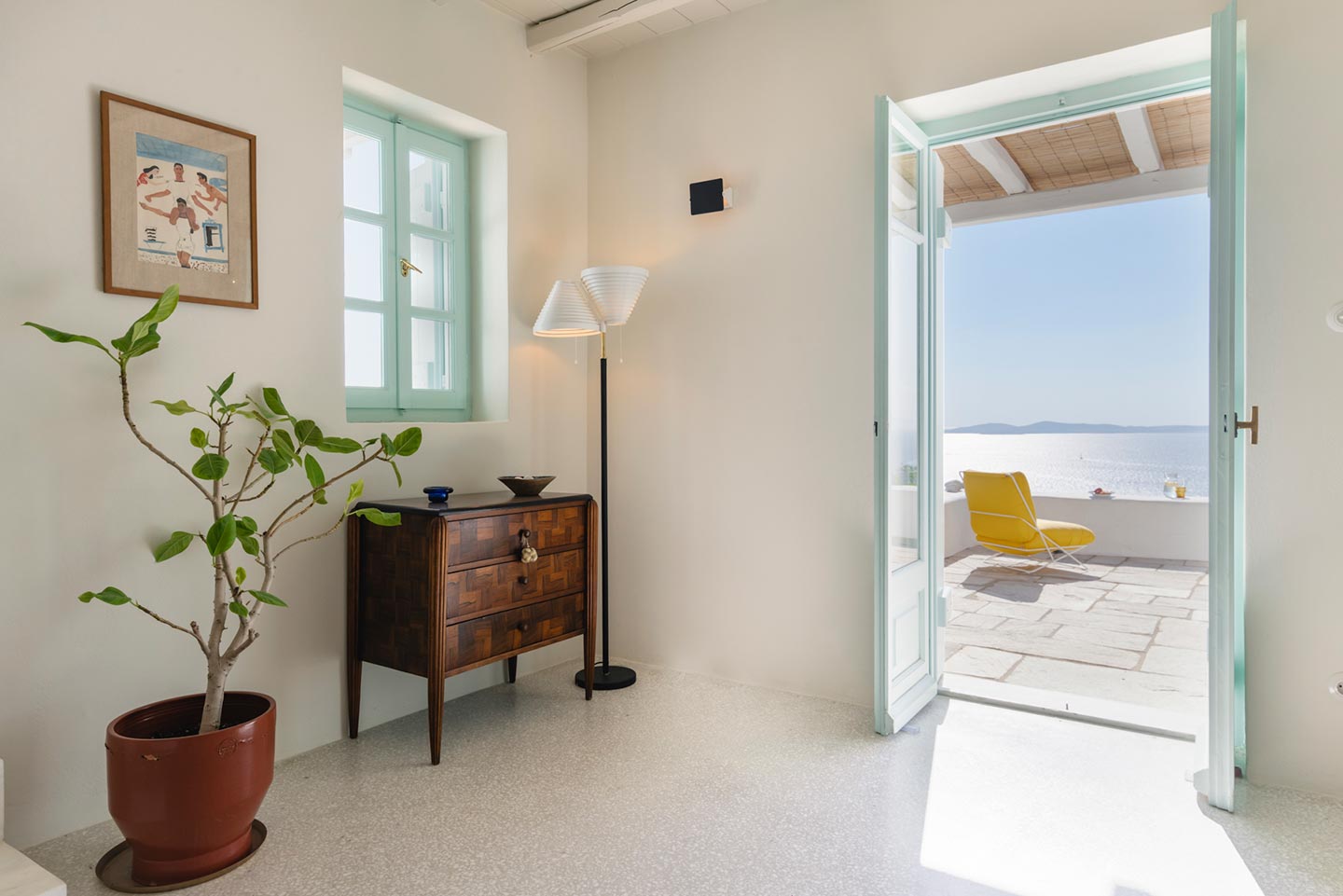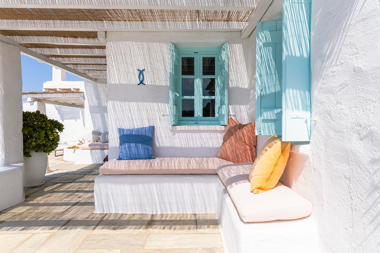 The original 1980’s building has been completely renovated in 2019 and personally decorated by the owners with handpicked design objects, antique furniture, original artworks and modern equipment, in a way that feels casual, laid back and effortless. The villa’s cool interiors feature pristine terrazzo floors throughout, rustic wood-carved doors, traditional ceramic tiles and superior local marble for the bathrooms and kitchen. Outside, a variety of terraces, balconies and niches distributed around the property allow for increased privacy even among a large group of guests. The villa is situated in Agia Sofia, an area that is sought-after for its breathtaking views, increased sense of privacy and close distance to Mykonos town and the entertainment spots on the island.