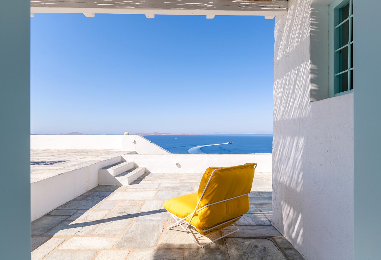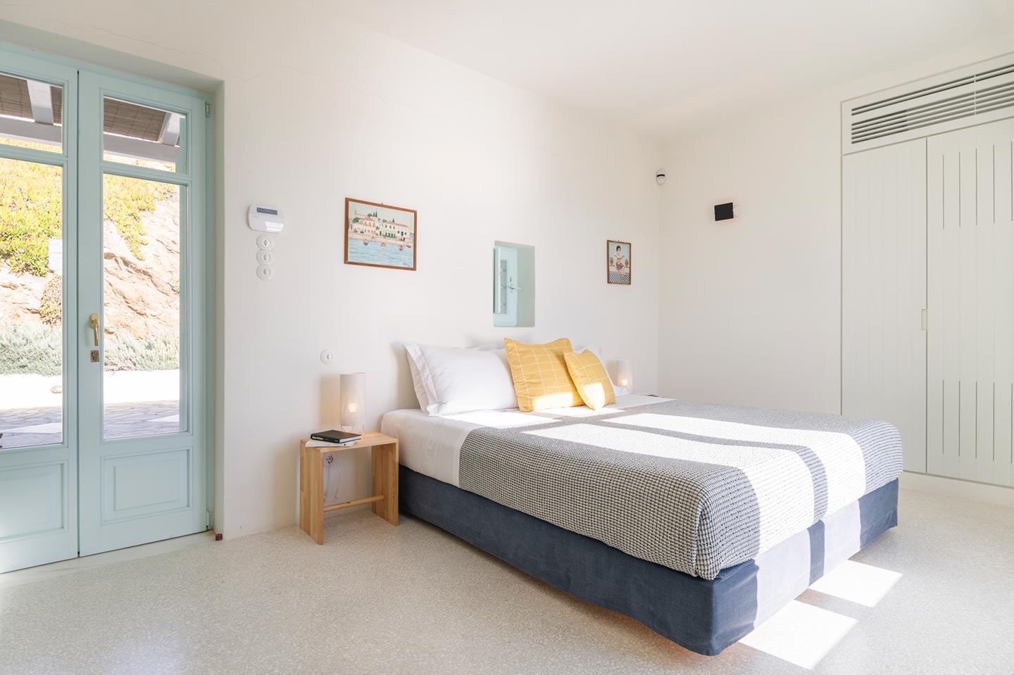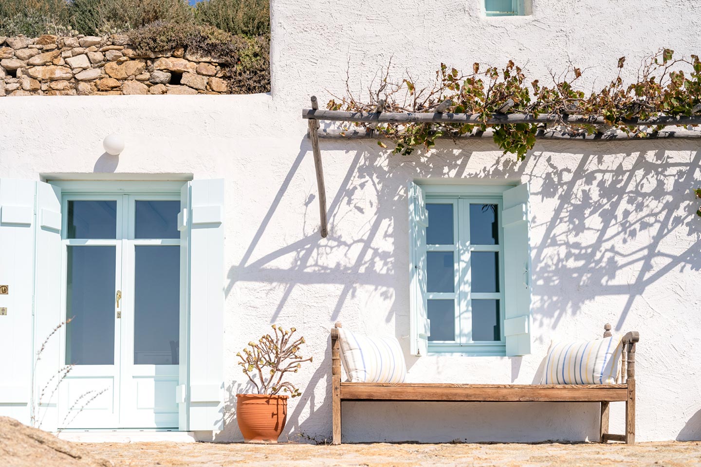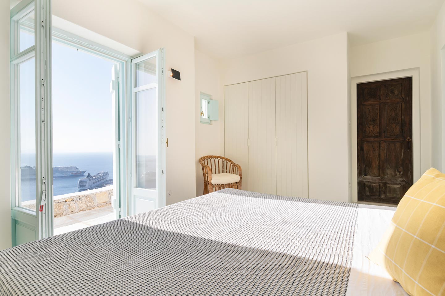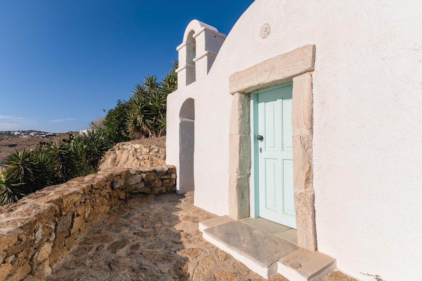 The original 1980’s building has been completely renovated in 2019 and personally decorated by the owners with handpicked design objects, antique furniture, original artworks and modern equipment, in a way that feels casual, laid back and effortless. The villa’s cool interiors feature pristine terrazzo floors throughout, rustic wood-carved doors, traditional ceramic tiles and superior local marble for the bathrooms and kitchen. Outside, a variety of terraces, balconies and niches distributed around the property allow for increased privacy even among a large group of guests. The villa is situated in Agia Sofia, an area that is sought-after for its breathtaking views, increased sense of privacy and close distance to Mykonos town and the entertainment spots on the island.