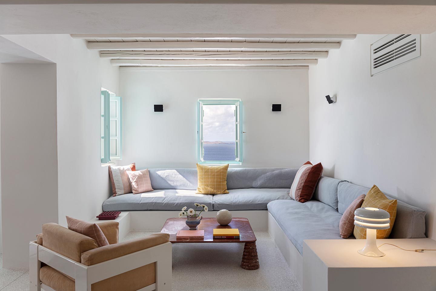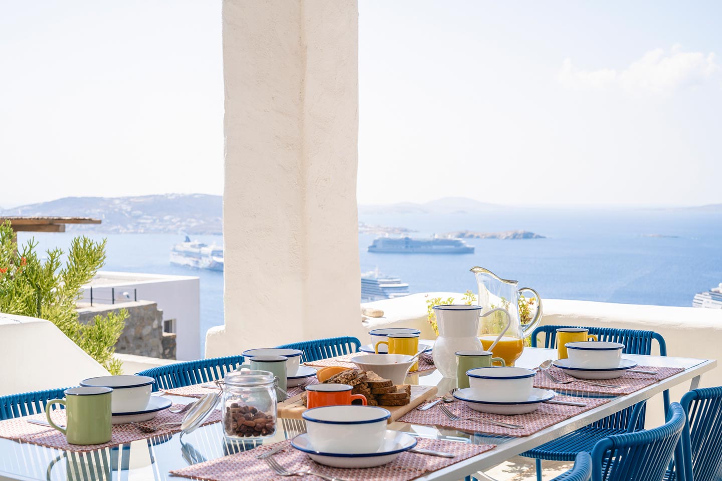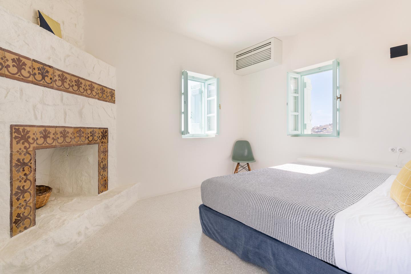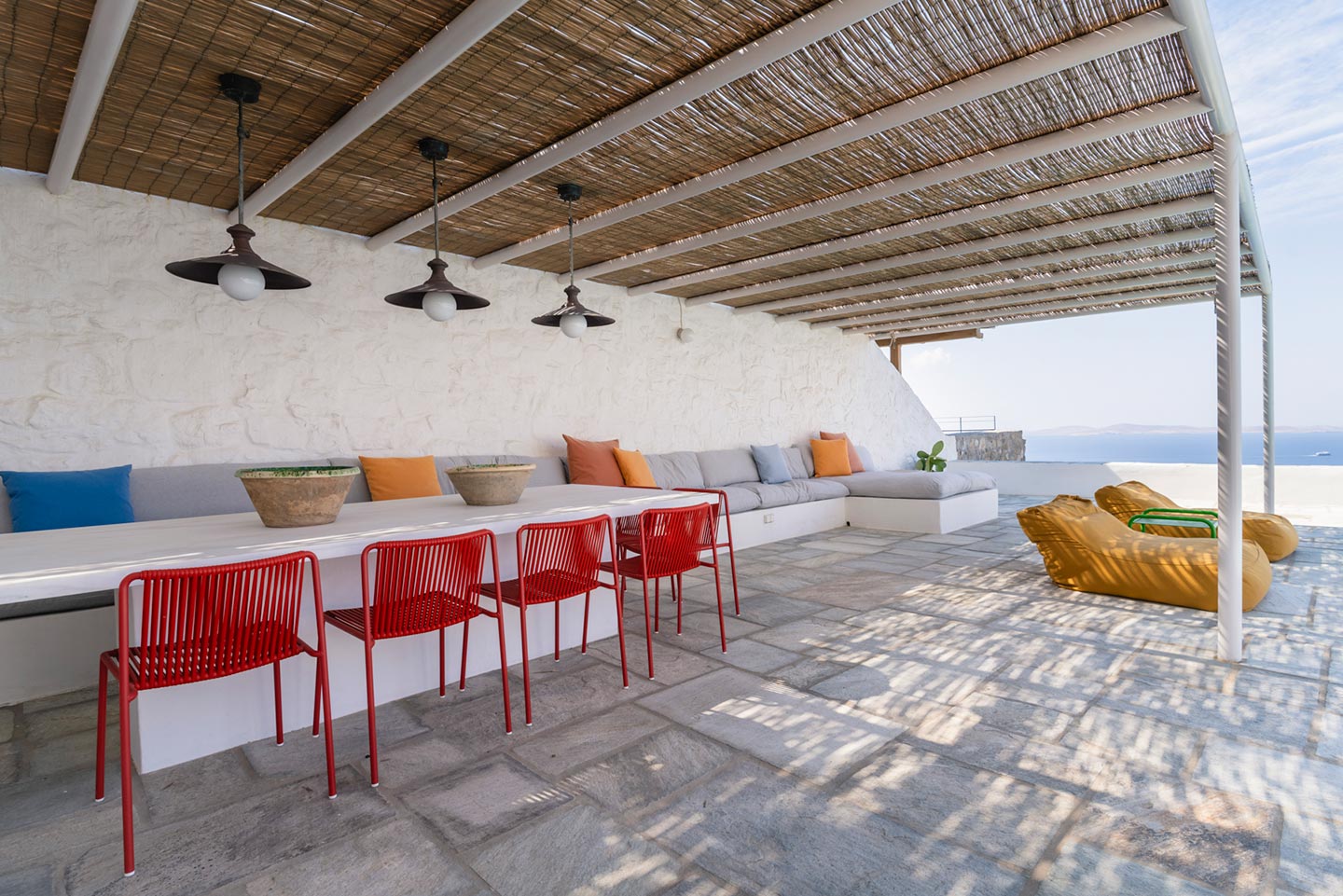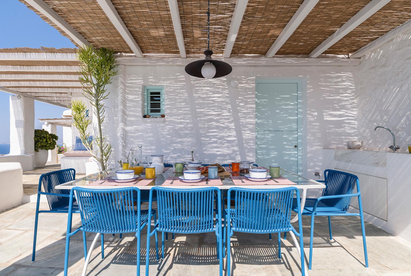 The original 1980’s building has been completely renovated in 2019 and personally decorated by the owners with handpicked design objects, antique furniture, original artworks and modern equipment, in a way that feels casual, laid back and effortless. The villa’s cool interiors feature pristine terrazzo floors throughout, rustic wood-carved doors, traditional ceramic tiles and superior local marble for the bathrooms and kitchen. Outside, a variety of terraces, balconies and niches distributed around the property allow for increased privacy even among a large group of guests. The villa is situated in Agia Sofia, an area that is sought-after for its breathtaking views, increased sense of privacy and close distance to Mykonos town and the entertainment spots on the island.