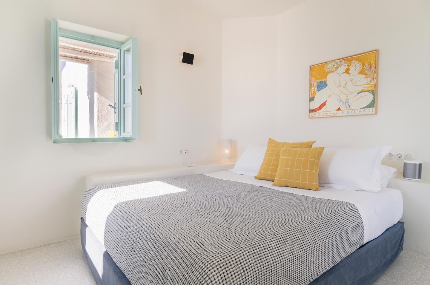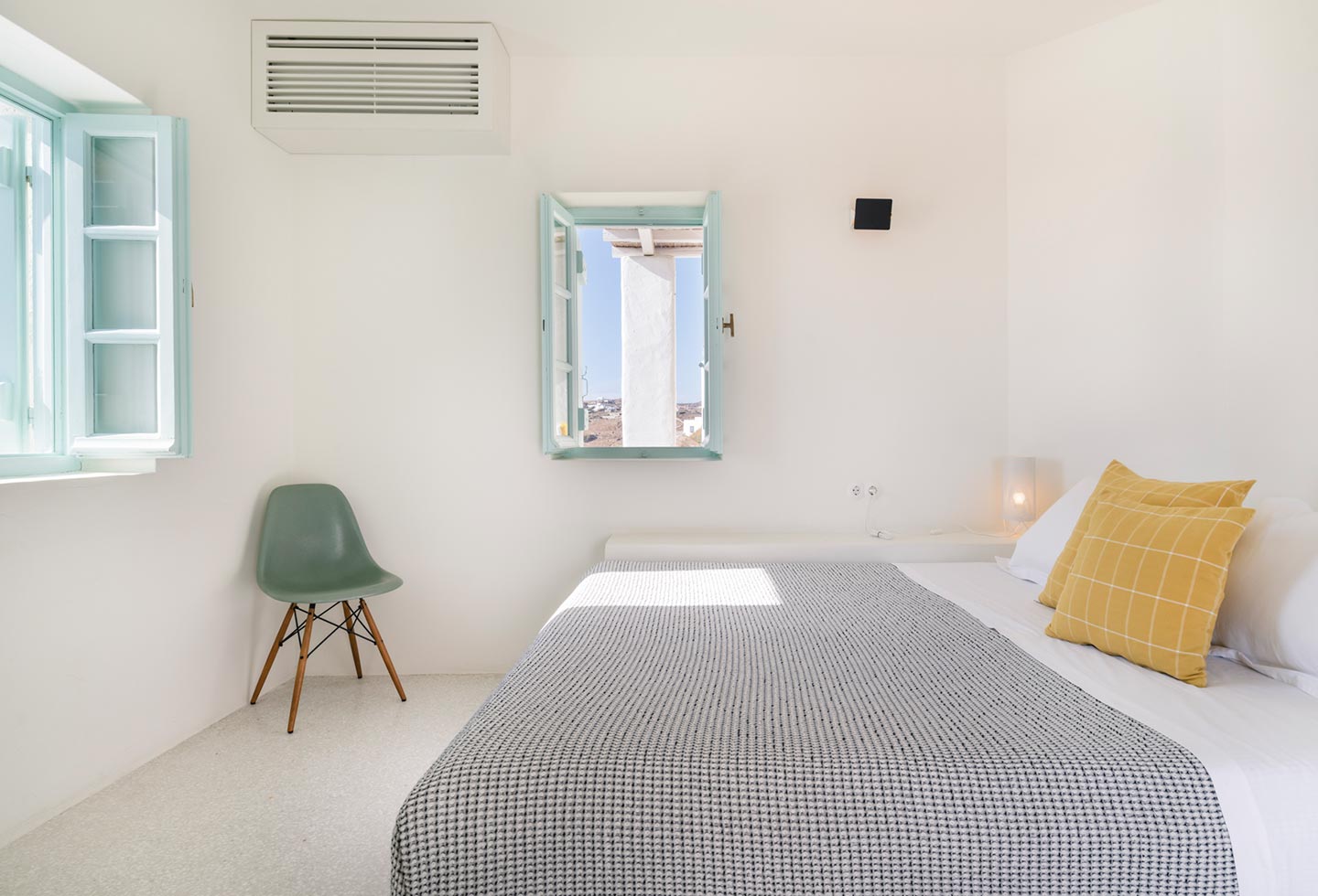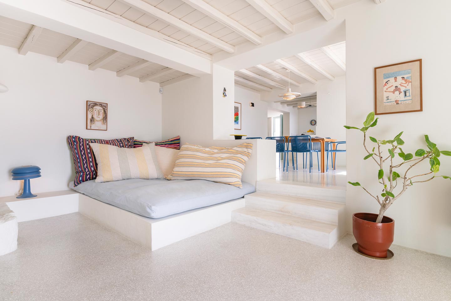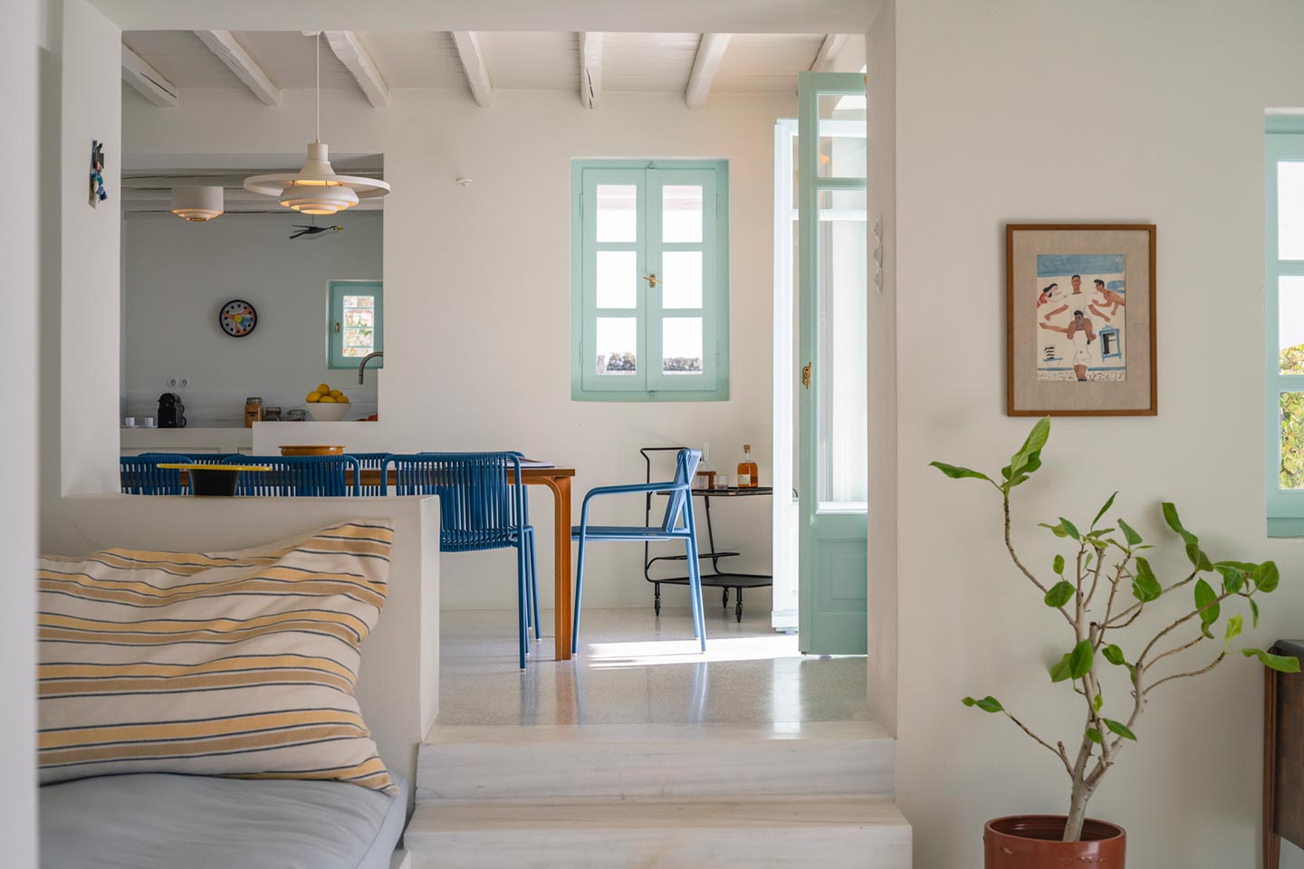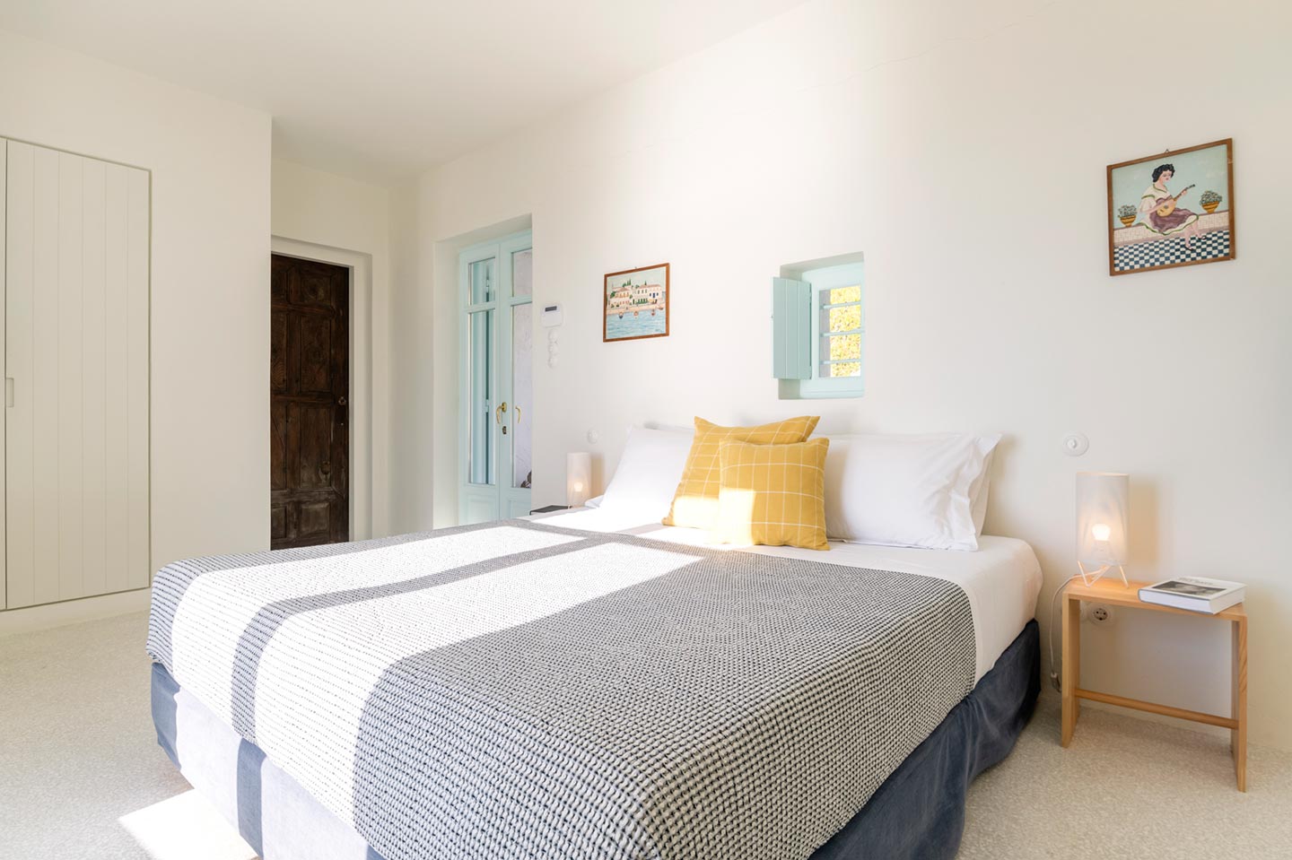 The original 1980’s building has been completely renovated in 2019 and personally decorated by the owners with handpicked design objects, antique furniture, original artworks and modern equipment, in a way that feels casual, laid back and effortless. The villa’s cool interiors feature pristine terrazzo floors throughout, rustic wood-carved doors, traditional ceramic tiles and superior local marble for the bathrooms and kitchen. Outside, a variety of terraces, balconies and niches distributed around the property allow for increased privacy even among a large group of guests. The villa is situated in Agia Sofia, an area that is sought-after for its breathtaking views, increased sense of privacy and close distance to Mykonos town and the entertainment spots on the island.