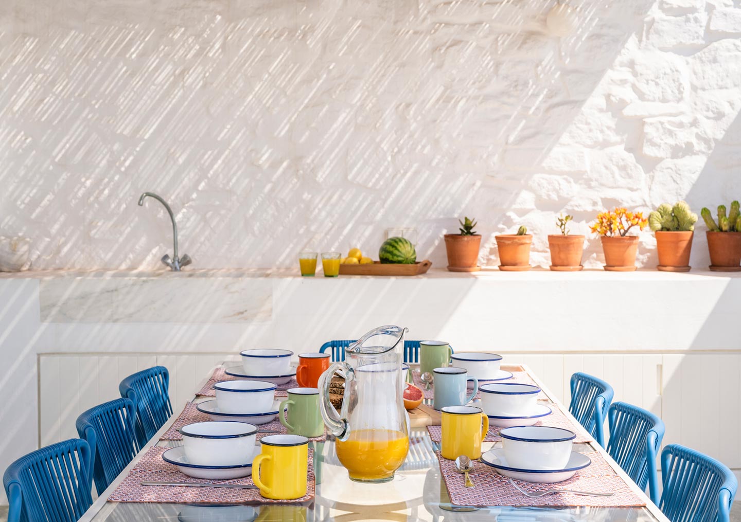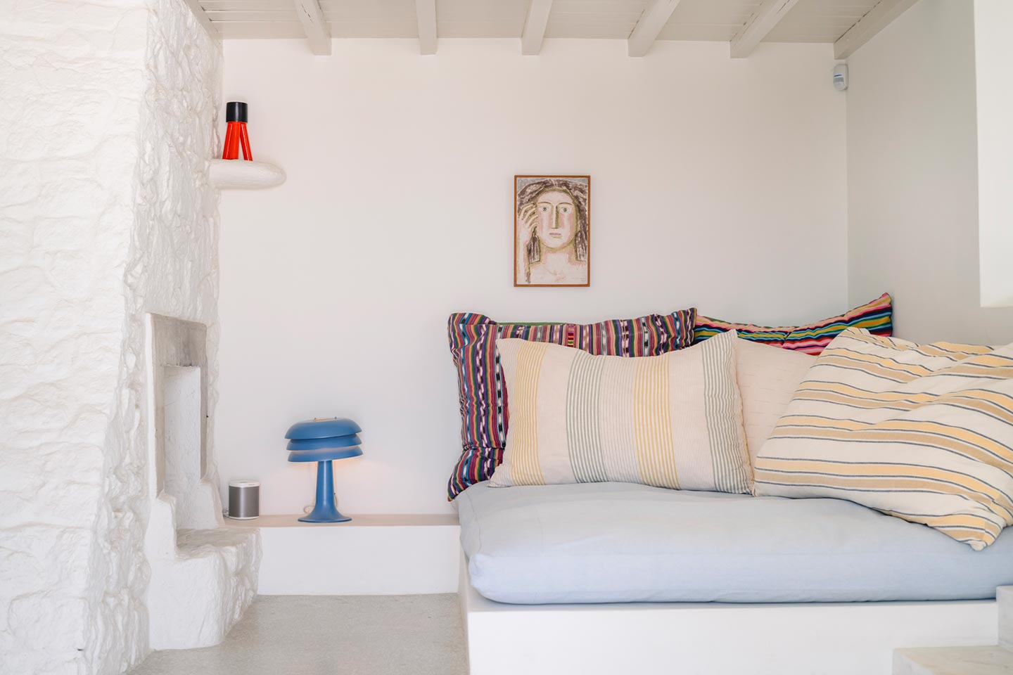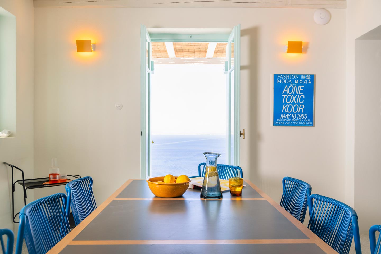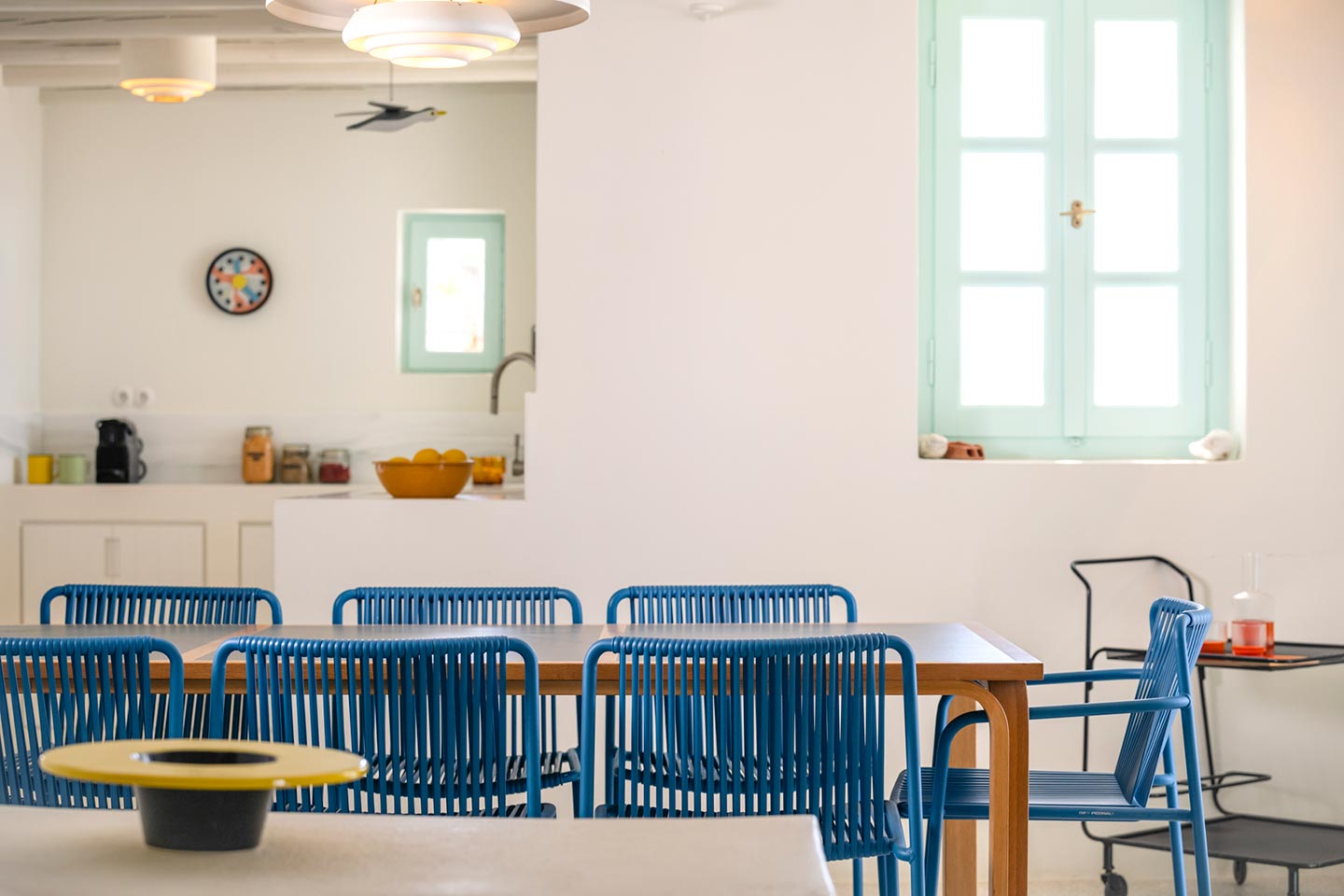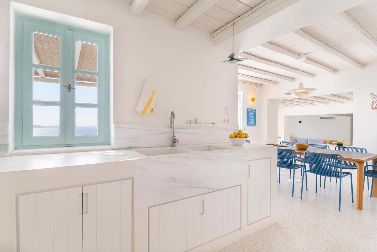 The original 1980’s building has been completely renovated in 2019 and personally decorated by the owners with handpicked design objects, antique furniture, original artworks and modern equipment, in a way that feels casual, laid back and effortless. The villa’s cool interiors feature pristine terrazzo floors throughout, rustic wood-carved doors, traditional ceramic tiles and superior local marble for the bathrooms and kitchen. Outside, a variety of terraces, balconies and niches distributed around the property allow for increased privacy even among a large group of guests. The villa is situated in Agia Sofia, an area that is sought-after for its breathtaking views, increased sense of privacy and close distance to Mykonos town and the entertainment spots on the island.