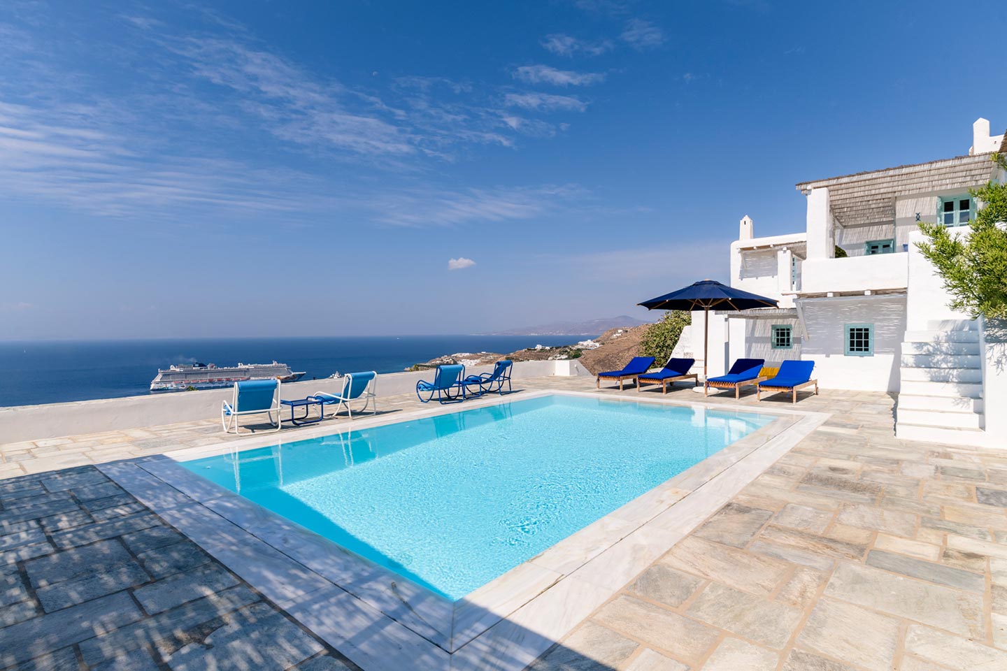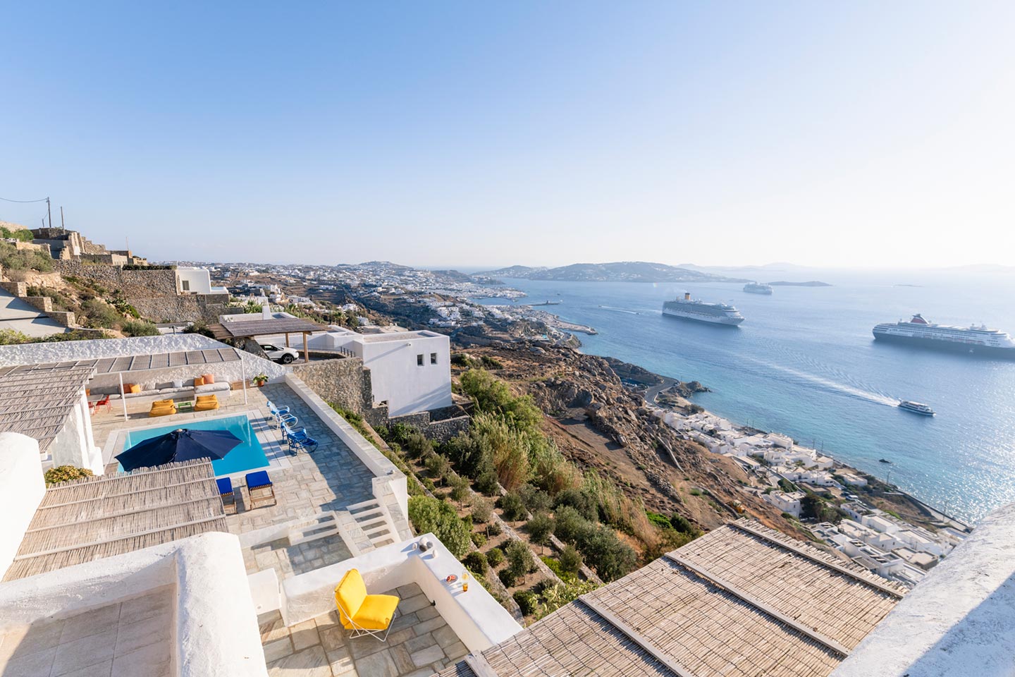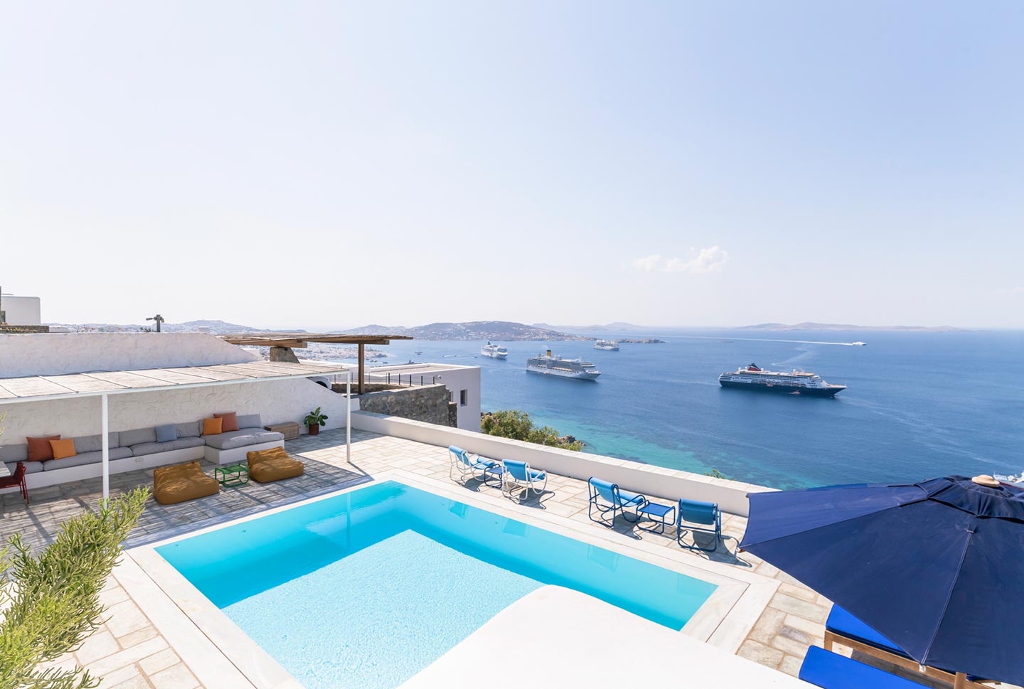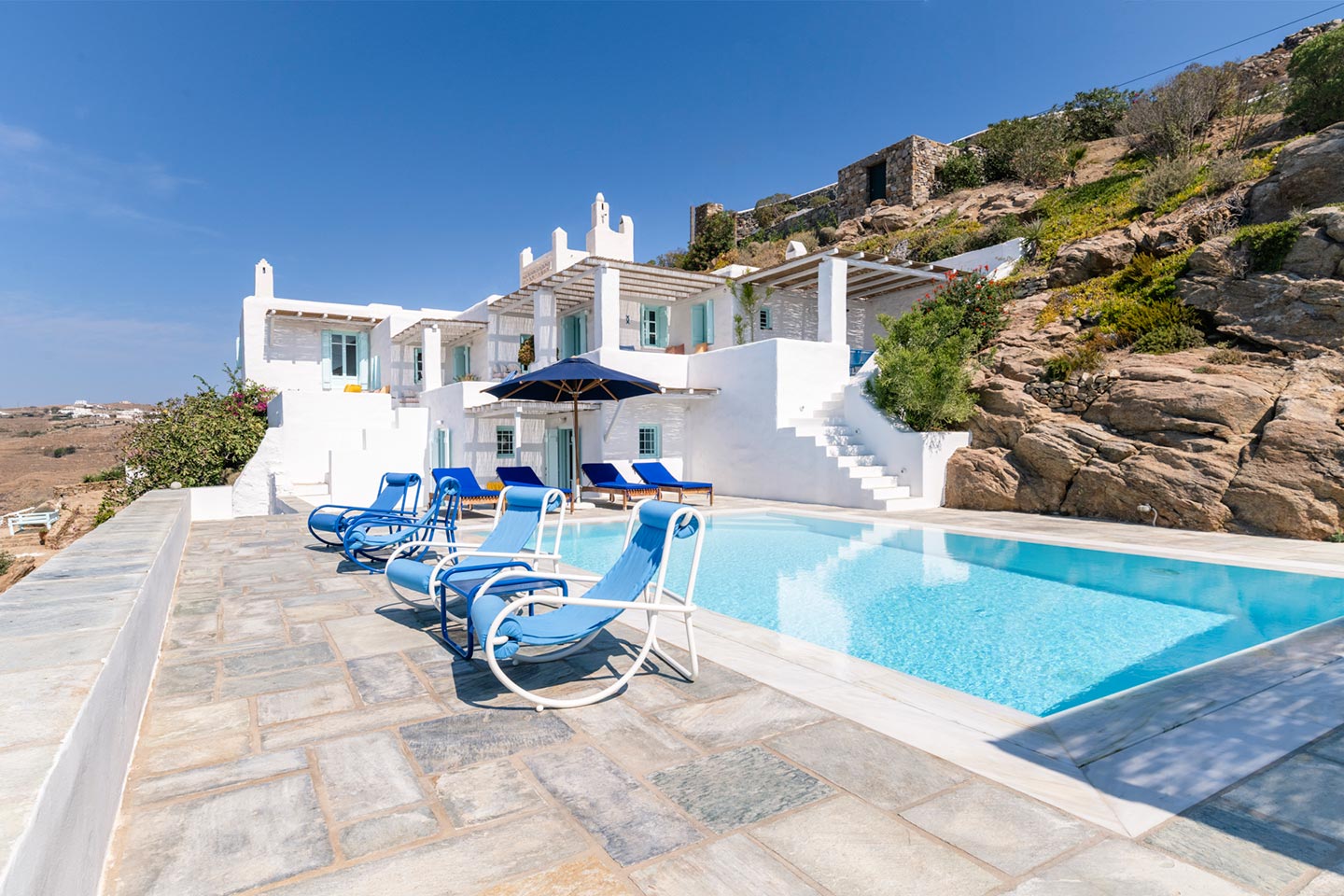 One of the most lovingly refurbished villas on Mykonos, indulges guests with sophisticated Cycladic hospitality and a feeling of being pampered by good friends. The villa boasts a 180-degree panorama of Cycladic islands and Mykonos town, allowing guests to imagine those early Aegean travelers leisurely crossing the sea on their way to trade goods or pilgrimage.Ella stands out for its understated sophistication and unique character that follows an alternative approach to Mediterranean holiday living and it can easily accommodate up to 14 guests in 6 beautiful bedrooms.