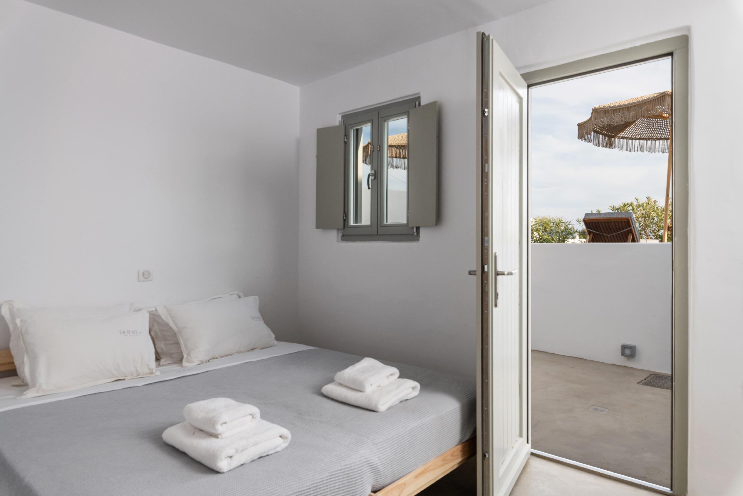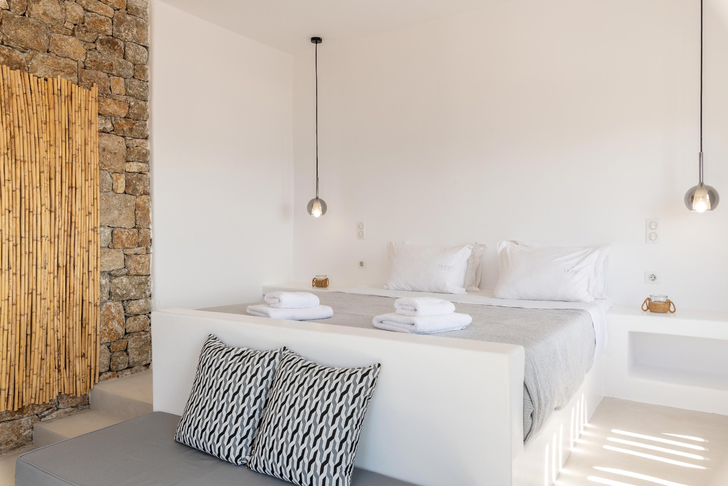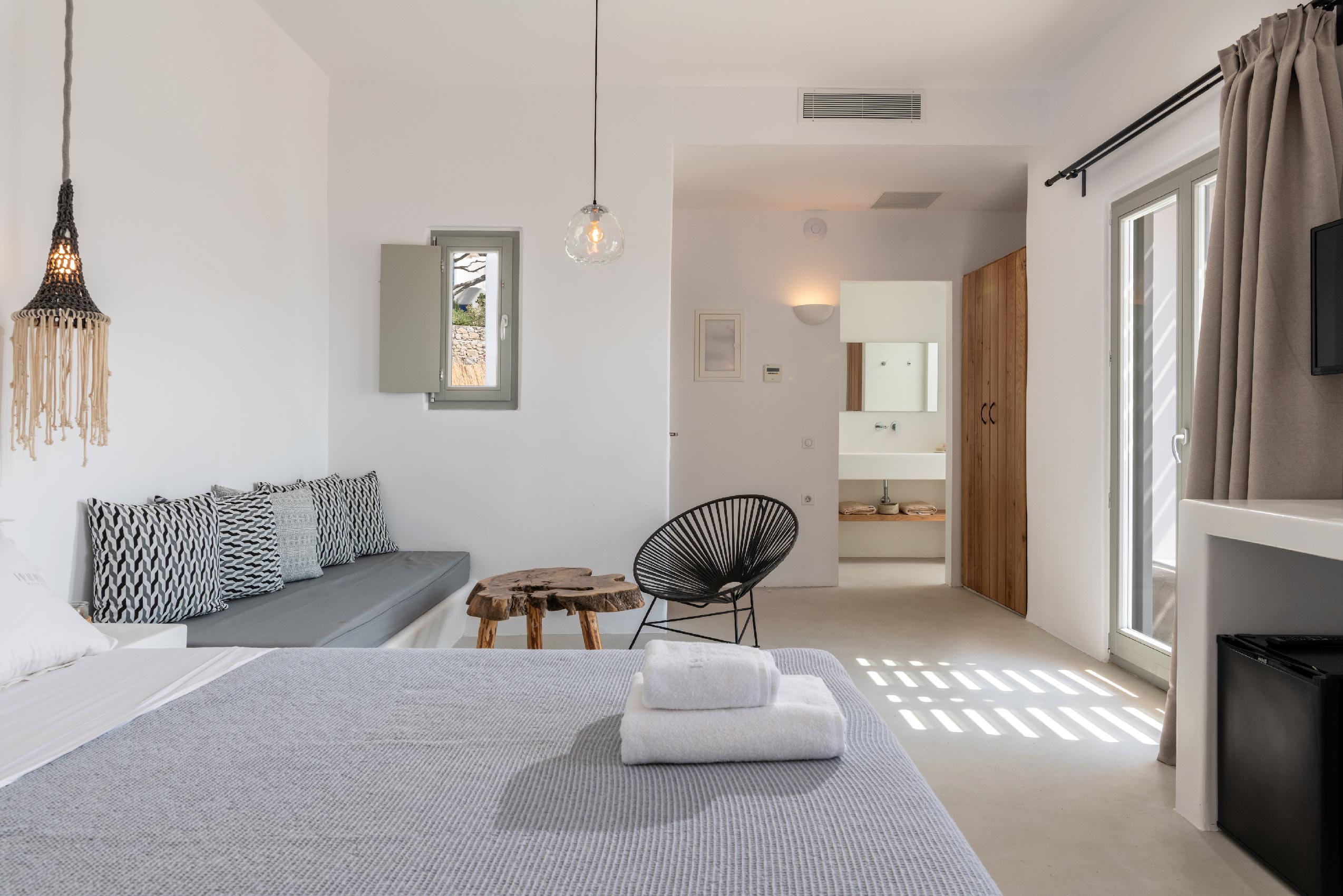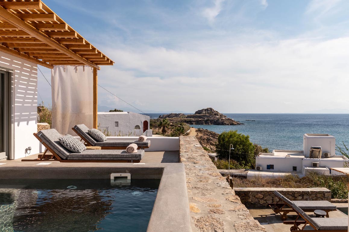6 of the 7 suites include a private outdoor jacuzzi on the sun soaked balconies which are perfect for cooling off in the Greek heat and for basking with cocktails in full view of Scorpios and bay of Psarou and Platis Gialos, which are a magnet for the most beautiful yachts that visit the island. Ethos boasts access to a peaceful secret beach and also has an outdoor swimming pool with a cosy and stylish outdoor kitchen, bar, terrace, and shaded dining area with a superb built in sound system.