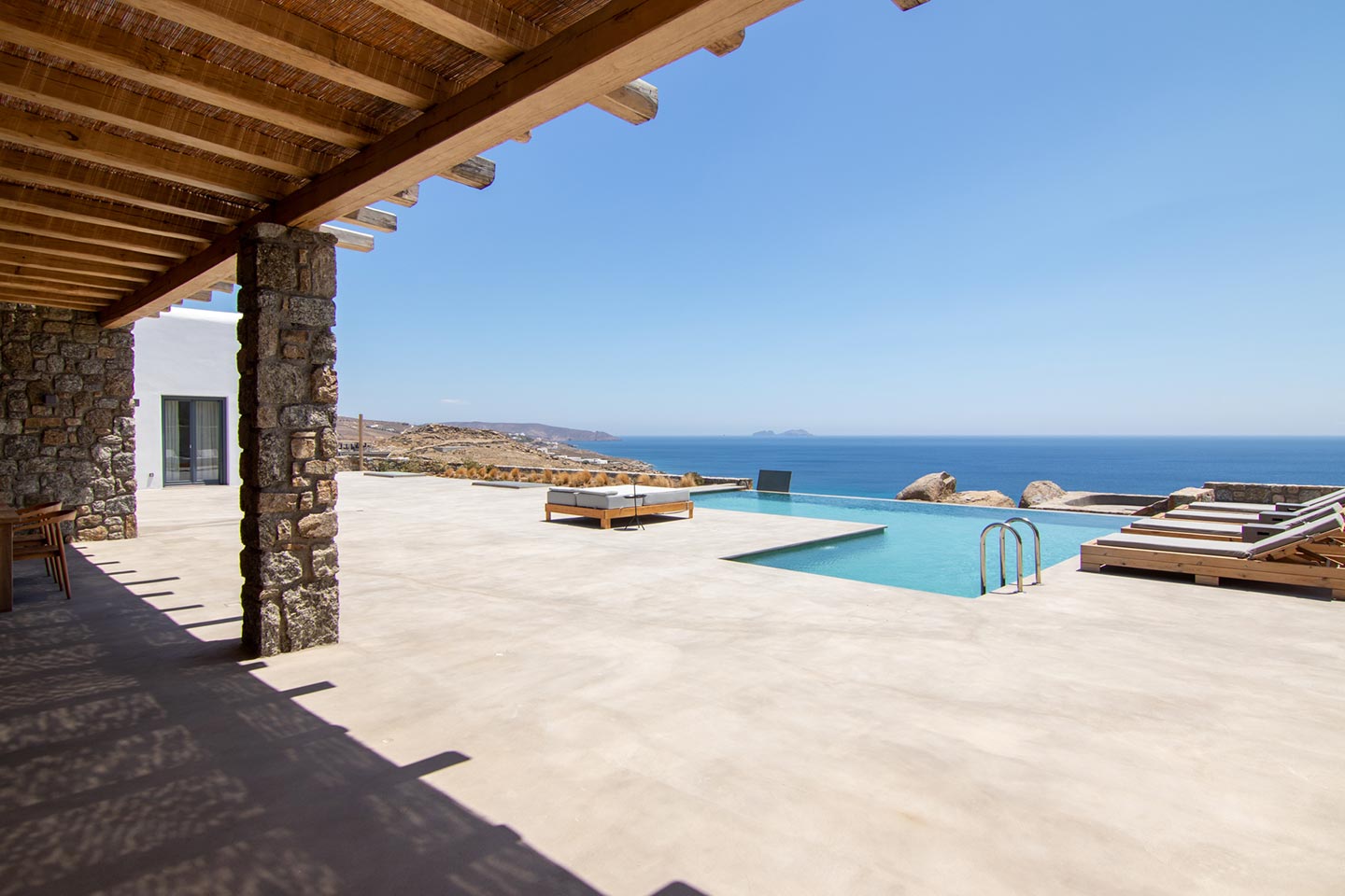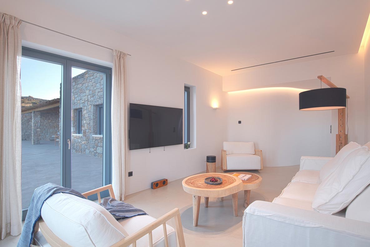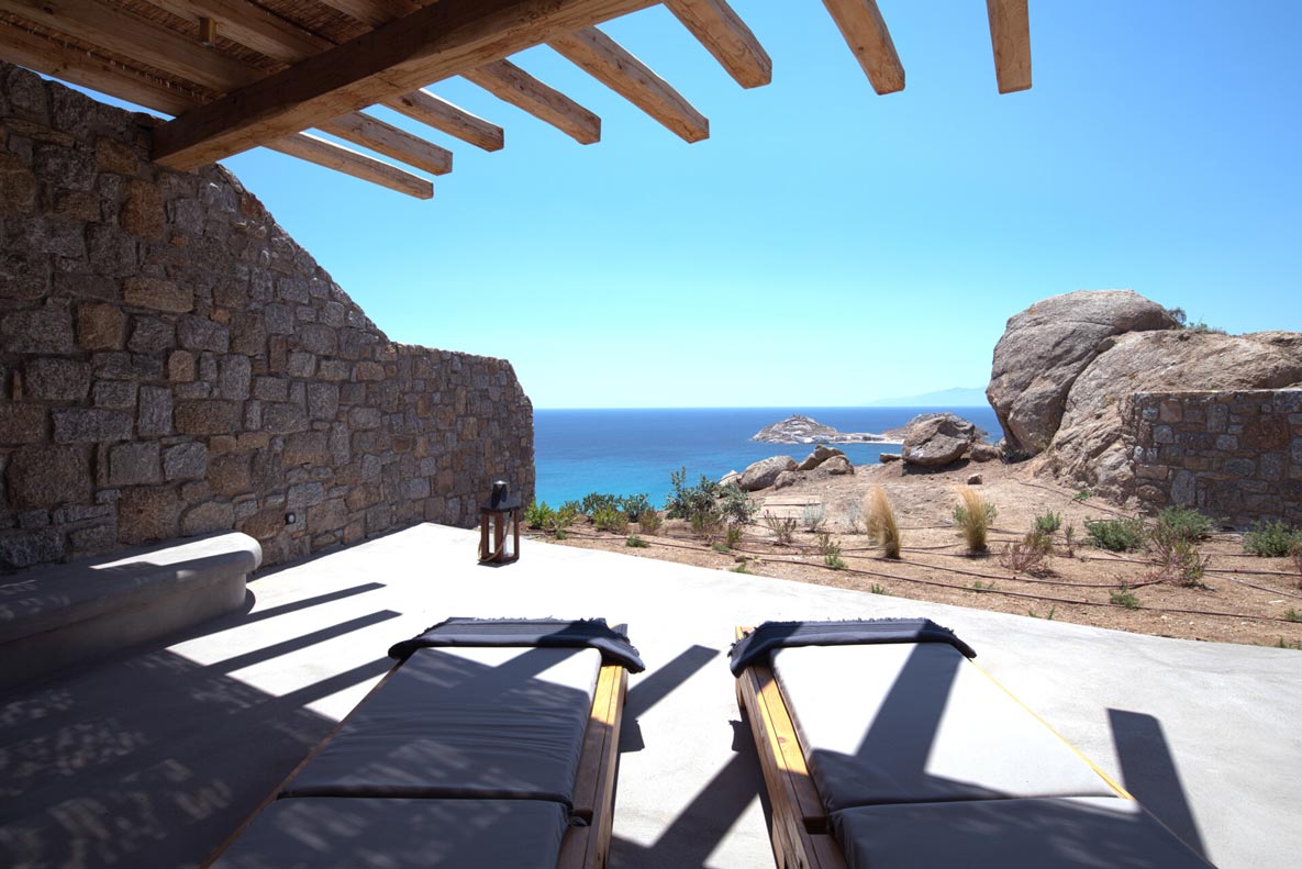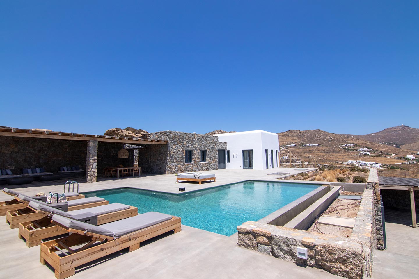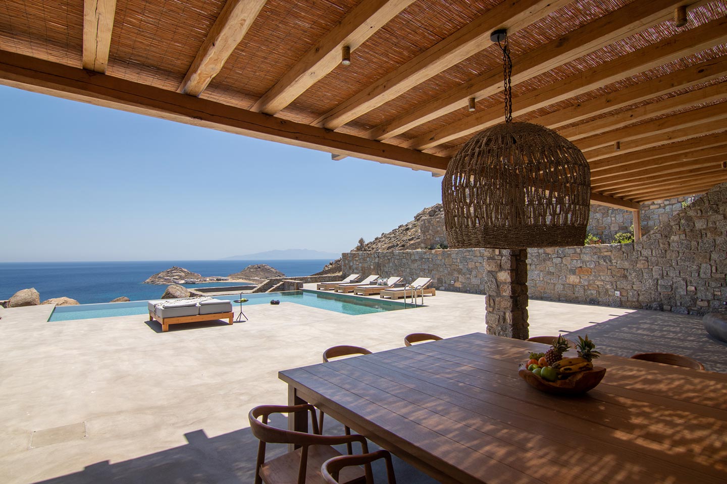 This superb, stone-clad, slab-designed, four-bedroom exclusive villa, perfectly captures Mykonos’ timeless panache. Dine like kings on spacious verandas, dip into a gorgeous infinity pool surrounded by a panoramic Aegean seascape you’ll never forget. Inside, this stylish house’s chic minimal aesthetics offer swathes of space and handcrafted woods. Gorgeous designer furniture and wicker pieces add warmth and a natural feel throughout. Sleep serenely in über-cool, en-suite bedrooms. Part of a 3-house complex where your privacy is neatly combined with glorious open-air summer living.