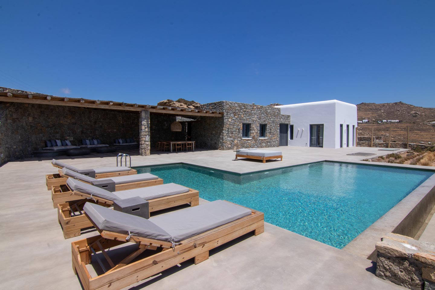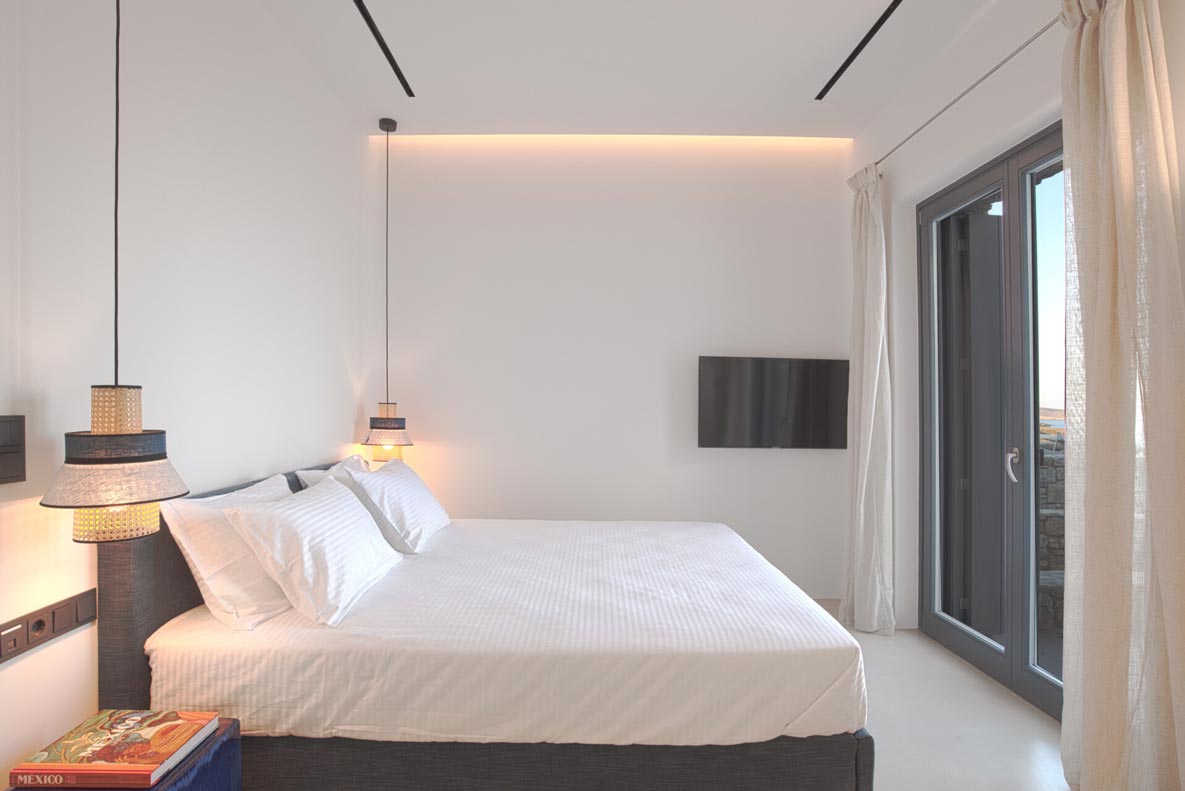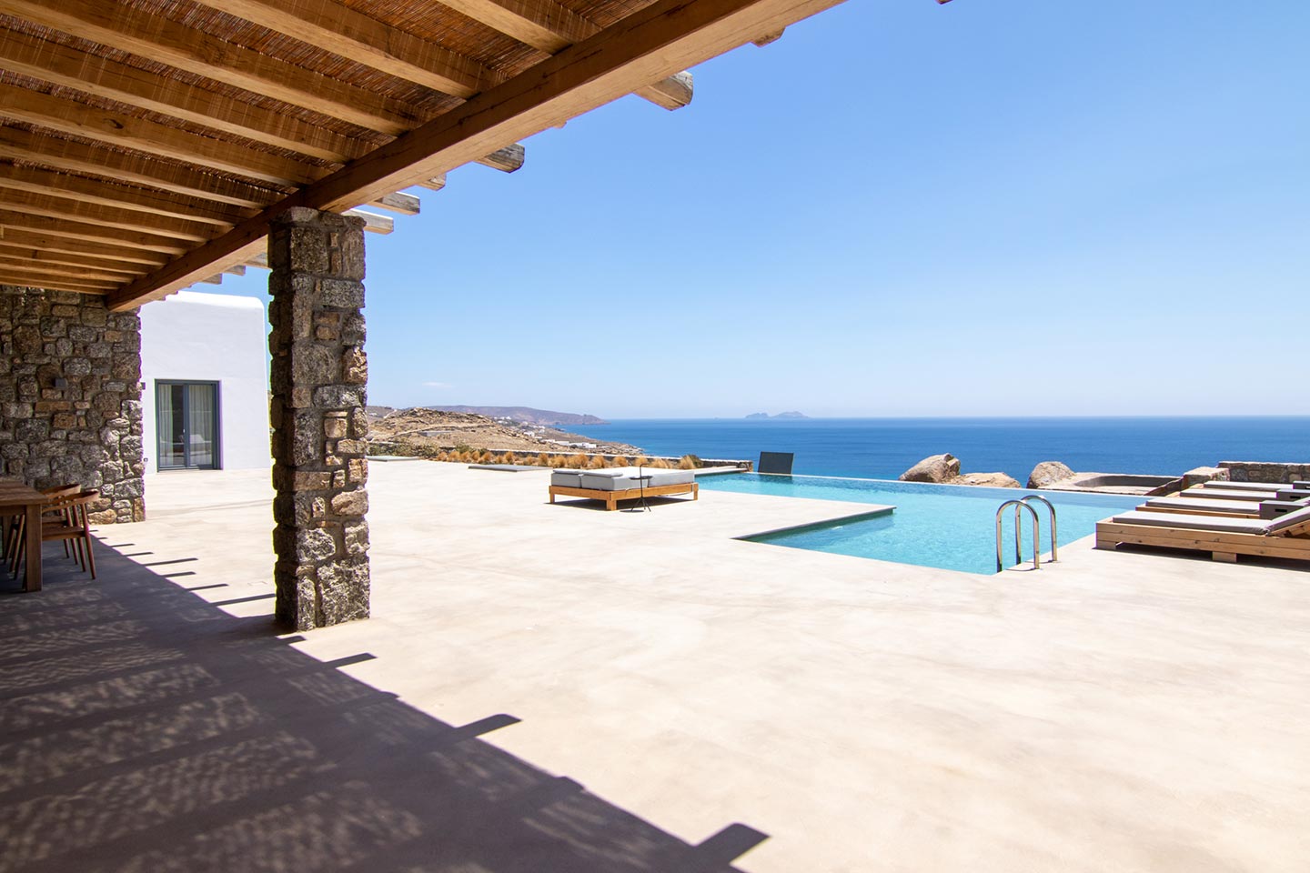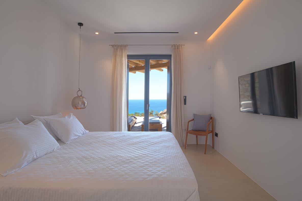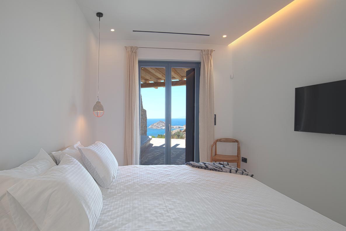 This superb, stone-clad, slab-designed, four-bedroom exclusive villa, perfectly captures Mykonos’ timeless panache. Dine like kings on spacious verandas, dip into a gorgeous infinity pool surrounded by a panoramic Aegean seascape you’ll never forget. Inside, this stylish house’s chic minimal aesthetics offer swathes of space and handcrafted woods. Gorgeous designer furniture and wicker pieces add warmth and a natural feel throughout. Sleep serenely in über-cool, en-suite bedrooms. Part of a 3-house complex where your privacy is neatly combined with glorious open-air summer living.
