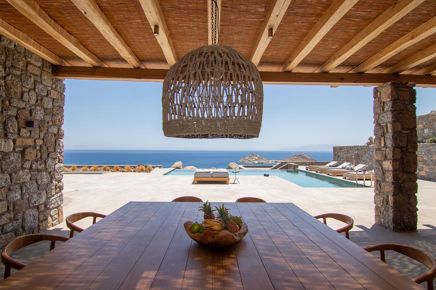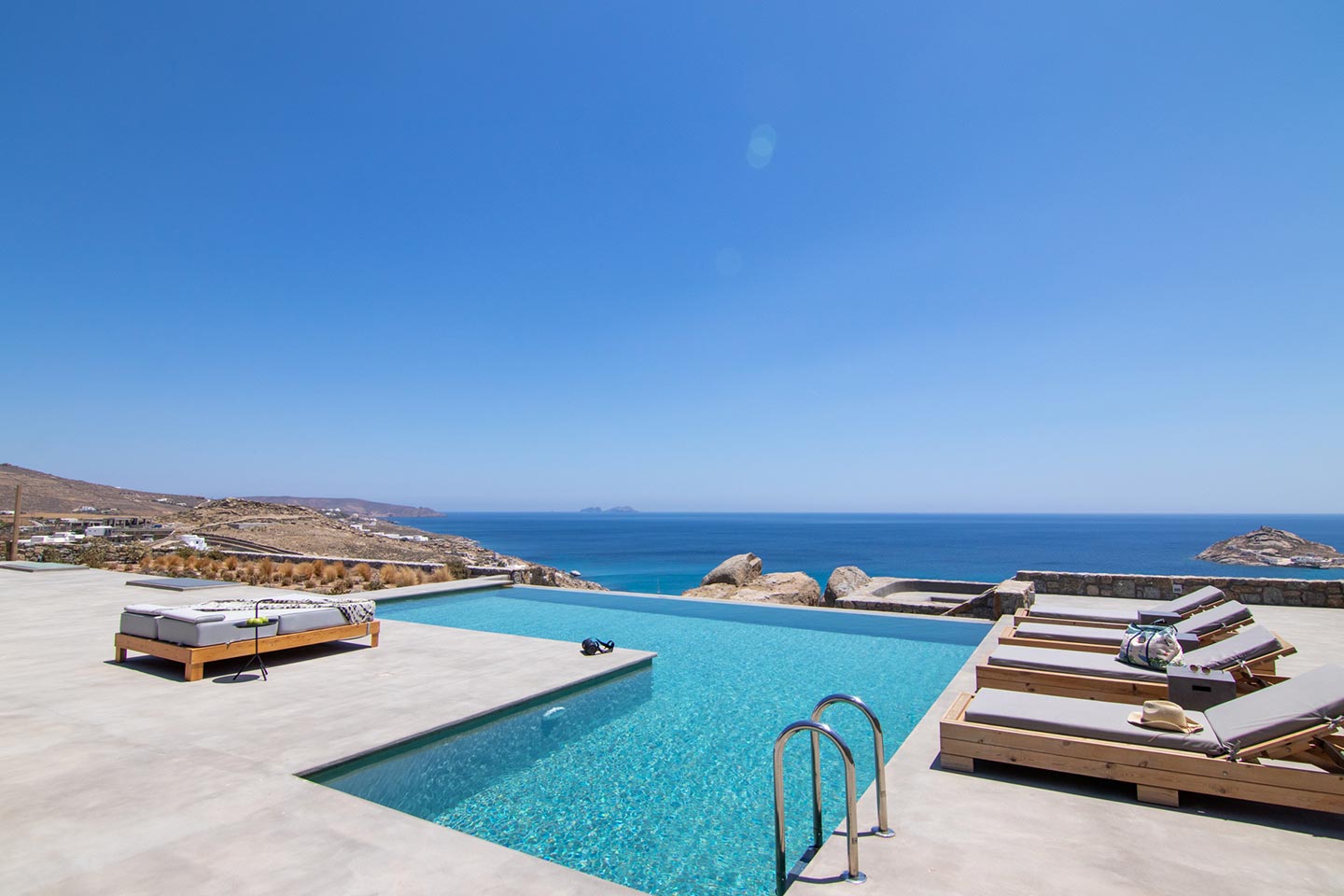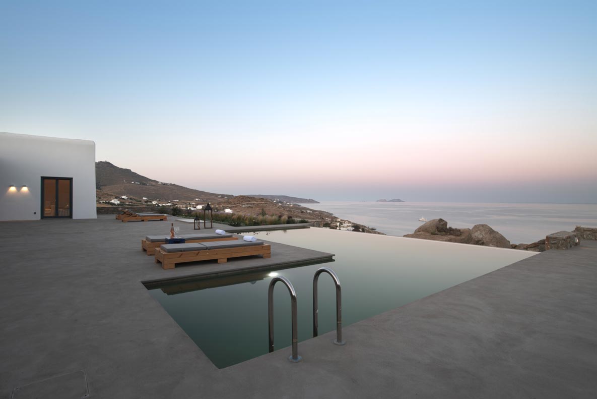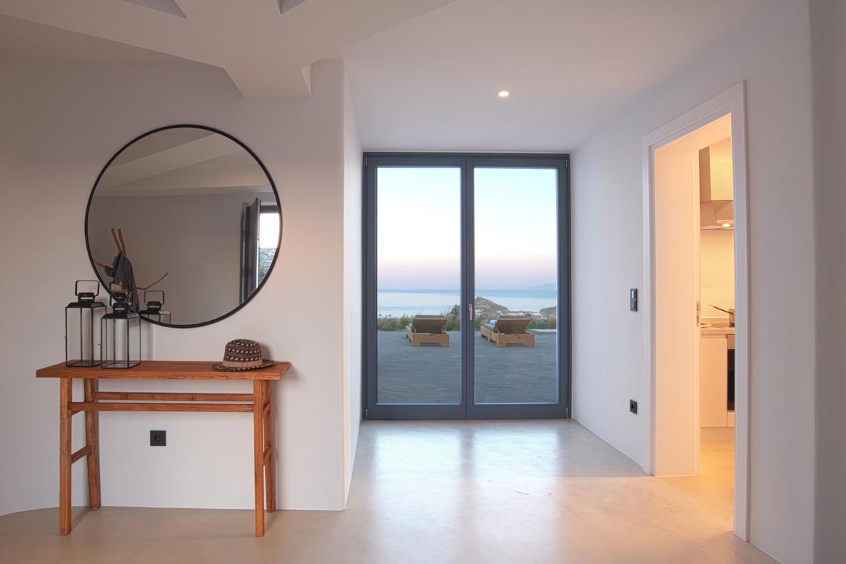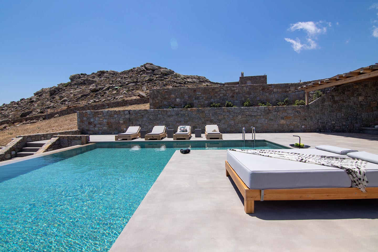 This superb, stone-clad, slab-designed, four-bedroom exclusive villa, perfectly captures Mykonos’ timeless panache. Dine like kings on spacious verandas, dip into a gorgeous infinity pool surrounded by a panoramic Aegean seascape you’ll never forget. Inside, this stylish house’s chic minimal aesthetics offer swathes of space and handcrafted woods. Gorgeous designer furniture and wicker pieces add warmth and a natural feel throughout. Sleep serenely in über-cool, en-suite bedrooms. Part of a 3-house complex where your privacy is neatly combined with glorious open-air summer living.