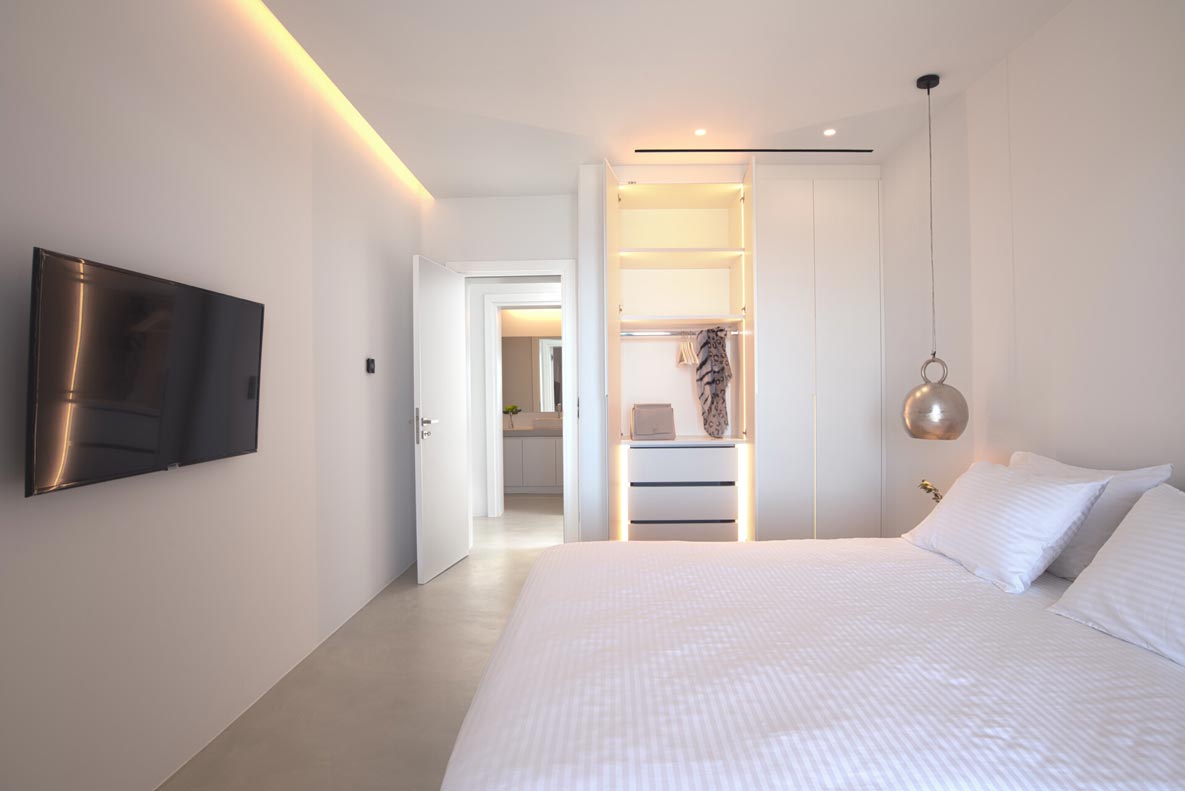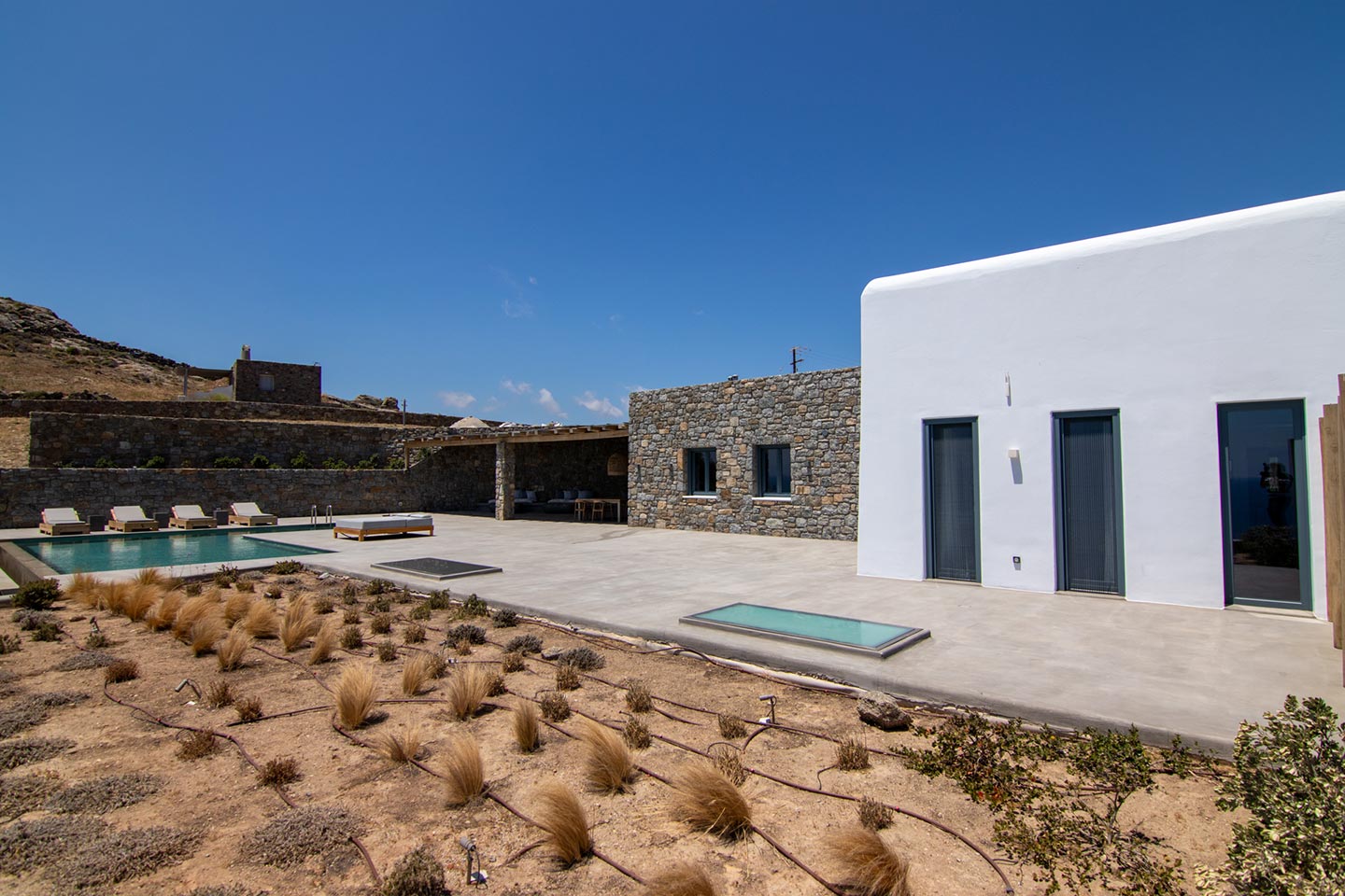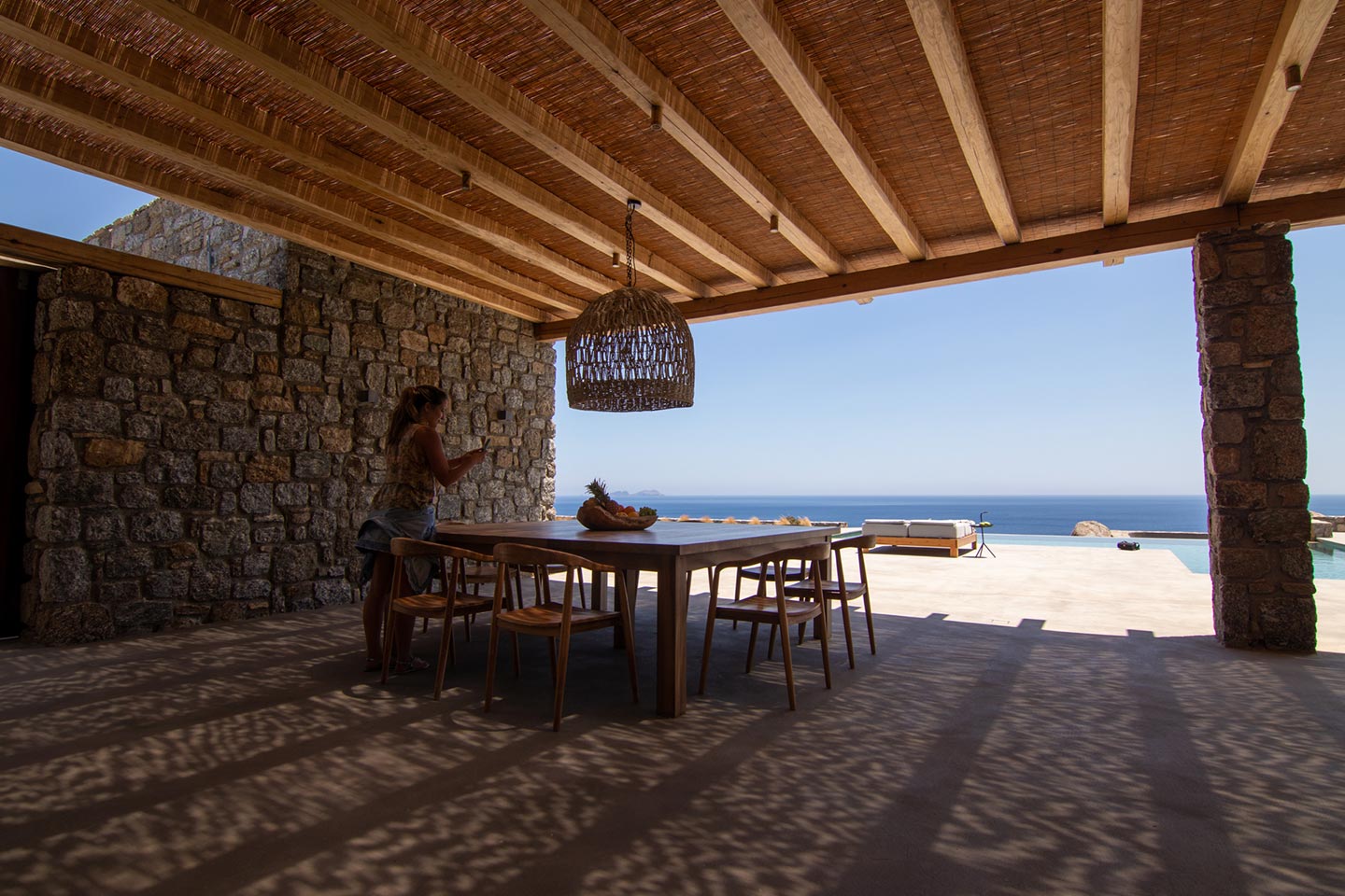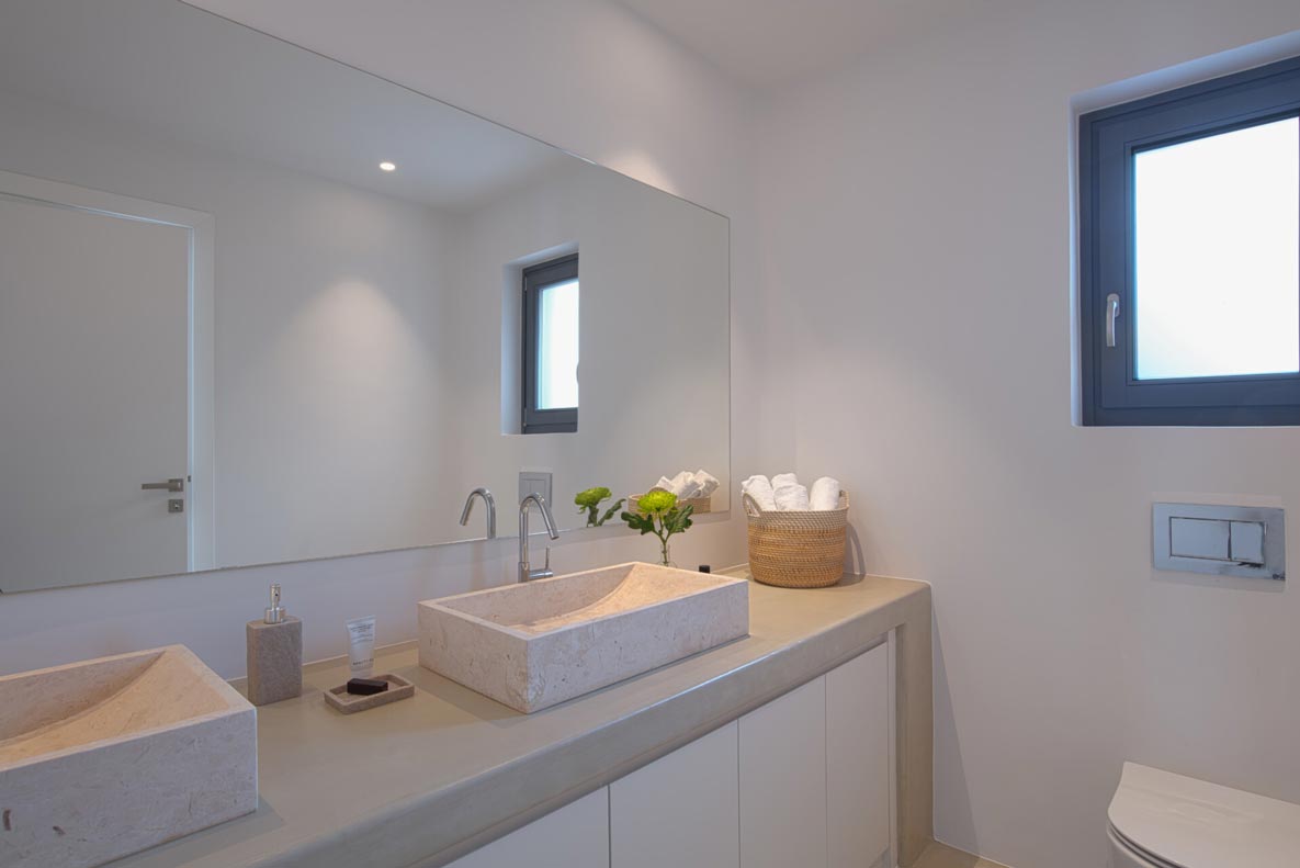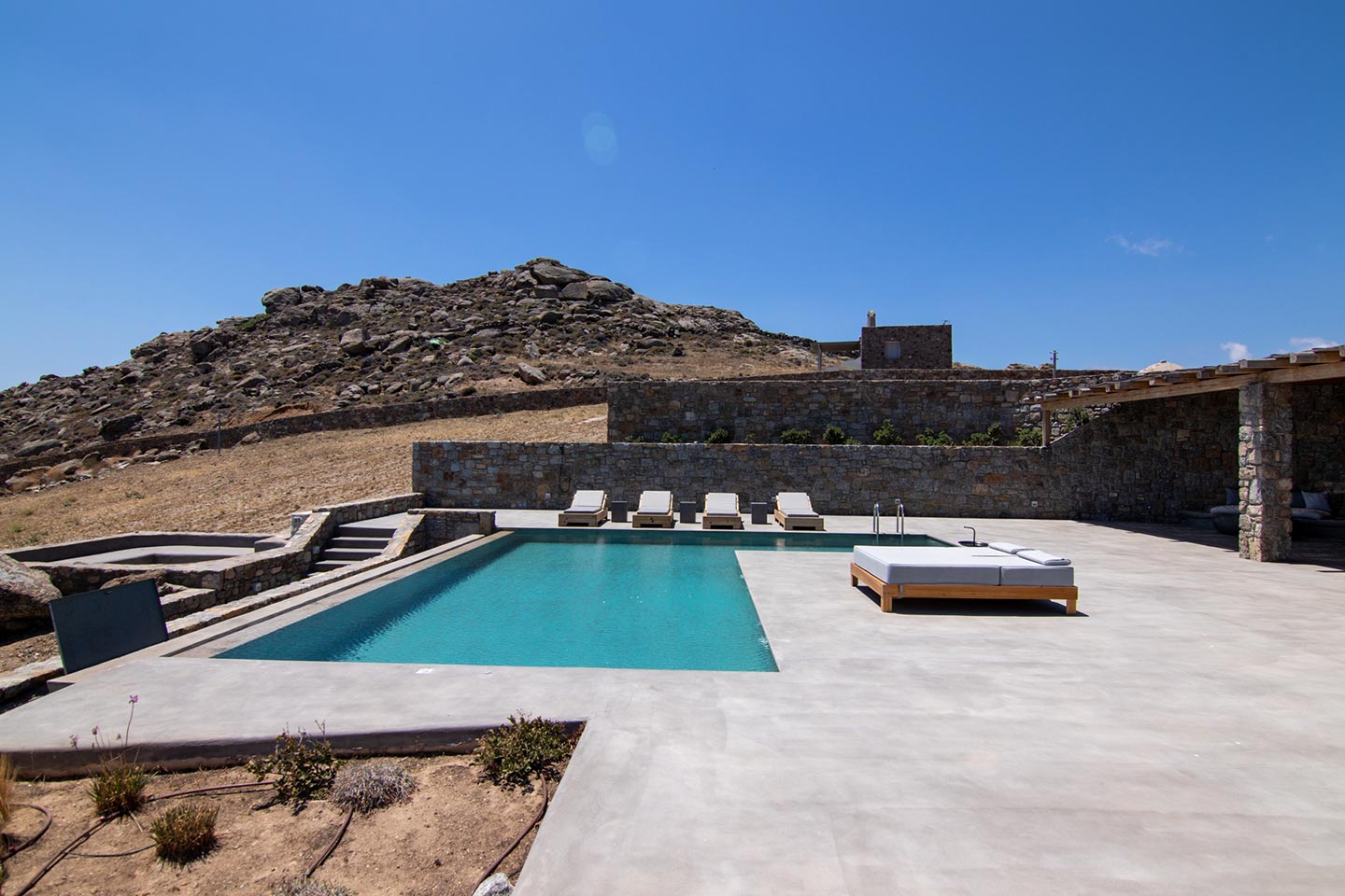 This superb, stone-clad, slab-designed, four-bedroom exclusive villa, perfectly captures Mykonos’ timeless panache. Dine like kings on spacious verandas, dip into a gorgeous infinity pool surrounded by a panoramic Aegean seascape you’ll never forget. Inside, this stylish house’s chic minimal aesthetics offer swathes of space and handcrafted woods. Gorgeous designer furniture and wicker pieces add warmth and a natural feel throughout. Sleep serenely in über-cool, en-suite bedrooms. Part of a 3-house complex where your privacy is neatly combined with glorious open-air summer living.