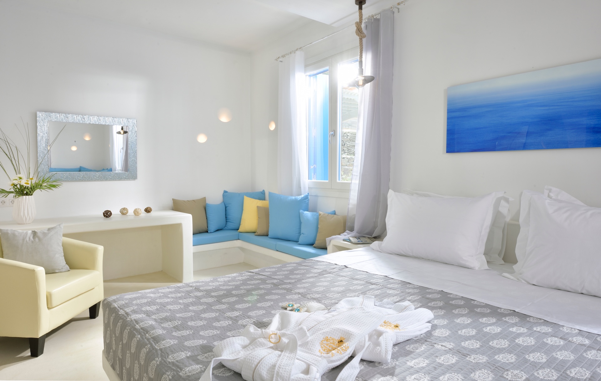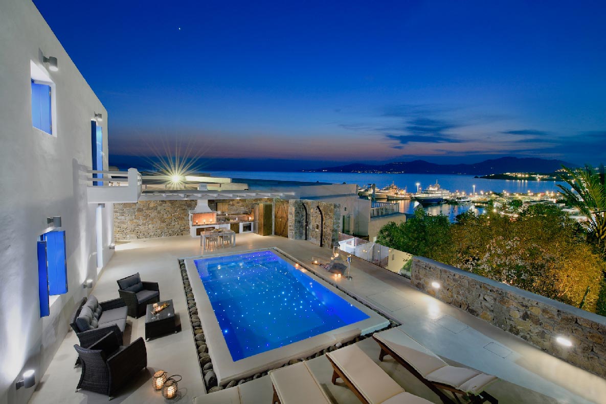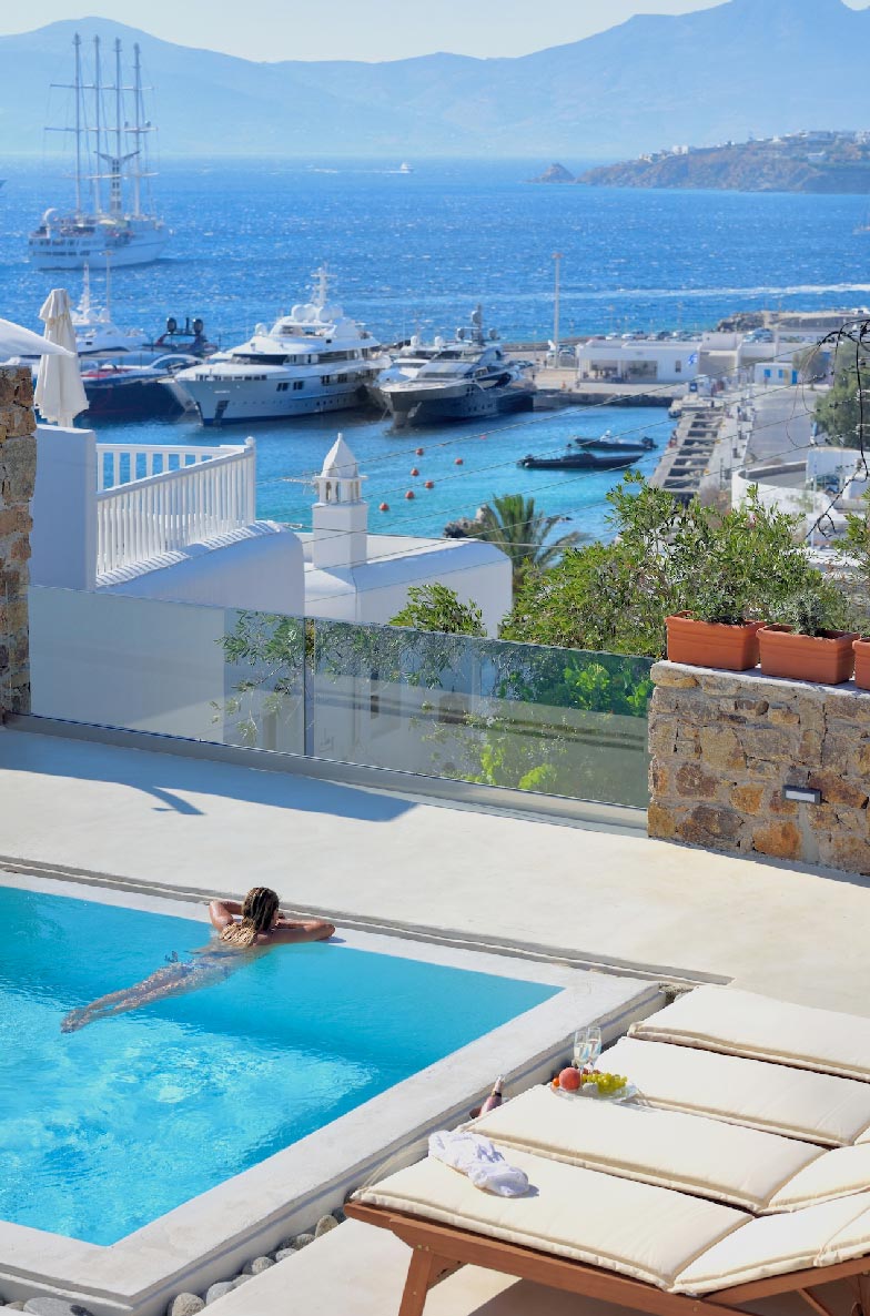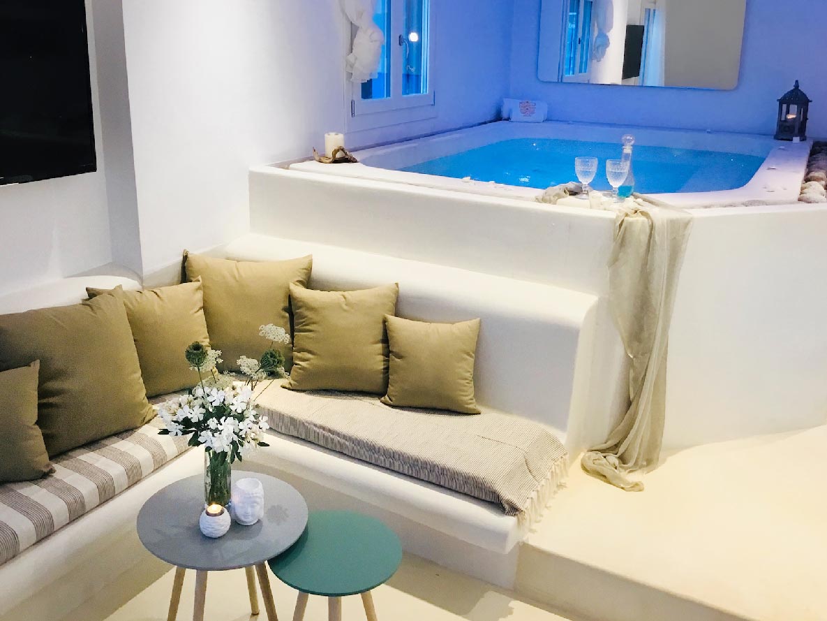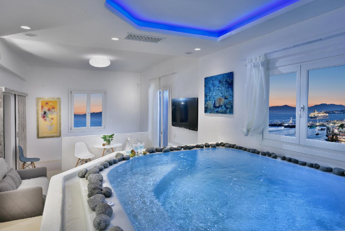 - 6 sq. m. Indoor Heated Jacuzzi with breathtaking Mykonos Town and sea views