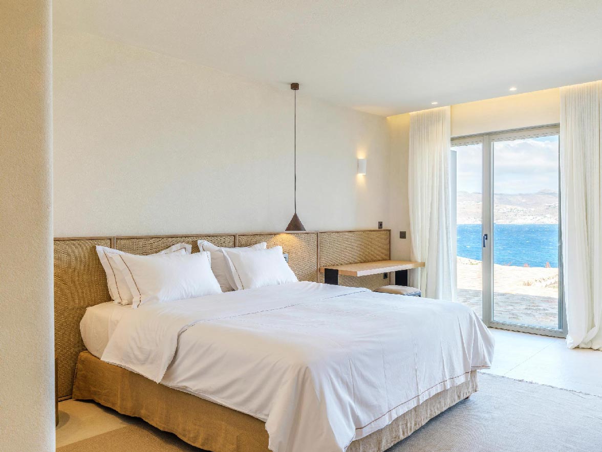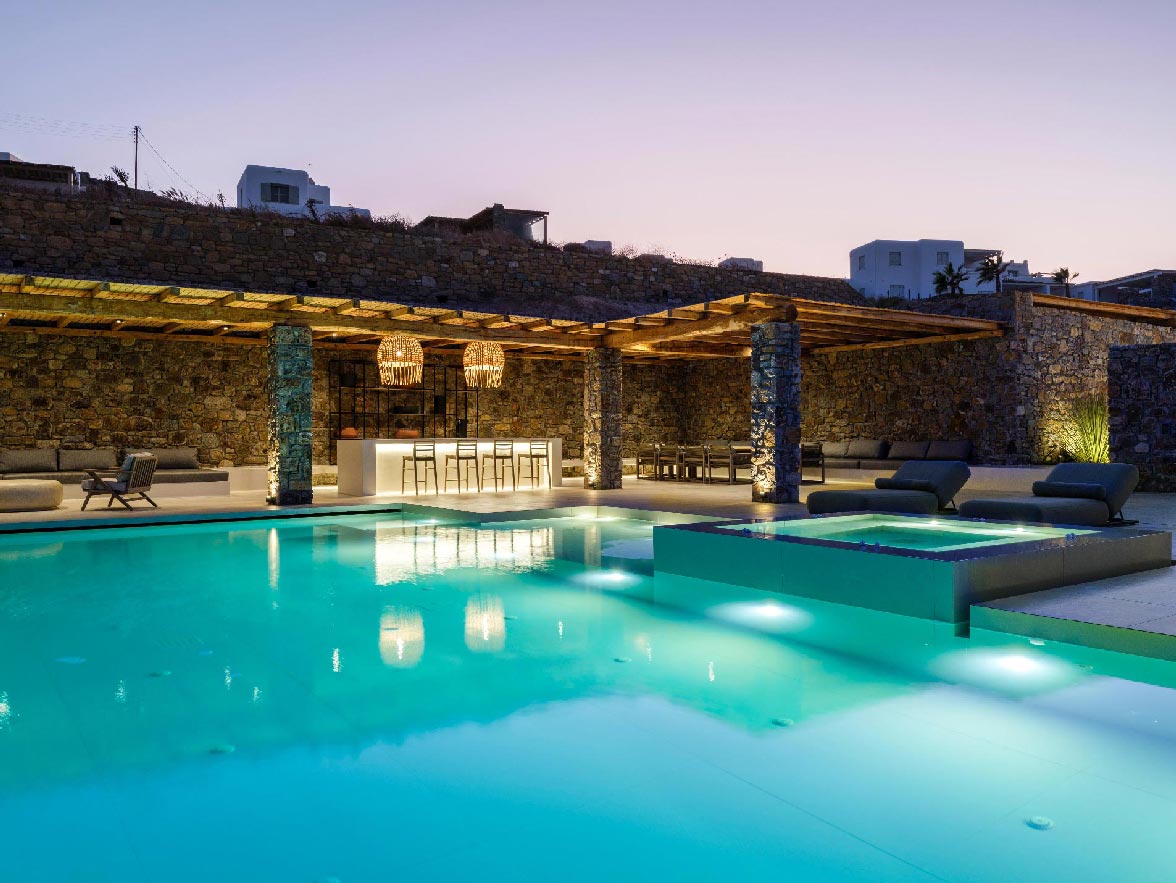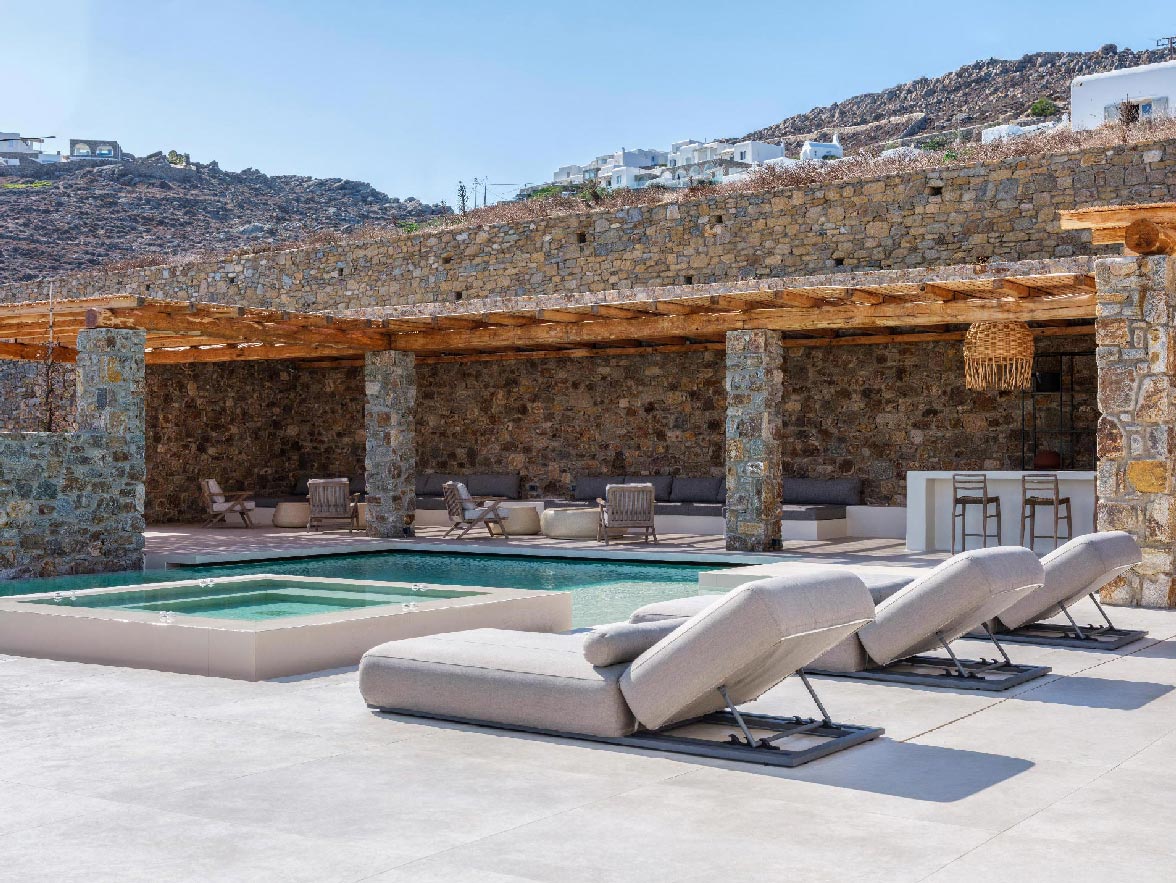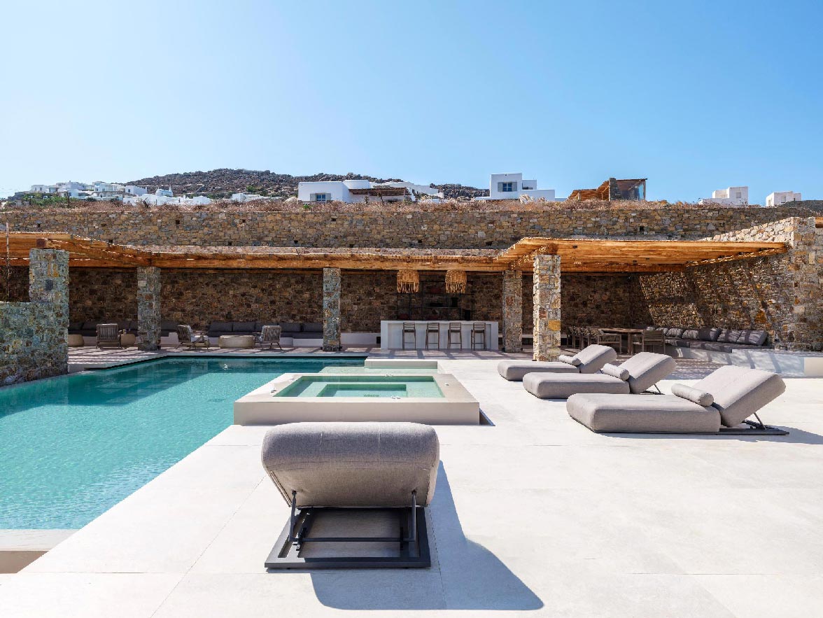 This brand new villa is a high-end property, located only a few minutes away from Ornos and Mykonos Town. The villa offers absolute privacy and proximity to all points of interest, at the same time. Away from the noise of Mykonos town, but still so close to all island facilities and nightlife. This luxurious property of 400 sq.m. expands in 3 levels and consists of 9 master bedrooms -all with luxurious beds and en suite bathrooms-, 1 WC, a spacious living room and a fully equipped kitchen. The property has a very spacious private outdoor terrace with a 100sq.m. infinity pool, well protected by the strong winds that often blow in Mykonos island.