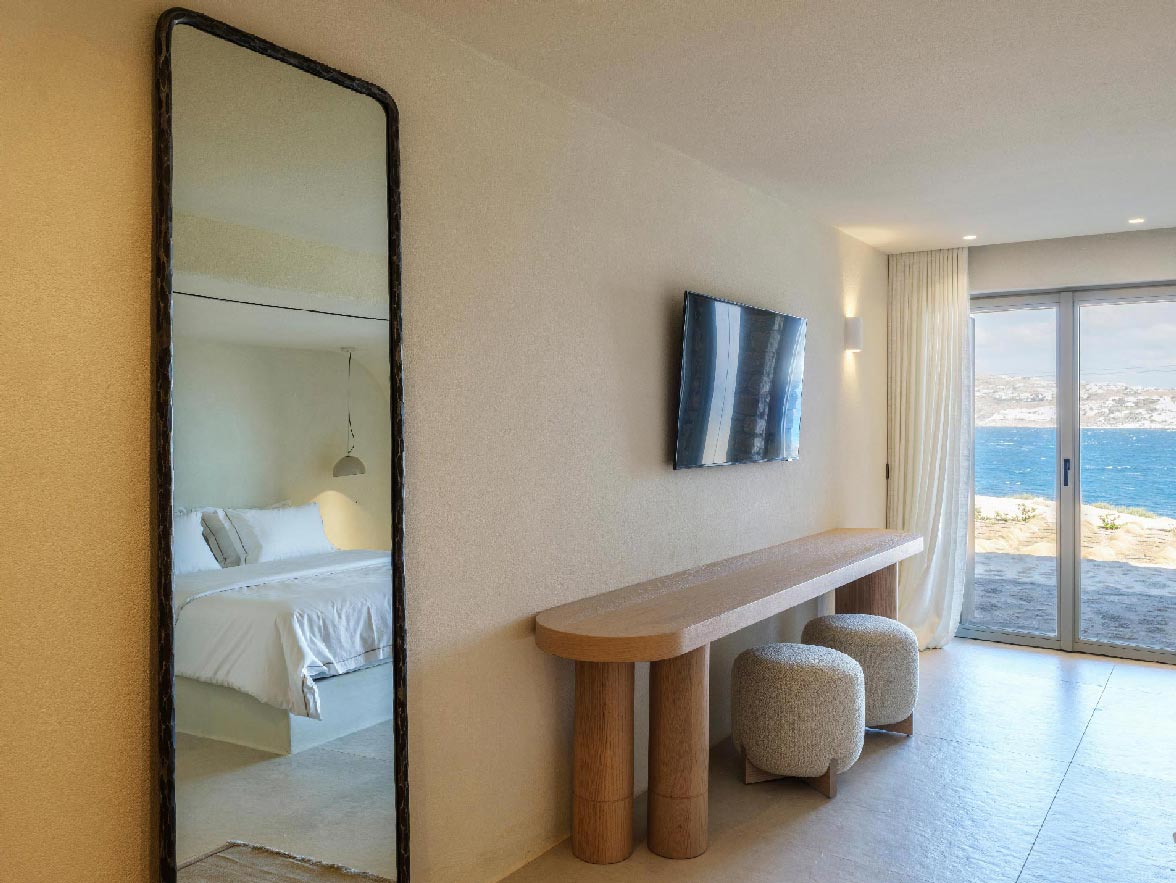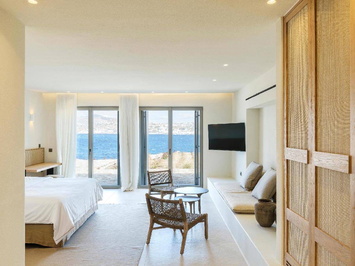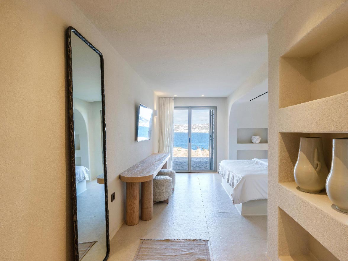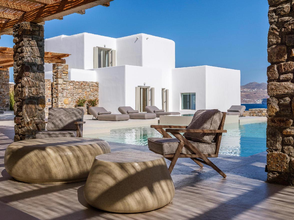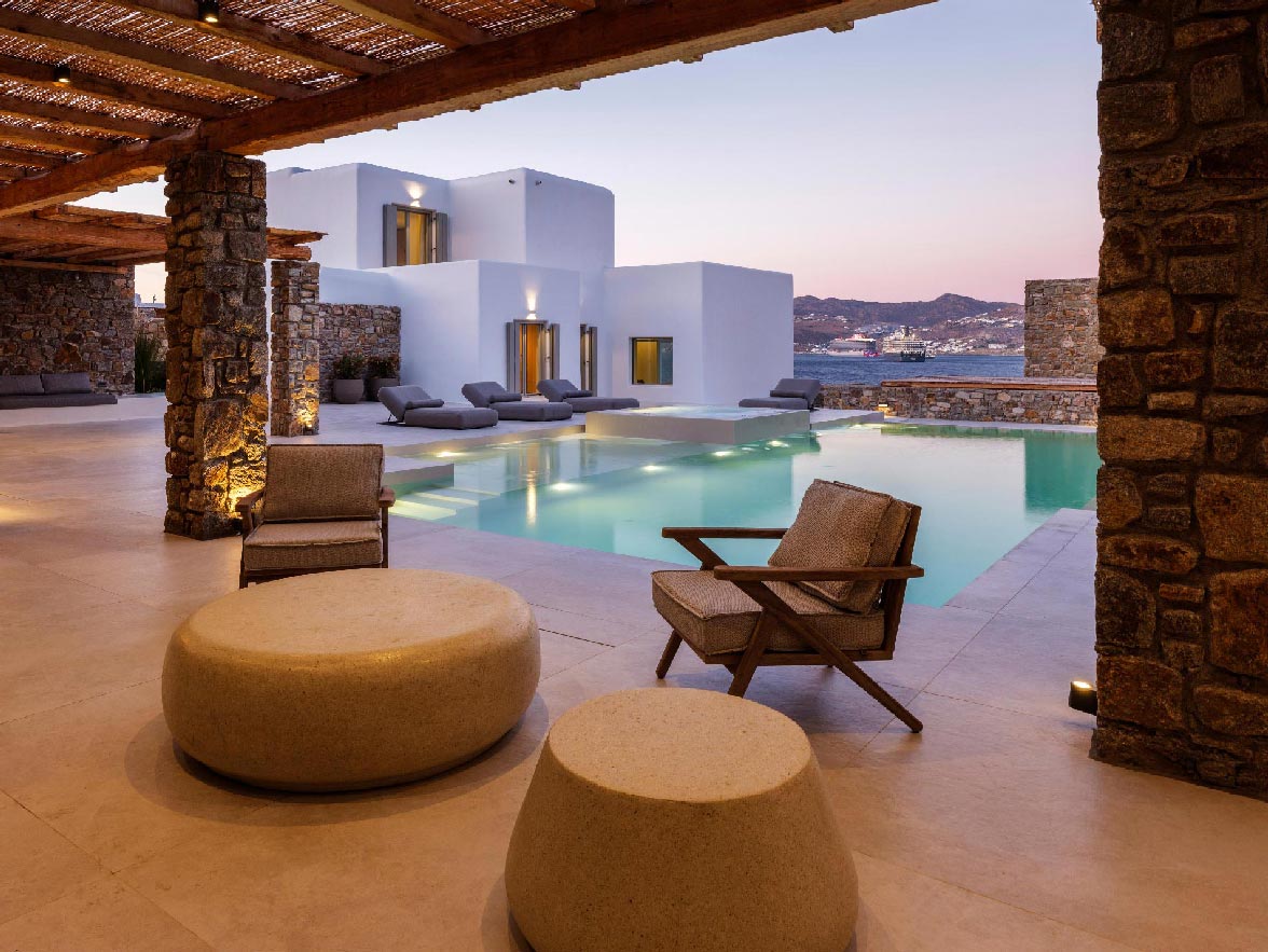 This brand new villa is a high-end property, located only a few minutes away from Ornos and Mykonos Town. The villa offers absolute privacy and proximity to all points of interest, at the same time. Away from the noise of Mykonos town, but still so close to all island facilities and nightlife. This luxurious property of 400 sq.m. expands in 3 levels and consists of 9 master bedrooms -all with luxurious beds and en suite bathrooms-, 1 WC, a spacious living room and a fully equipped kitchen. The property has a very spacious private outdoor terrace with a 100sq.m. infinity pool, well protected by the strong winds that often blow in Mykonos island.