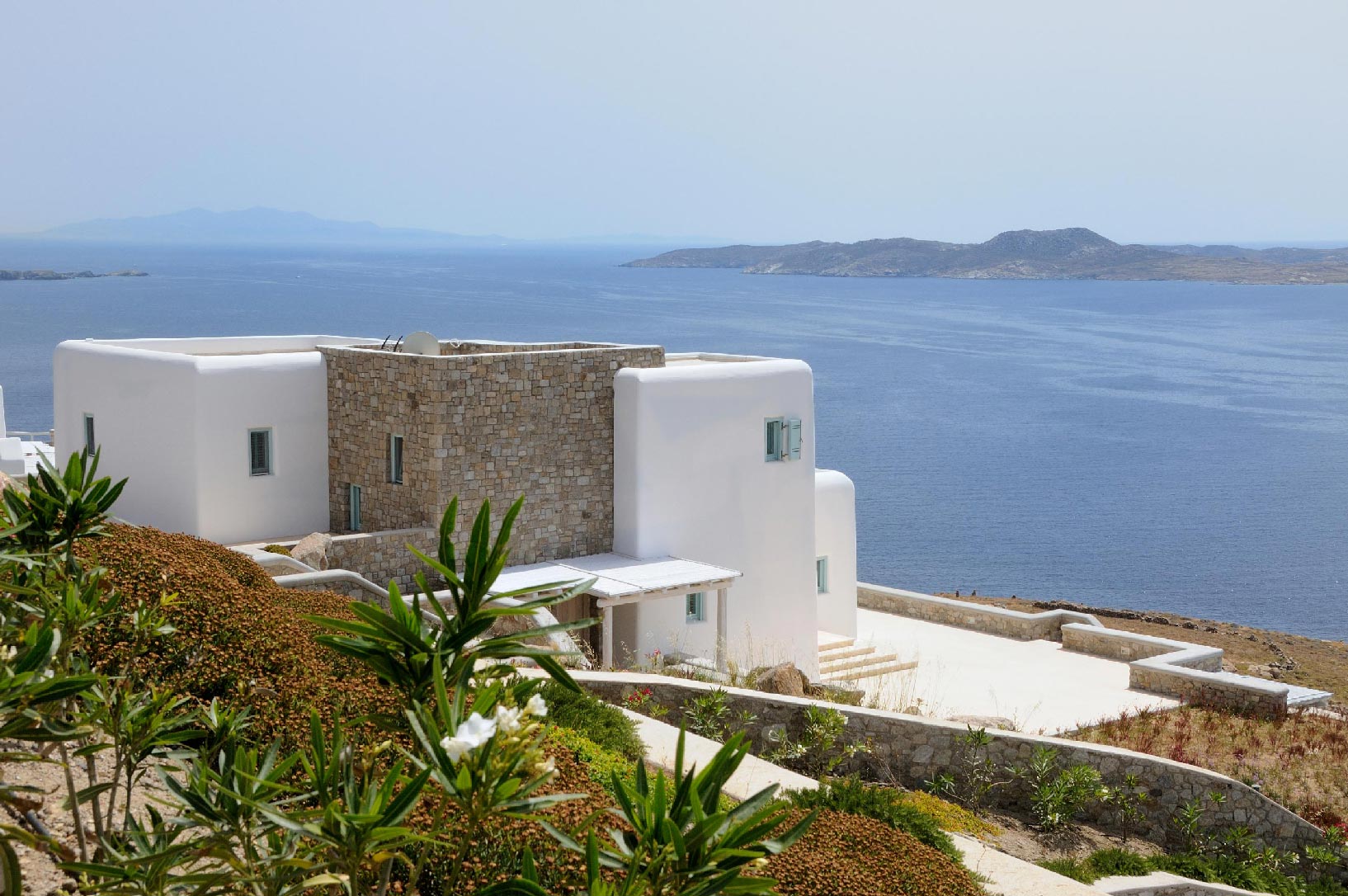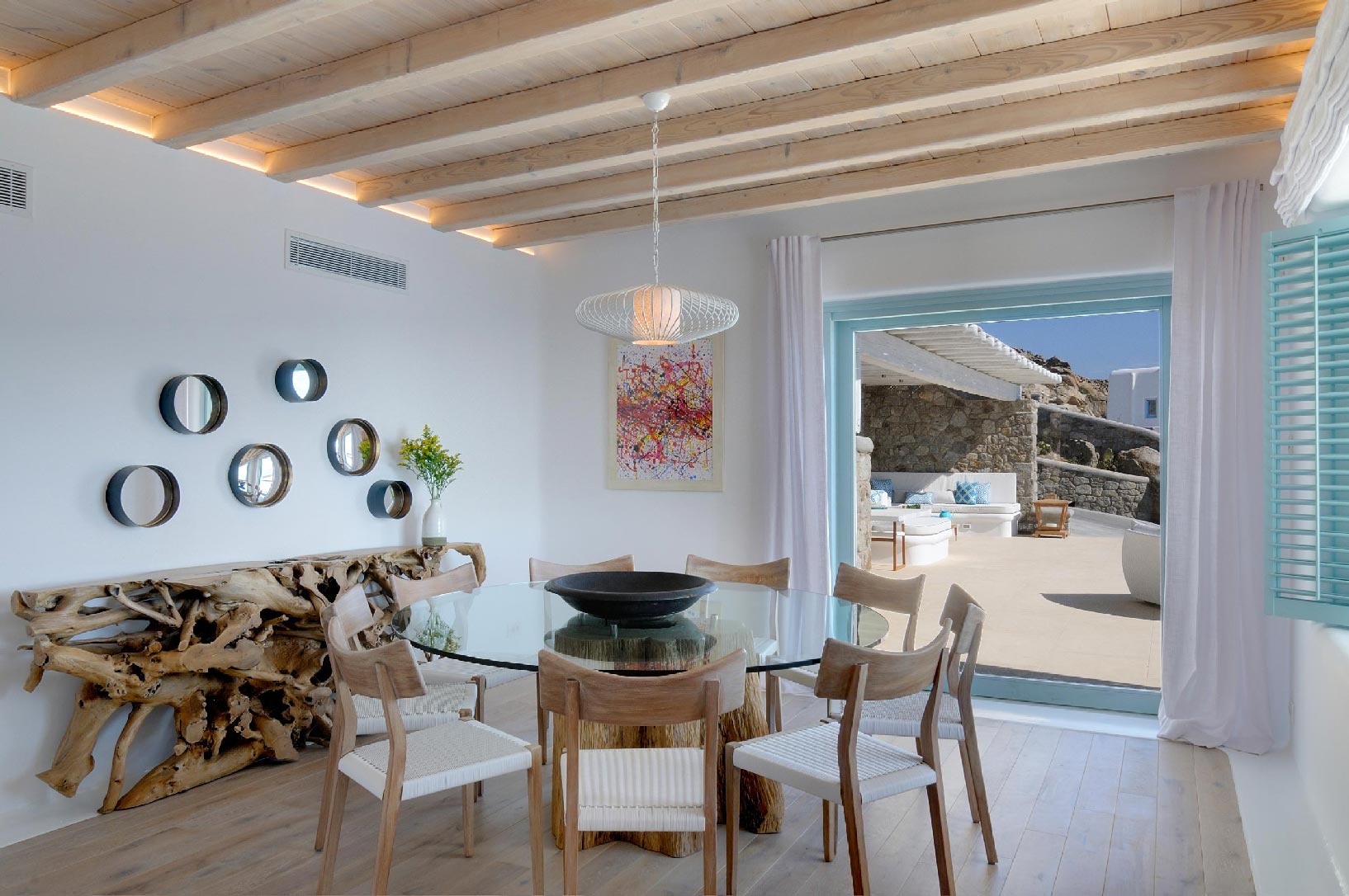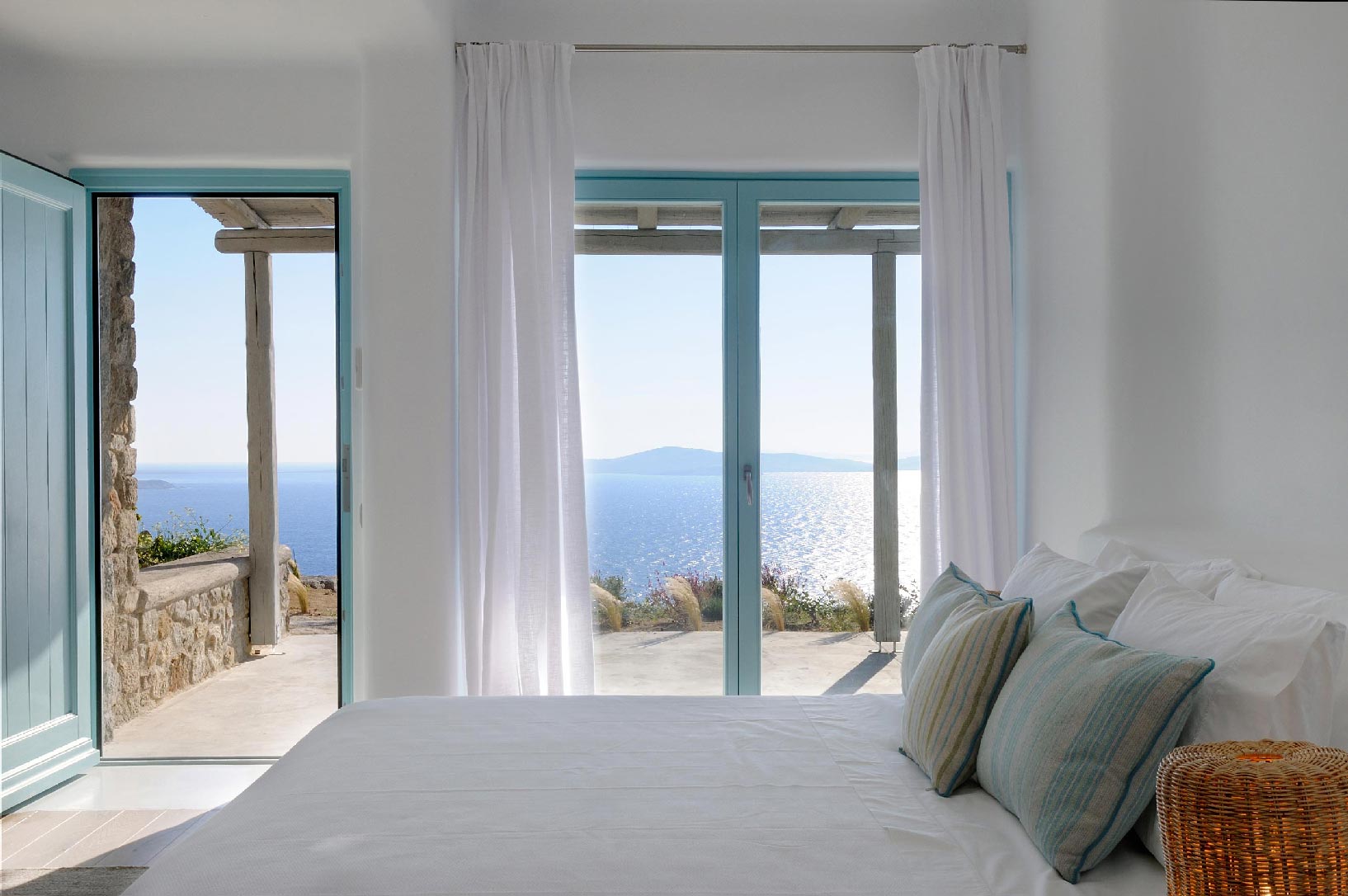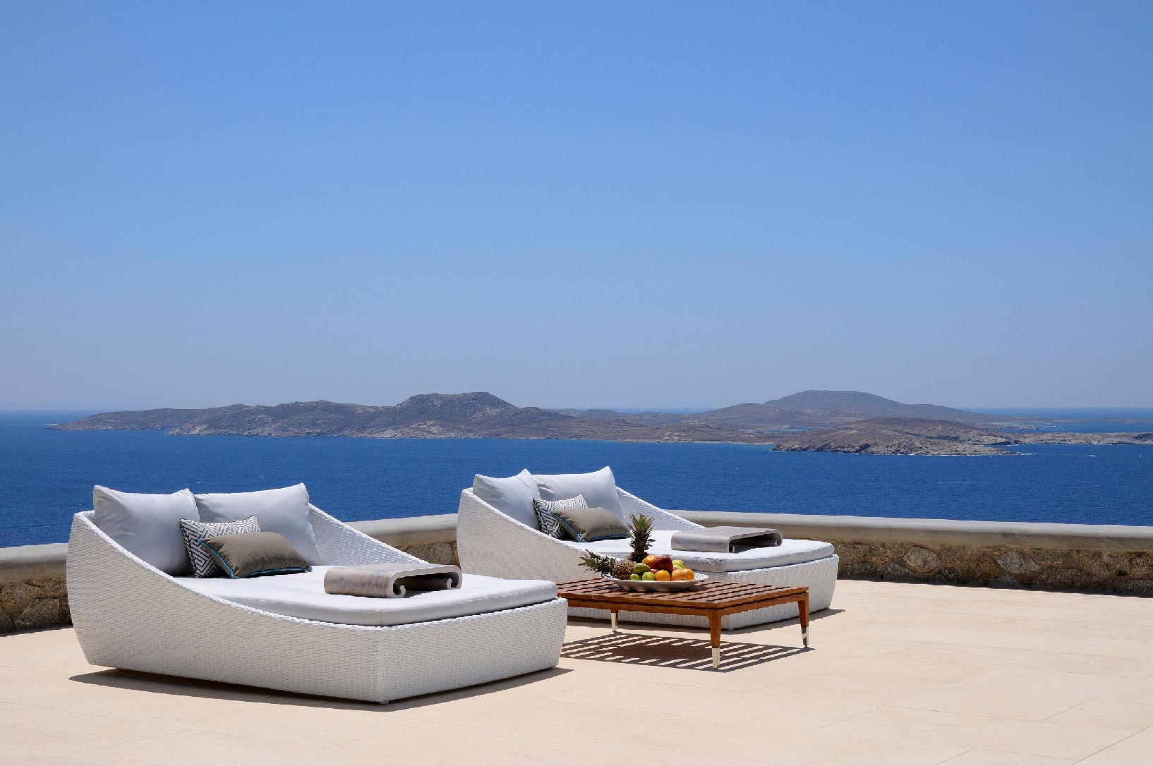 Villa Iro consists of 9 en-suite bedrooms with marvelous views of picturesque Delos and Rhenia islands and enviable island living harmoniously merge into a stunning home that embraces its residents.The stunning views of Delos and Rhenia are perfectly matched by whitewashed architectural elements and natural stone walls. The built-in dining area and lounge offers an inviting respite as the dappled sunlight plays through the bamboo awning, and the infinity pool acts like your private extension of the sea.