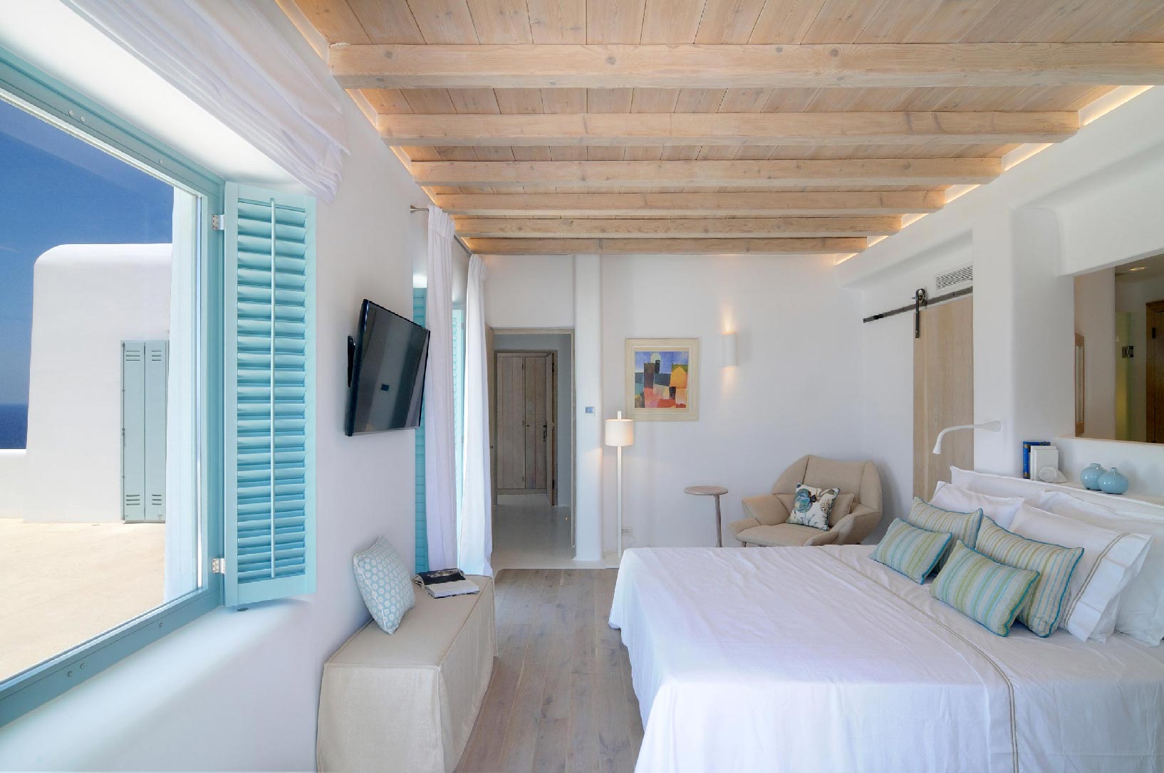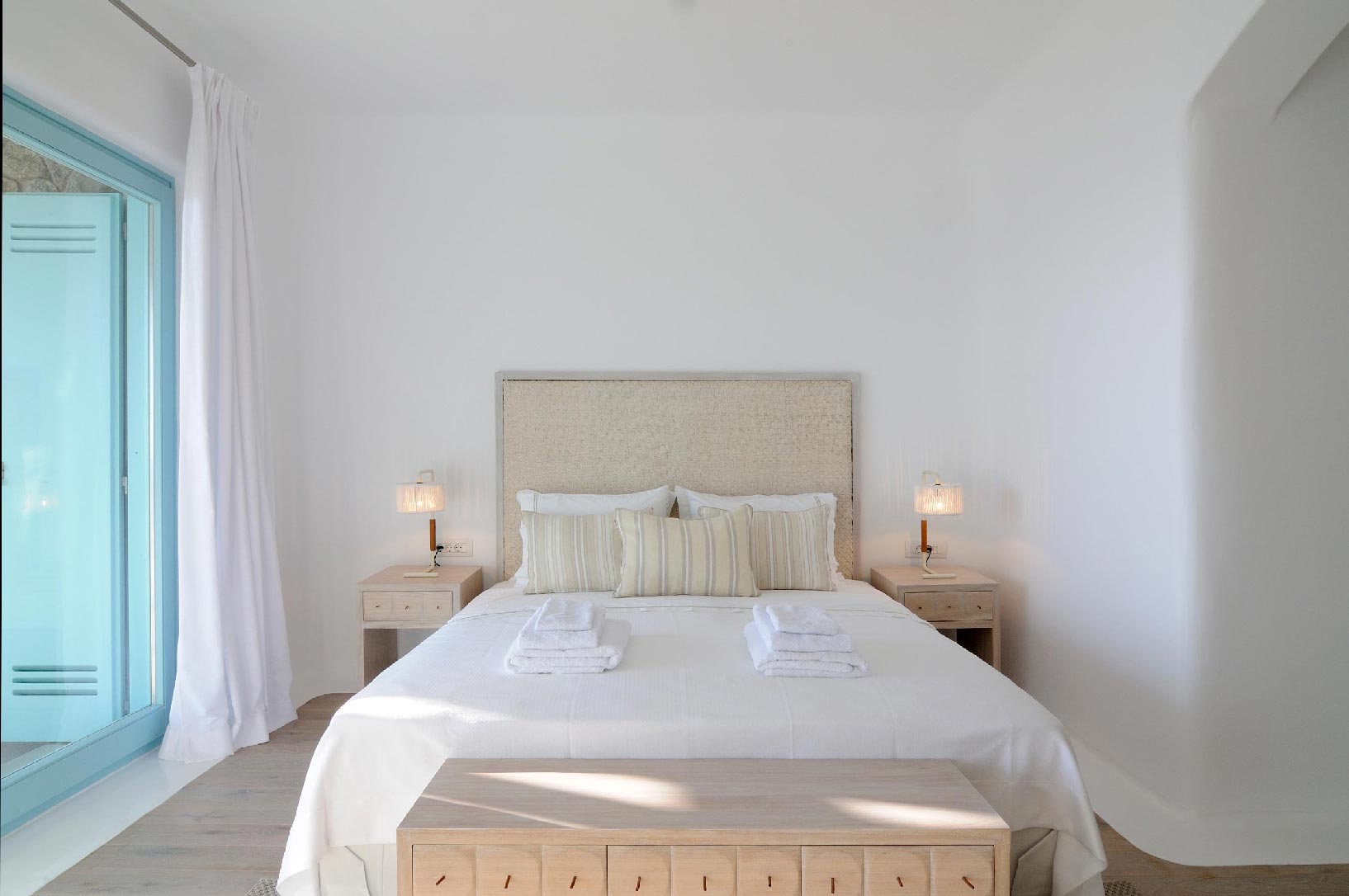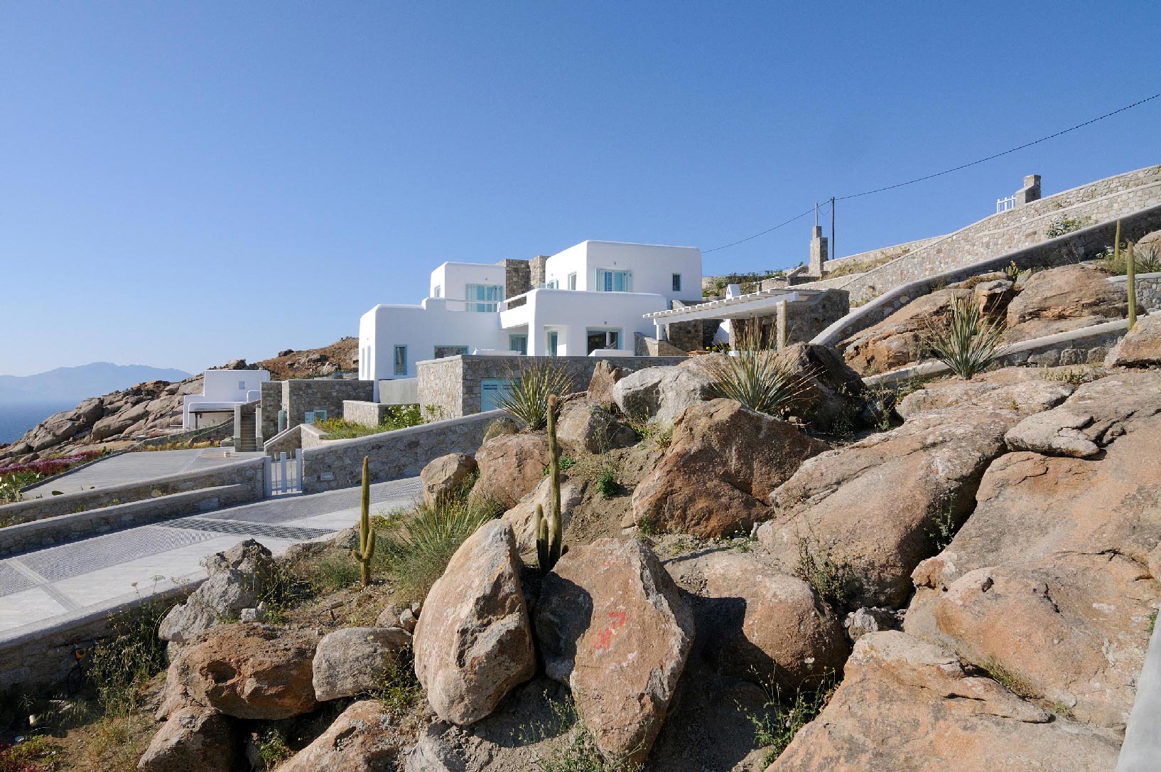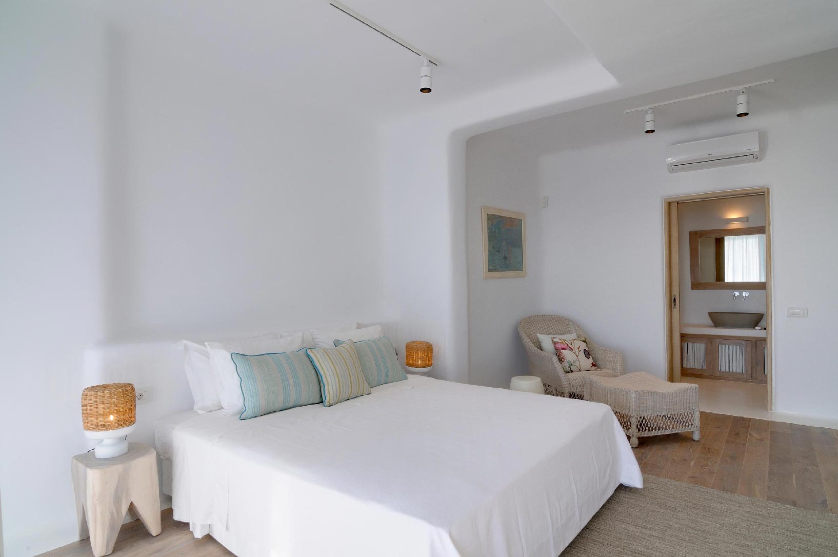 Villa Iro consists of 9 en-suite bedrooms with marvelous views of picturesque Delos and Rhenia islands and enviable island living harmoniously merge into a stunning home that embraces its residents.The stunning views of Delos and Rhenia are perfectly matched by whitewashed architectural elements and natural stone walls. The built-in dining area and lounge offers an inviting respite as the dappled sunlight plays through the bamboo awning, and the infinity pool acts like your private extension of the sea.