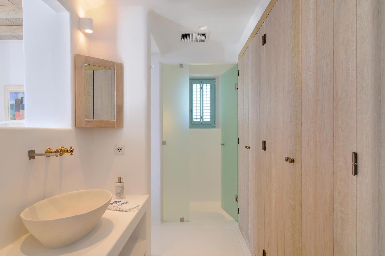 A master bedroom with en suite bathroom (shower & toilet room, king size bed, A/C, TV, safe box, terrace access, sea view), and a double room with en suite bathroom (shower, double bed, TV, A/C, safe box, terrace access, sea view).