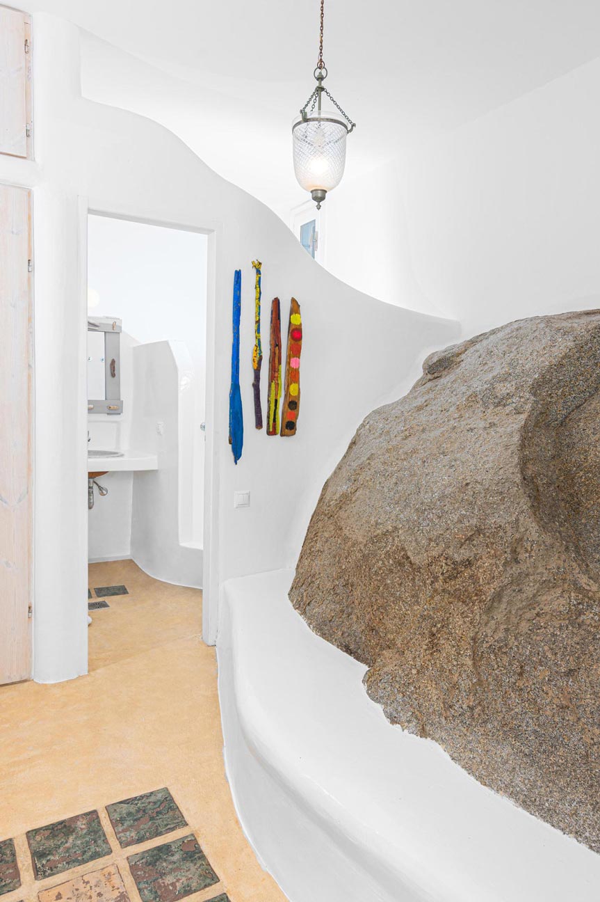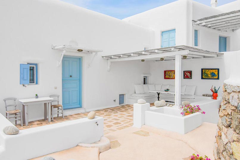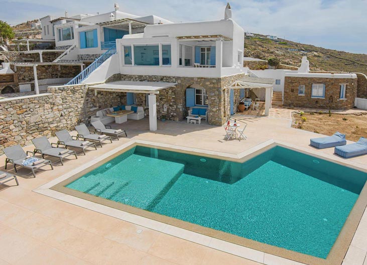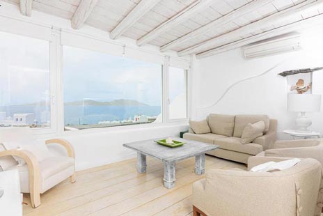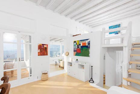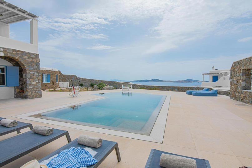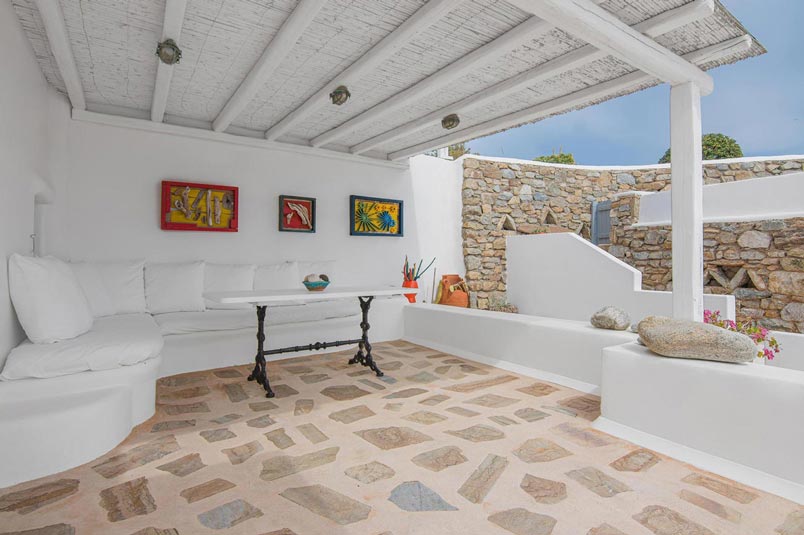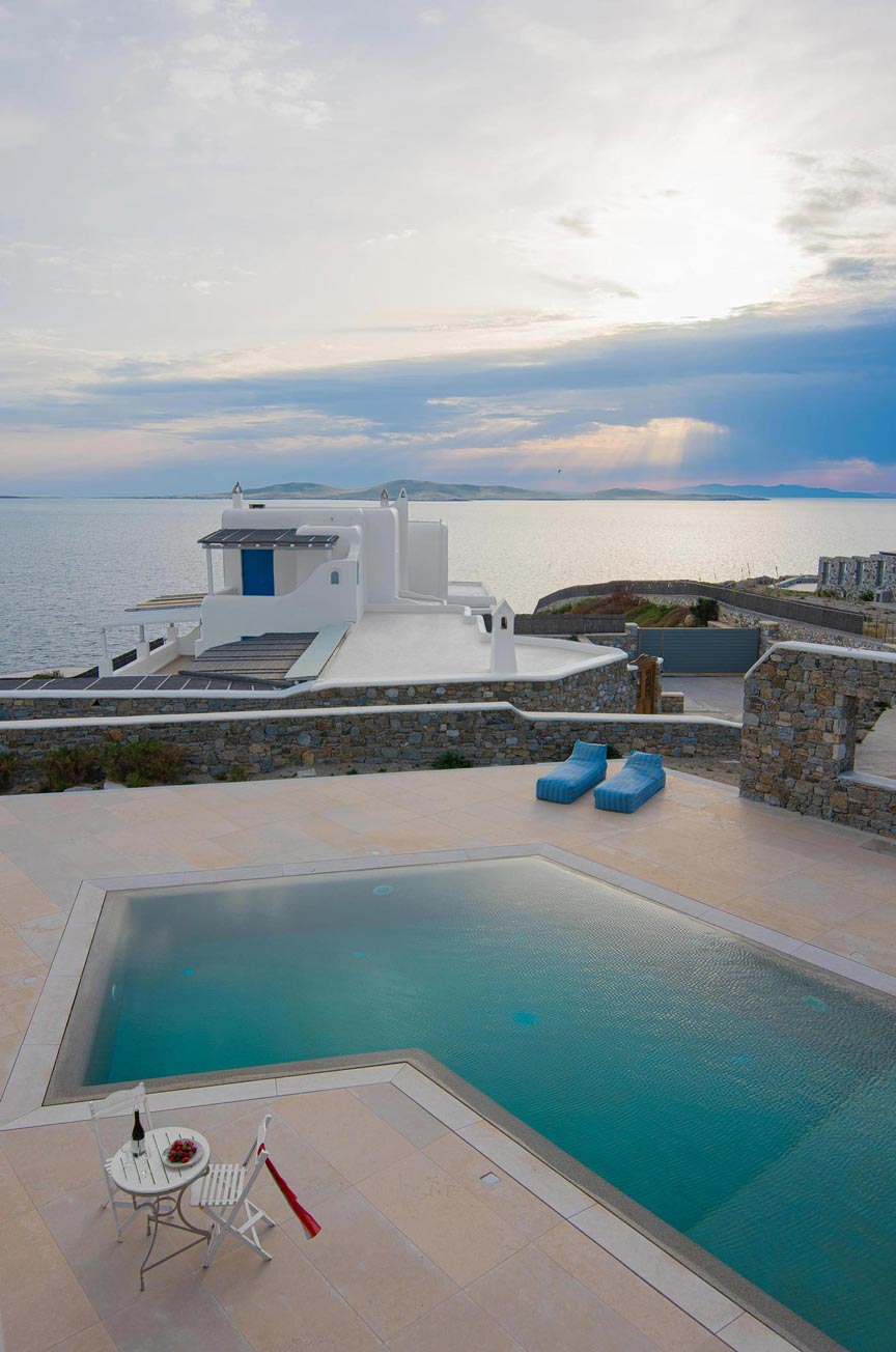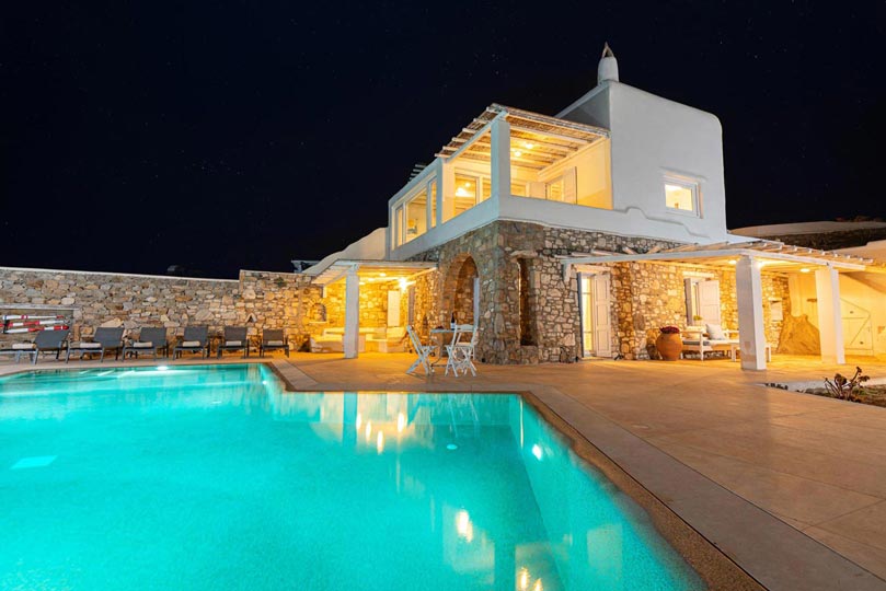 One of the most elegant properties on the island. Located atop Pouli hill in Kanalia area, one of the most famous spots in Mykonos, the villa offers charming outdoor spaces with sensational sunset views over the Aegean Sea and the tiny island of Delos. Its location is ideal for those that want to enjoy a romantic setting while at the same time being near some of the most popular beaches of Mykonos like Agios Ioannis beach and Ornos beach.