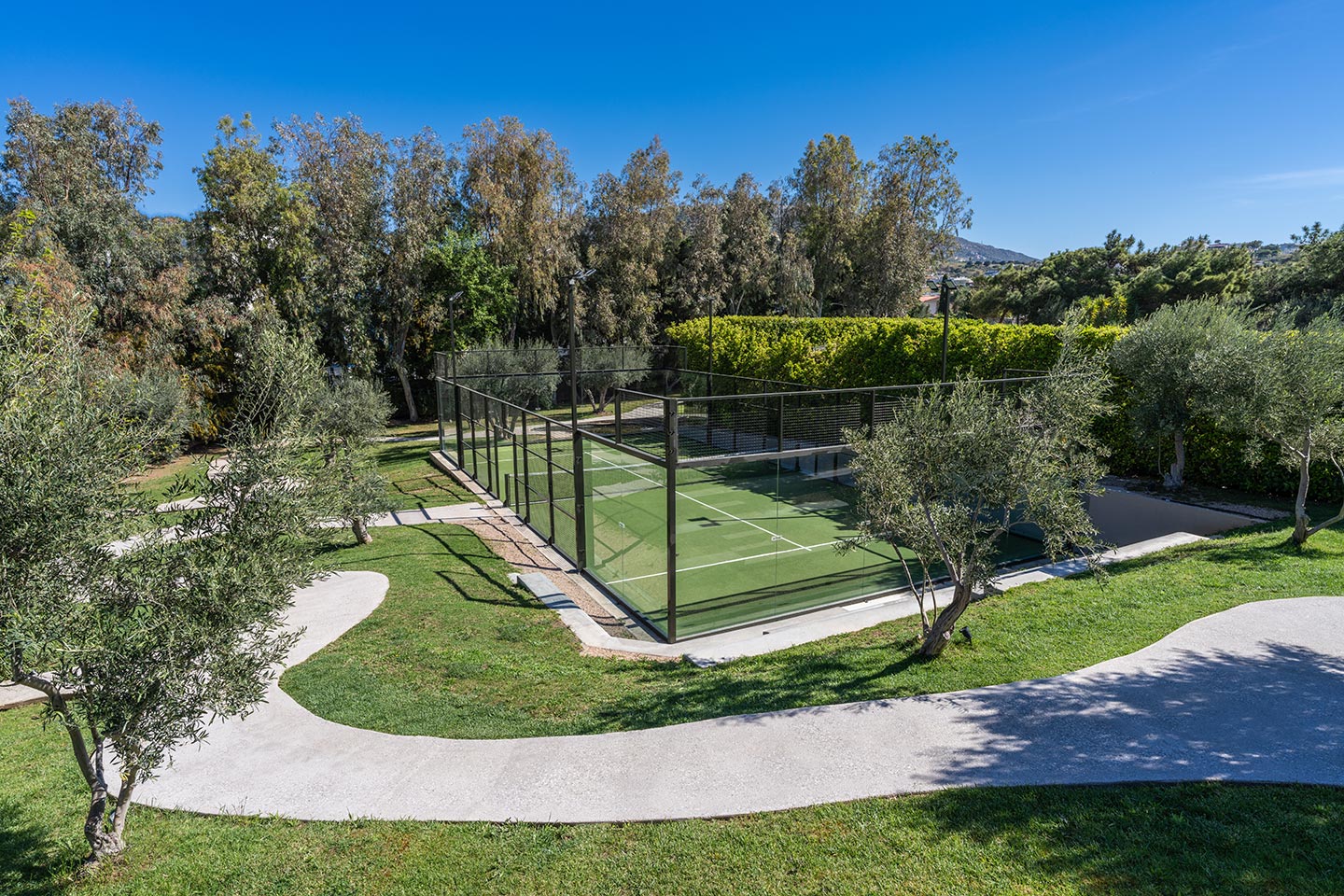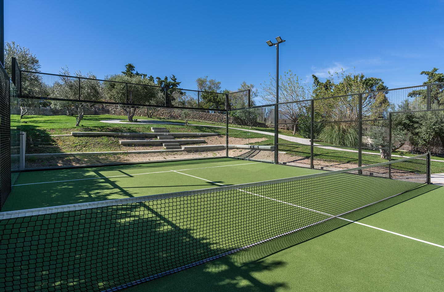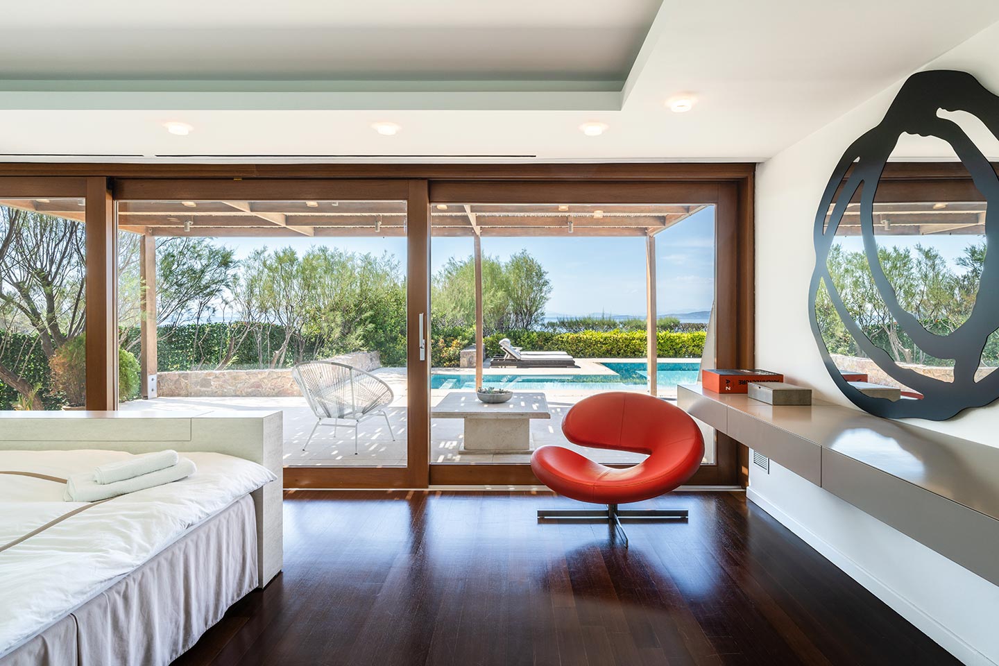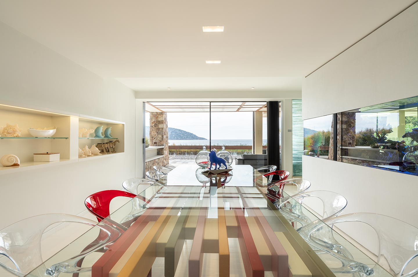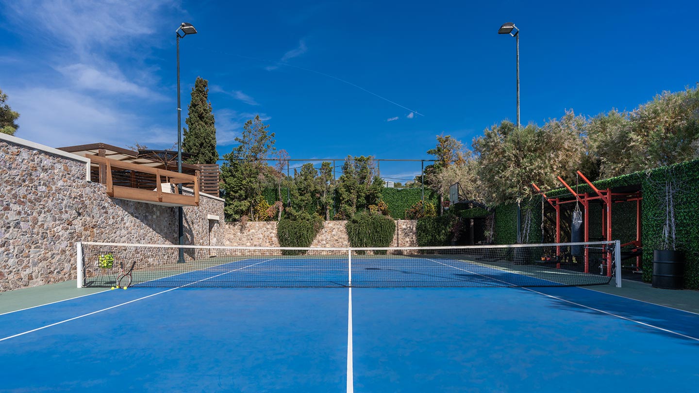 This spacious villa accommodates up to 14 guests across 7 beautifully designed bedrooms (5 in the main house and 2 in separate guesthouses). Ideal for families, groups, or multi-generational stays, it offers the perfect balance of private comfort and open, shared spaces. The villa boasts two private pools, expansive terraces for al fresco dining, and direct access to a secluded beach, offering guests the ultimate in relaxation and outdoor living. The panoramic views of the Aegean Sea and lush landscapes create a stunning backdrop for every occasion. For those seeking an active getaway, the villa features a tennis court, padel court, and a mini soccer field, ensuring that guests of all interests are well catered for. Whether it’s a friendly match or a leisurely day by the pool, the villa offers the perfect setting for both relaxation and recreation. The villa’s interiors are a blend of postmodern sophistication and playful 70s and pop art-inspired design. High-end materials such as stone, wood, and metal are combined with vibrant décor to create a visually captivating environment that encourages both relaxation and creative expression.