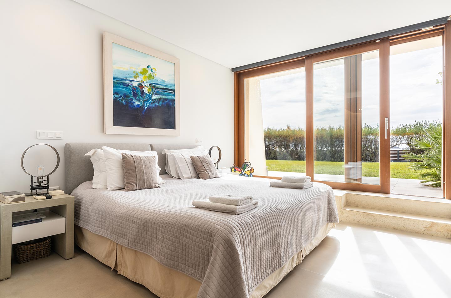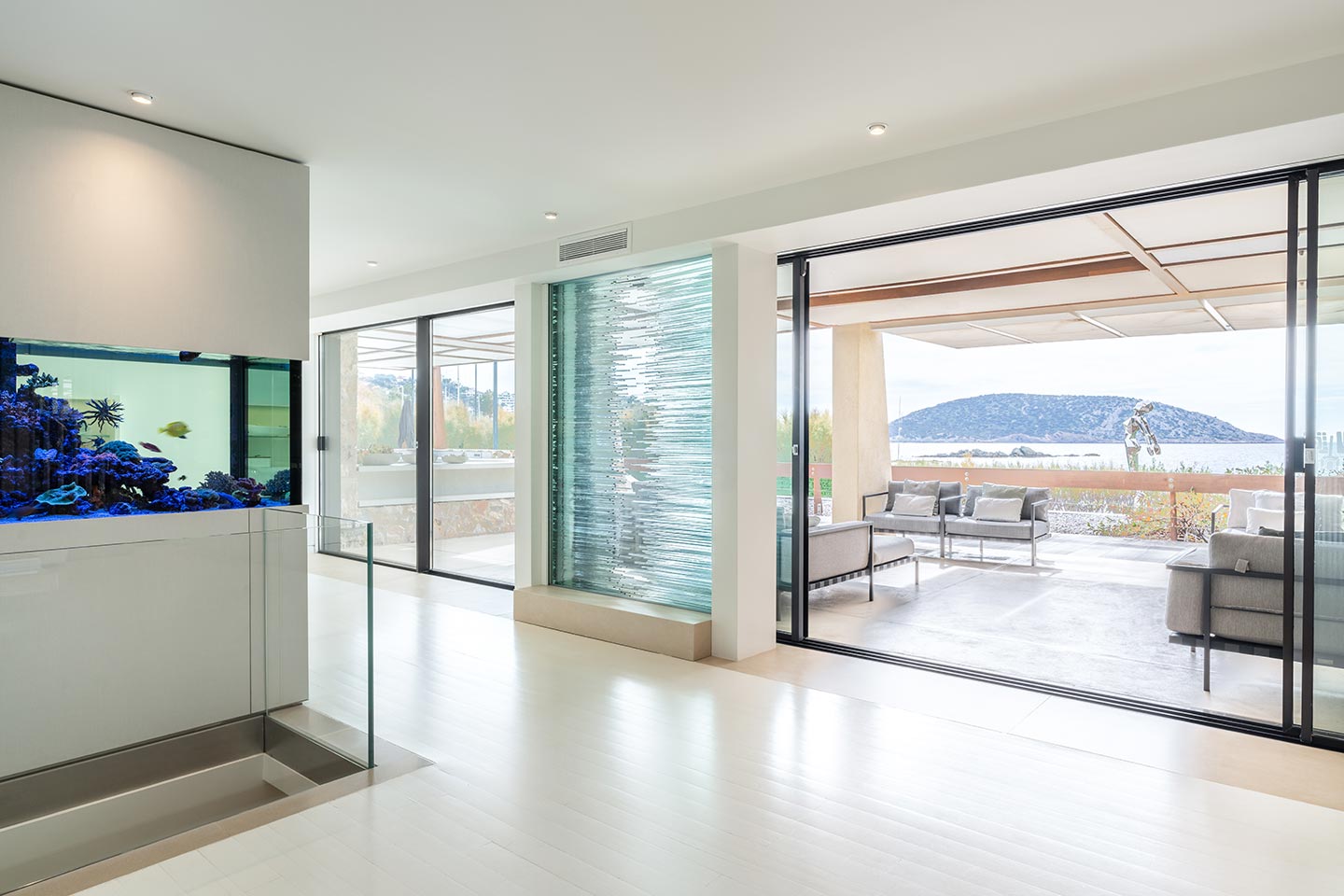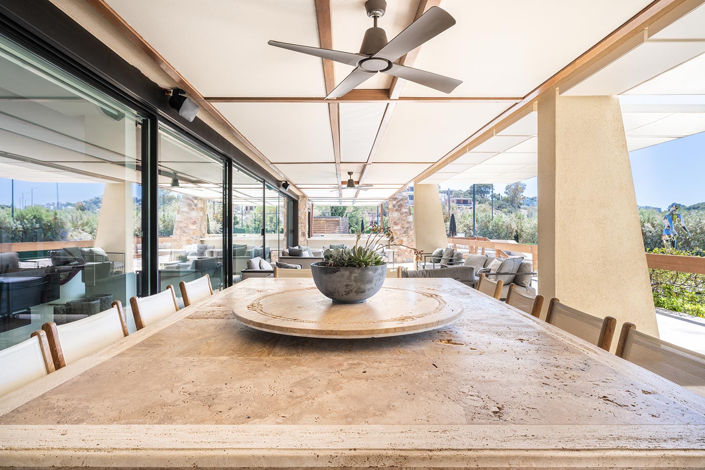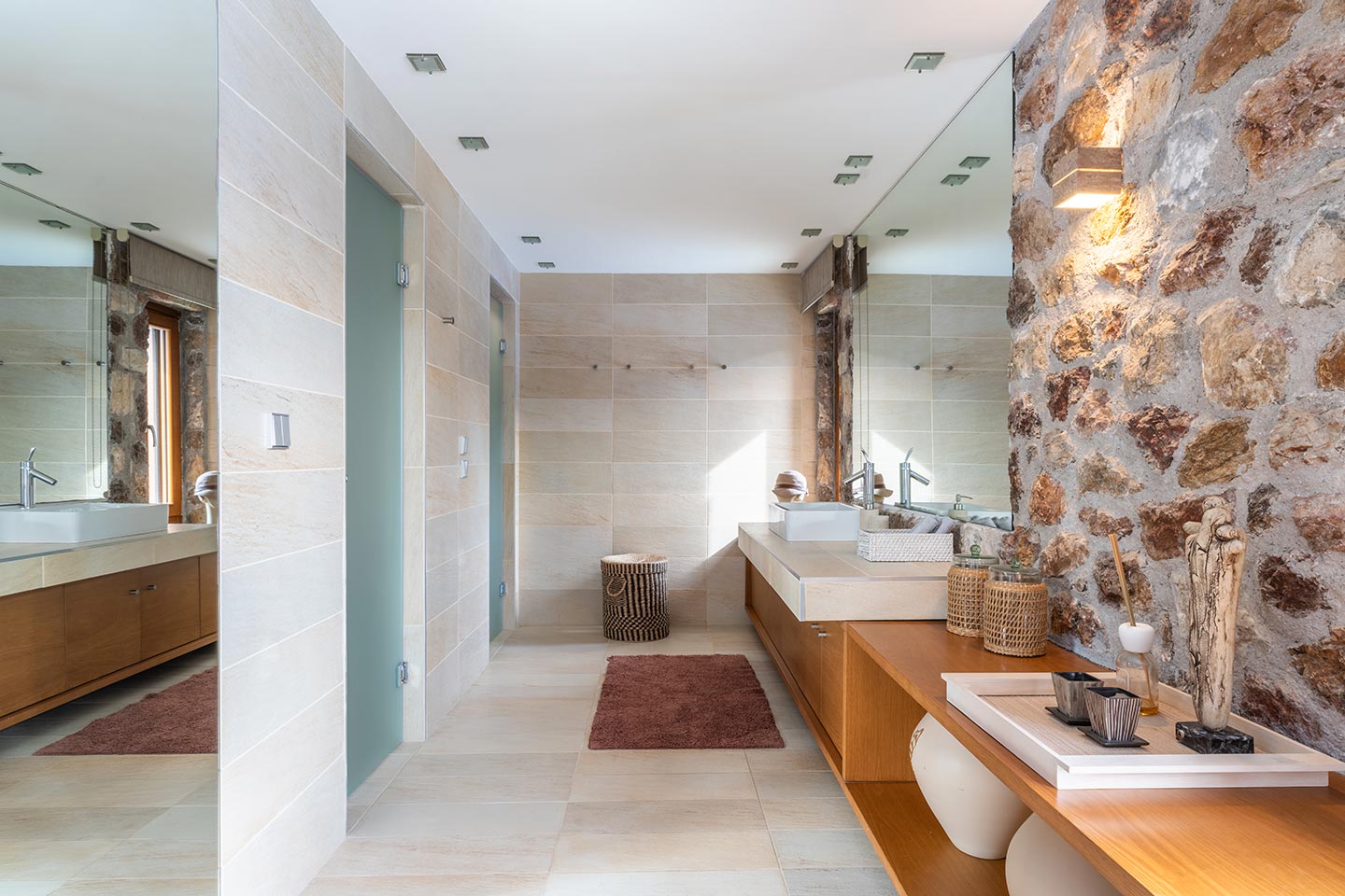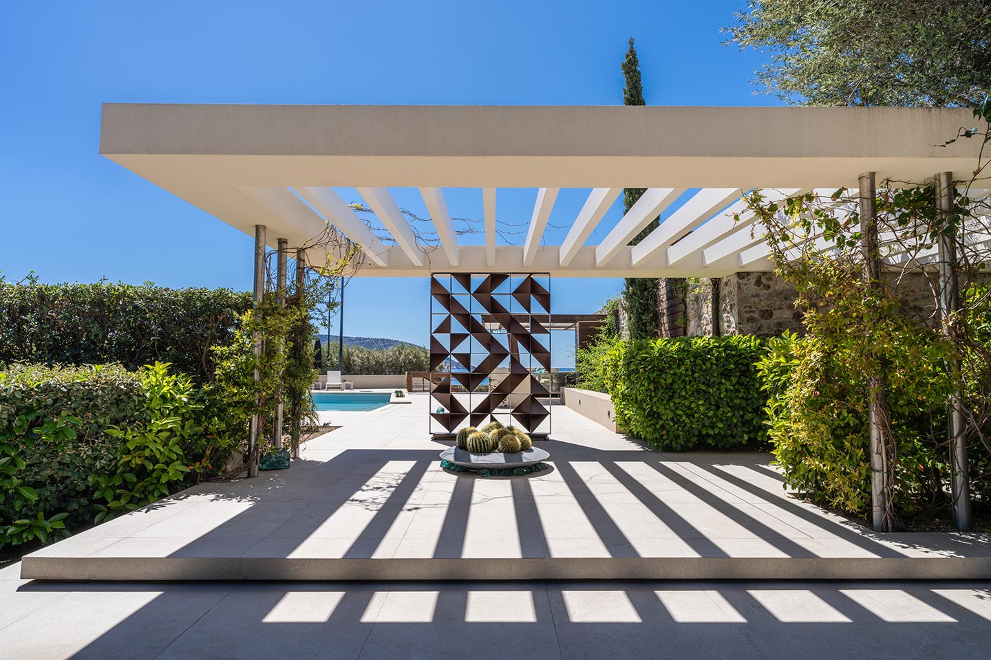 This spacious villa accommodates up to 14 guests across 7 beautifully designed bedrooms (5 in the main house and 2 in separate guesthouses). Ideal for families, groups, or multi-generational stays, it offers the perfect balance of private comfort and open, shared spaces. The villa boasts two private pools, expansive terraces for al fresco dining, and direct access to a secluded beach, offering guests the ultimate in relaxation and outdoor living. The panoramic views of the Aegean Sea and lush landscapes create a stunning backdrop for every occasion. For those seeking an active getaway, the villa features a tennis court, padel court, and a mini soccer field, ensuring that guests of all interests are well catered for. Whether it’s a friendly match or a leisurely day by the pool, the villa offers the perfect setting for both relaxation and recreation. The villa’s interiors are a blend of postmodern sophistication and playful 70s and pop art-inspired design. High-end materials such as stone, wood, and metal are combined with vibrant décor to create a visually captivating environment that encourages both relaxation and creative expression.