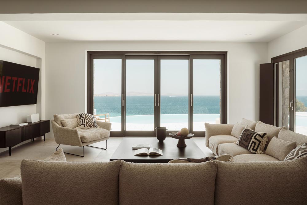 The magnificent Villa Lila is an exceptional and rare jewel on the island of Mykonos. It is located in Aleomandra facing Delos and its colorful sunsets. The construction and architecture of the villa is a flawless combination of modern and traditional Mykonian style. The house is surrounded by a very spacious white-stone terrace and a superb huge pond-style waterfront infinity pool. Various terraces and relaxation areas embrace the property. In the pool, the beautiful marble deck with comfortable sun-chairs promises a relaxing morning. The spacious outdoor dining and BBQ area are perfect for cocktail parties and open-air dinners.