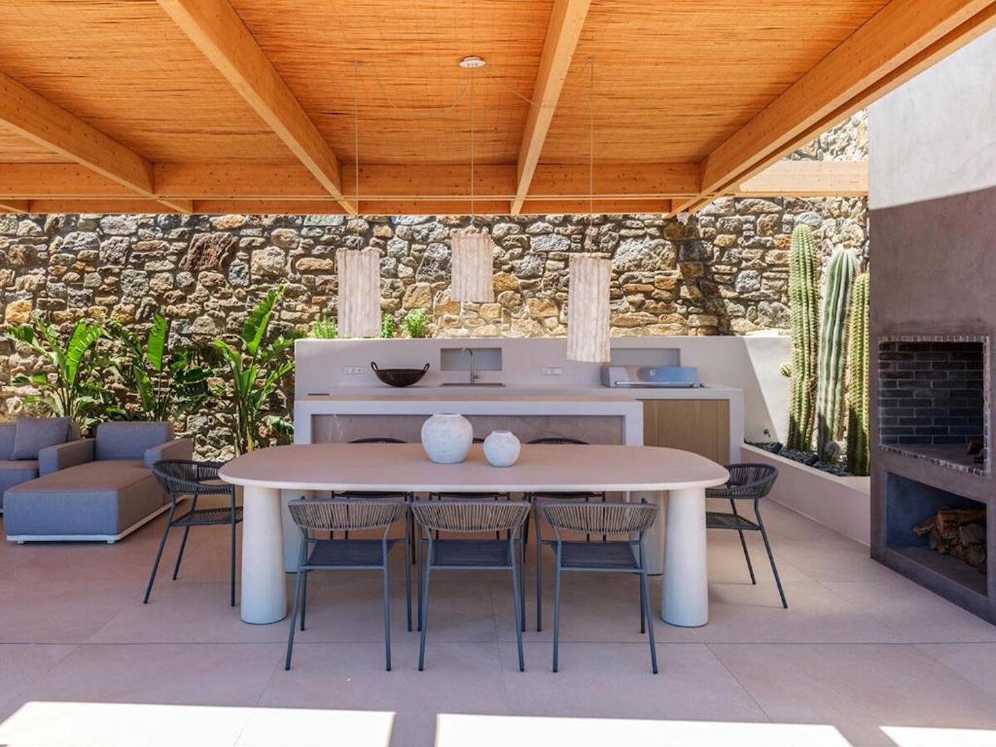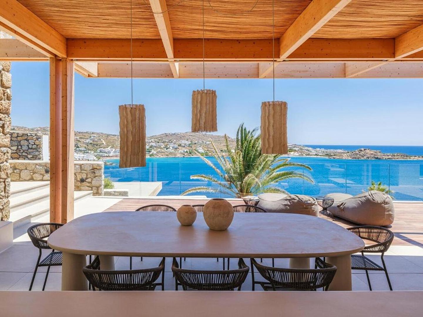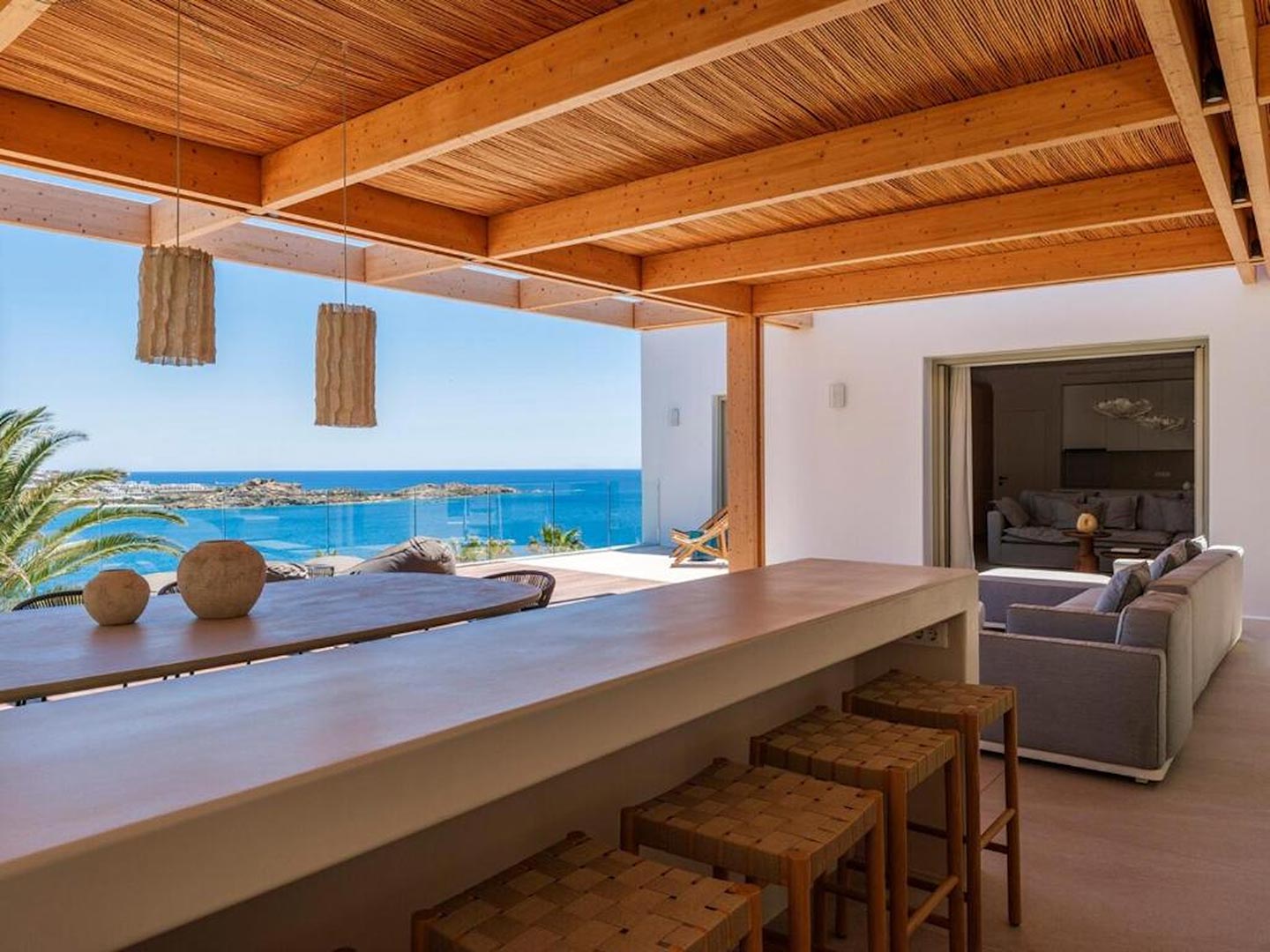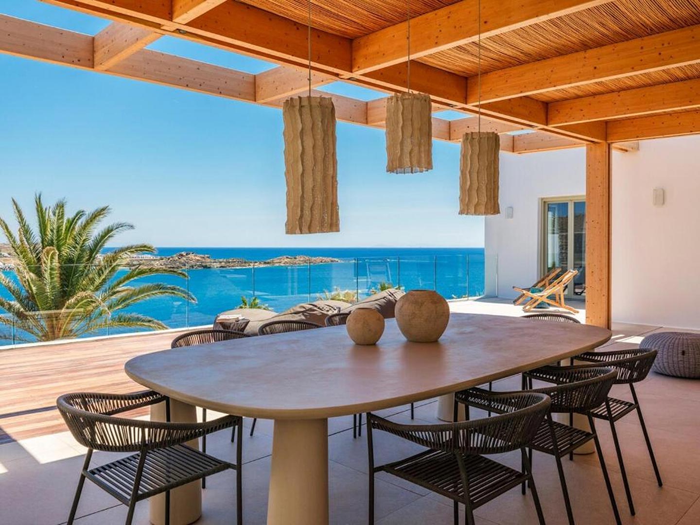 Located just steps from one of the most iconic beaches in the Mediterranean, this exceptional villa offers a harmonious blend of contemporary luxury, refined design, and a prime coastal setting. Recently constructed and elegantly updated, the residence exemplifies upscale island living at its finest.The property features three generously sized master bedrooms, each with a private en-suite bathroom, ensuring comfort and privacy for all guests. An additional guest bathroom enhances everyday convenience. The villa's interior is designed with a modern open-plan concept, connecting a fully equipped kitchen, an inviting dining area, and a bright, spacious living room that opens directly onto a sunlit terrace and stylish outdoor lounge area. This seamless flow between indoor and outdoor spaces invites guests to embrace the relaxed rhythm of Mediterranean life.