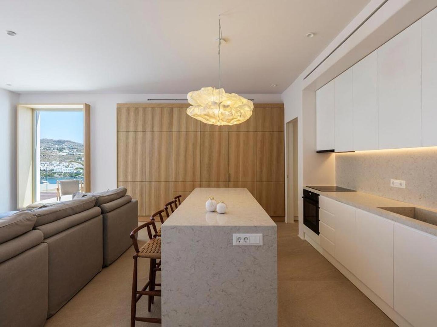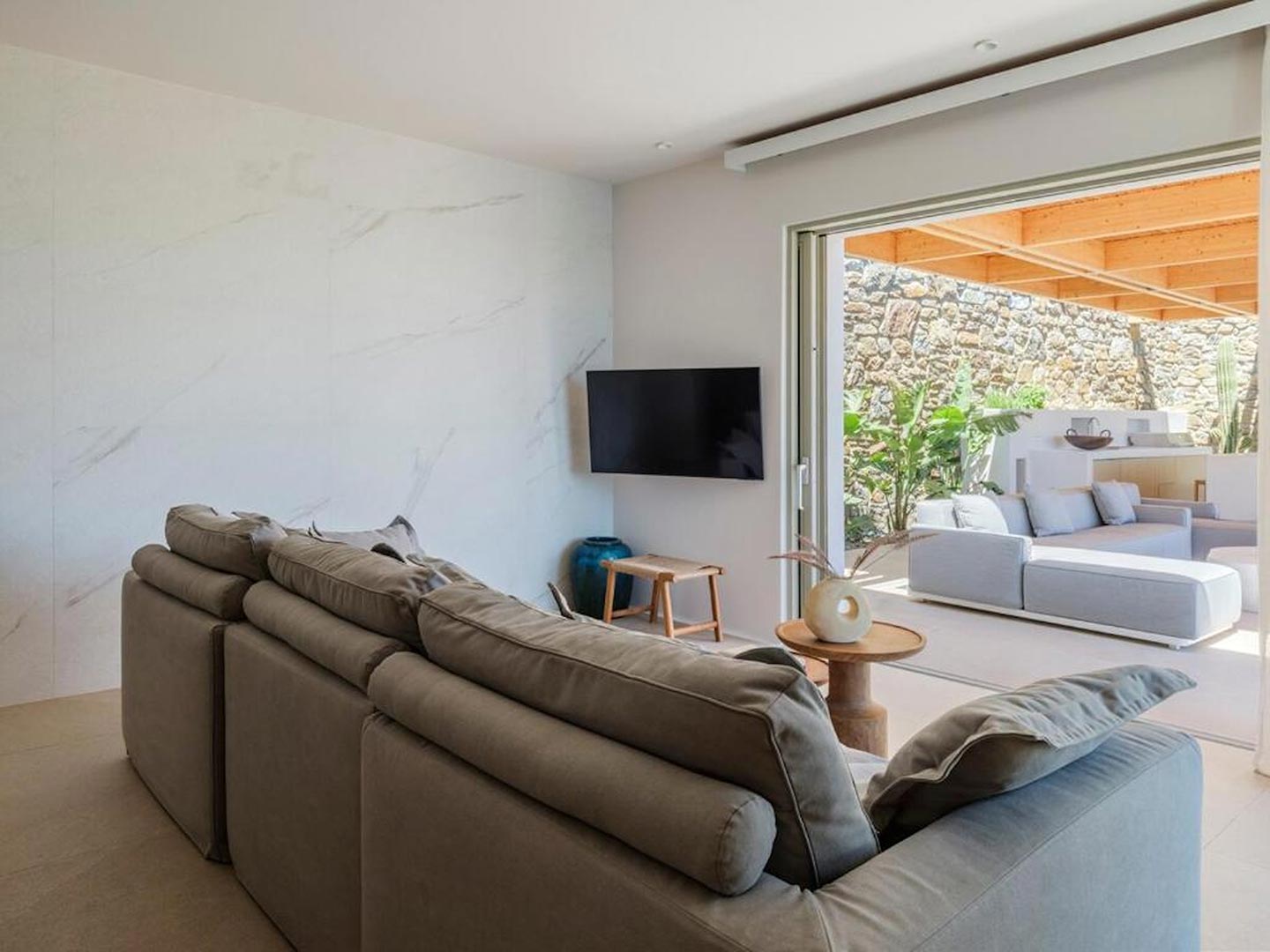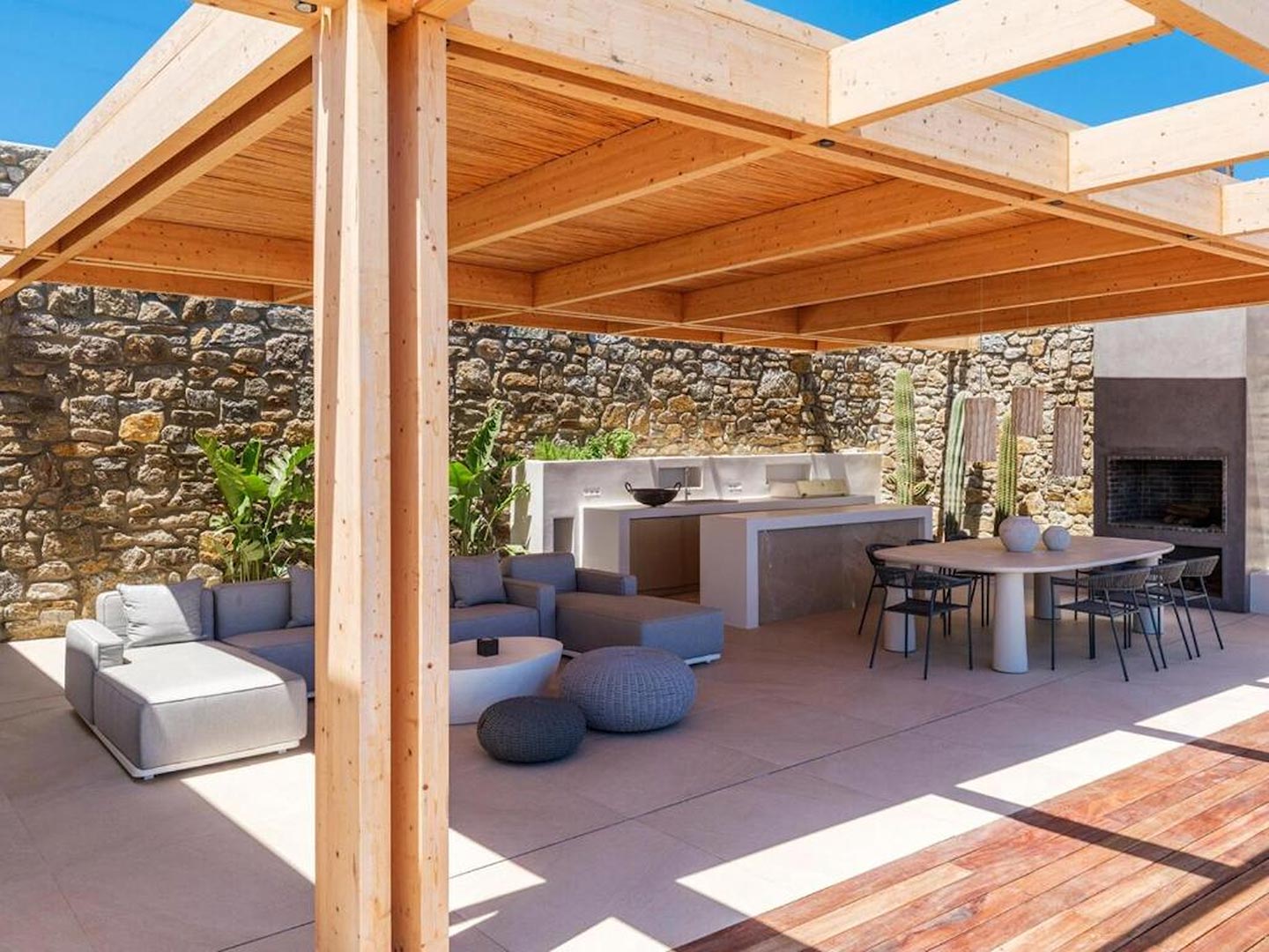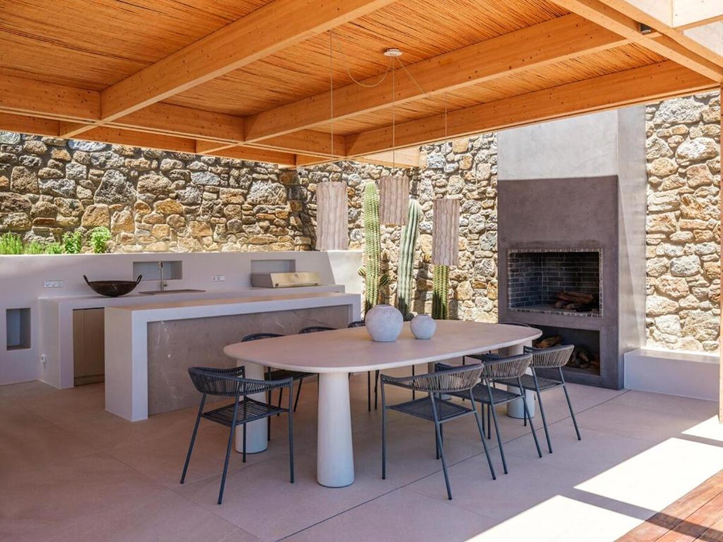 Located just steps from one of the most iconic beaches in the Mediterranean, this exceptional villa offers a harmonious blend of contemporary luxury, refined design, and a prime coastal setting. Recently constructed and elegantly updated, the residence exemplifies upscale island living at its finest.The property features three generously sized master bedrooms, each with a private en-suite bathroom, ensuring comfort and privacy for all guests. An additional guest bathroom enhances everyday convenience. The villa's interior is designed with a modern open-plan concept, connecting a fully equipped kitchen, an inviting dining area, and a bright, spacious living room that opens directly onto a sunlit terrace and stylish outdoor lounge area. This seamless flow between indoor and outdoor spaces invites guests to embrace the relaxed rhythm of Mediterranean life.