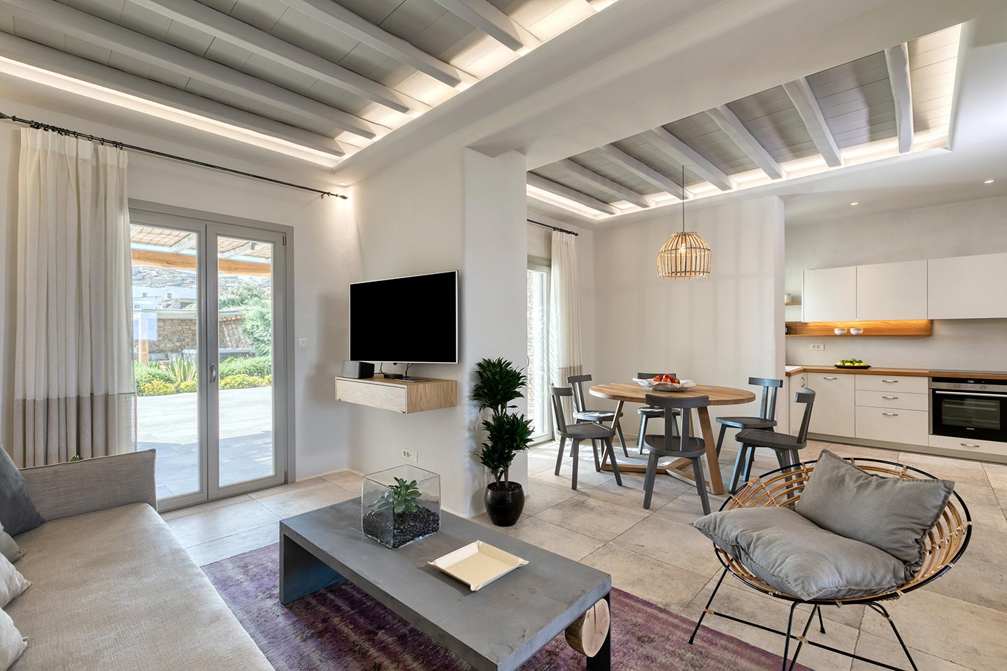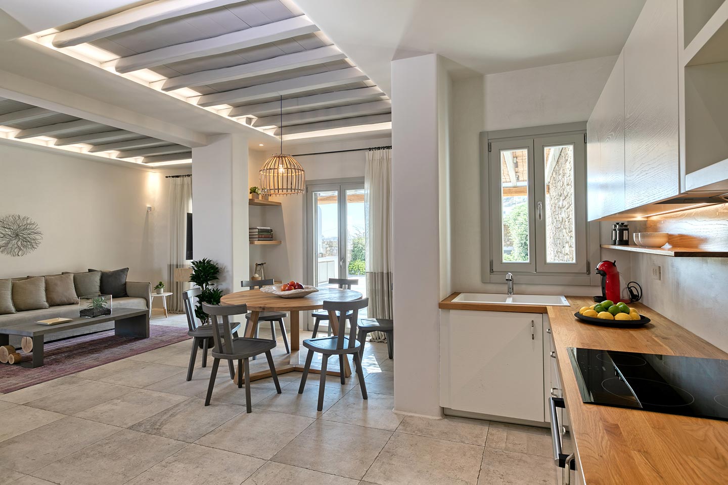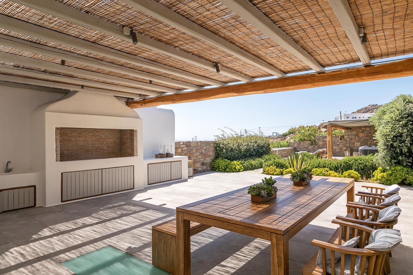 Staying in this beautiful house that overlooks the sparkling Mykonian coastline will help create unforgettable memories… The villa’s amenities include 2 double bedrooms with ensuite bathrooms on the ground floor, a living area, a fully equipped open plan kitchen and a toilet in the entrance level and 2 master bedrooms with a sharing bathroom on the top floor. On the outside there are spacious dining and lounge areas and a BBQ. The new outdoor private hot tub compliments the aura of the night under the stars.