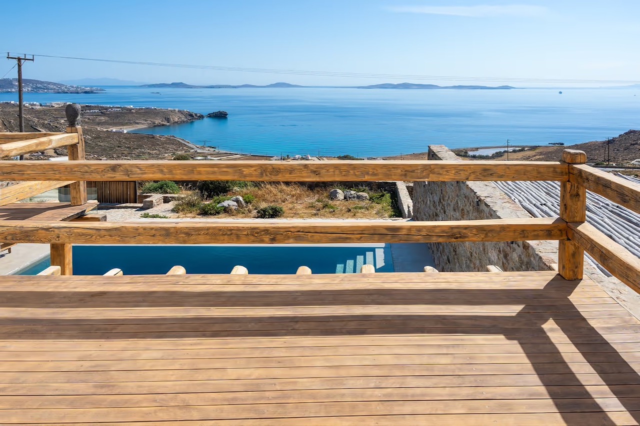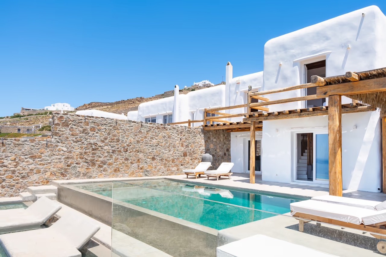 Villa Milo is a luxurious 3-bedroom, 3.5-bathroom retreat perched above the tranquil Choulakia Bay, offering uninterrupted views of the Aegean Sea and mesmerizing sunsets. Just a 10-minute drive from the vibrant Mykonos Town, this exquisite villa blends Cycladic charm with contemporary elegance, creating the perfect haven for relaxation and adventure. Perched above the shimmering waters of Choulakia, Villa Milo offers a breathtaking panorama stretching across the Aegean, with a front-row seat to the islands of Delos and Tinos.