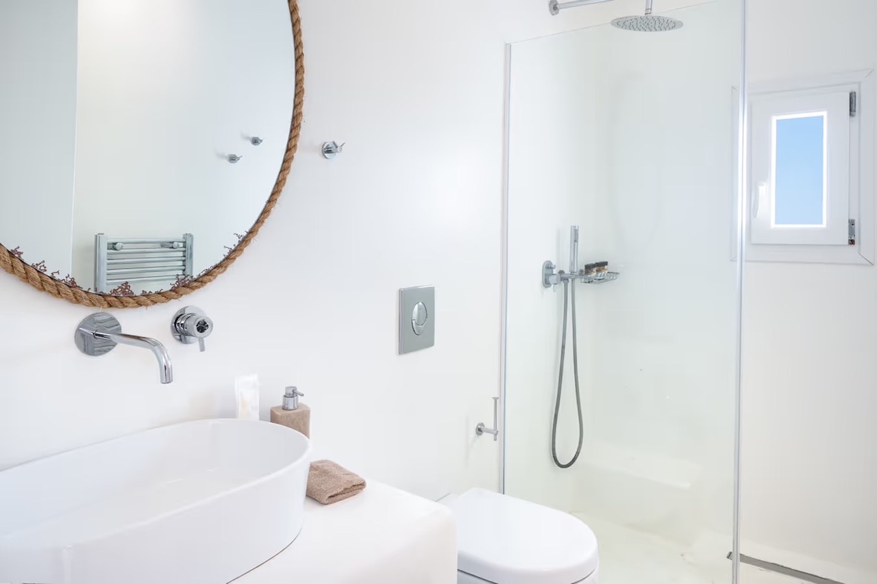 The villa’s outdoor oasis is designed for ultimate indulgence. A stunning infinity pool seamlessly merges with the horizon, illuminated at night by fiber optic lights, creating a magical ambiance. Plush sun loungers invite guests to soak up the Mykonian sun, while a built-in dining table, Mykonian-style bar, and elegant alfresco dining area set the stage for leisurely breakfasts or romantic dinners under the stars. Shaded verandas, cozy recliners, and stylish built-in seating complete the perfect outdoor retreat.
