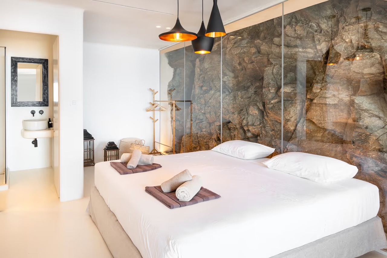 • Bedroom 3 (External Suite): A serene retreat featuring glass and natural stone elements, steps away from the pool, complete with an en-suite bathroom