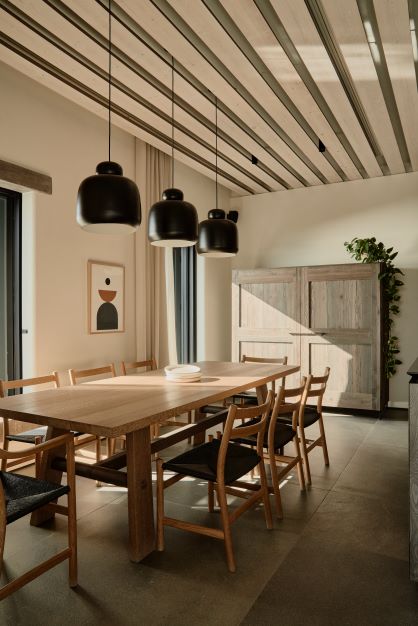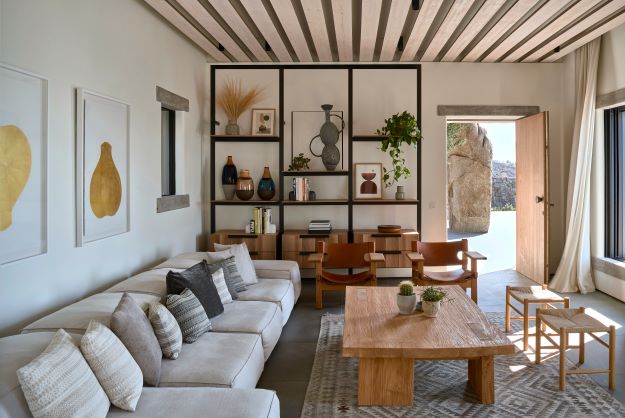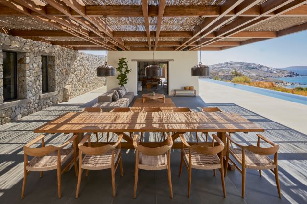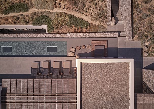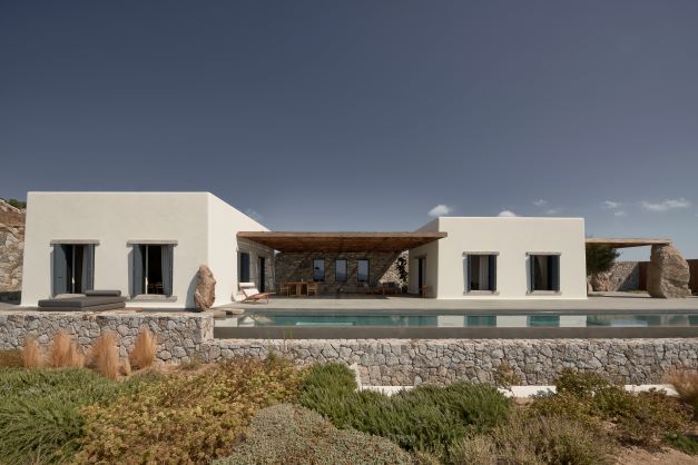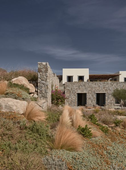 A 5-bedroom holiday house built for a young, dynamic couple to enjoy with their family and friends, it celebrates its spectacular view from a grounded viewpoint blended into a sensitively landscaped, stone-walled garden that screens it from the road behind. Sitting on the ridge of the hill of Aleomandra in Mykonos yet almost entirely hidden from view, Villa Nicole looks straight out to sea and the sunset over the neighbouring island of Delos.