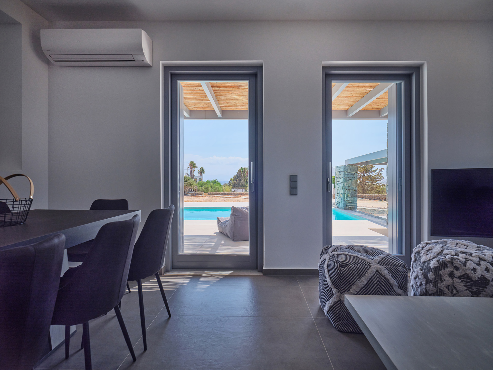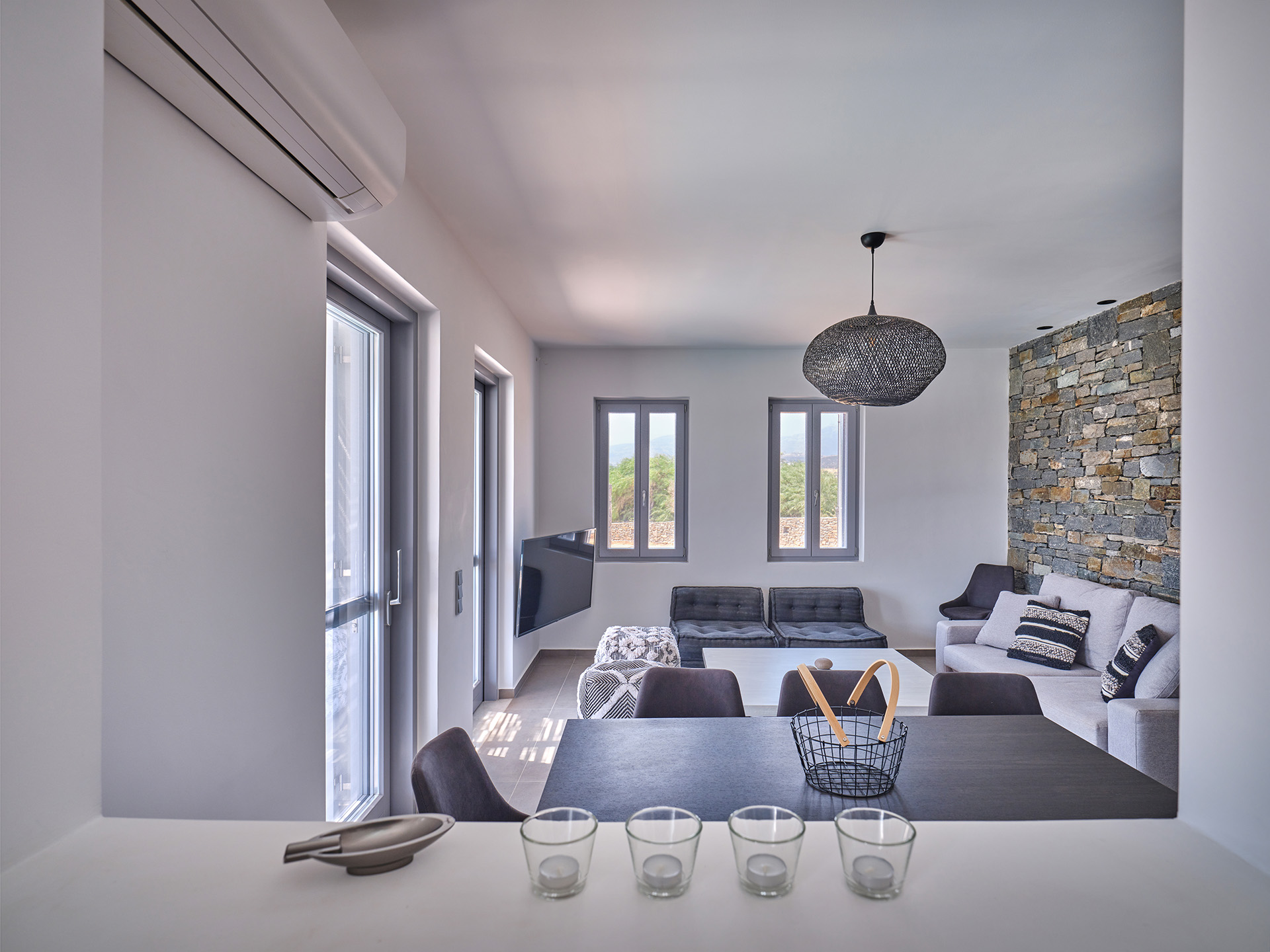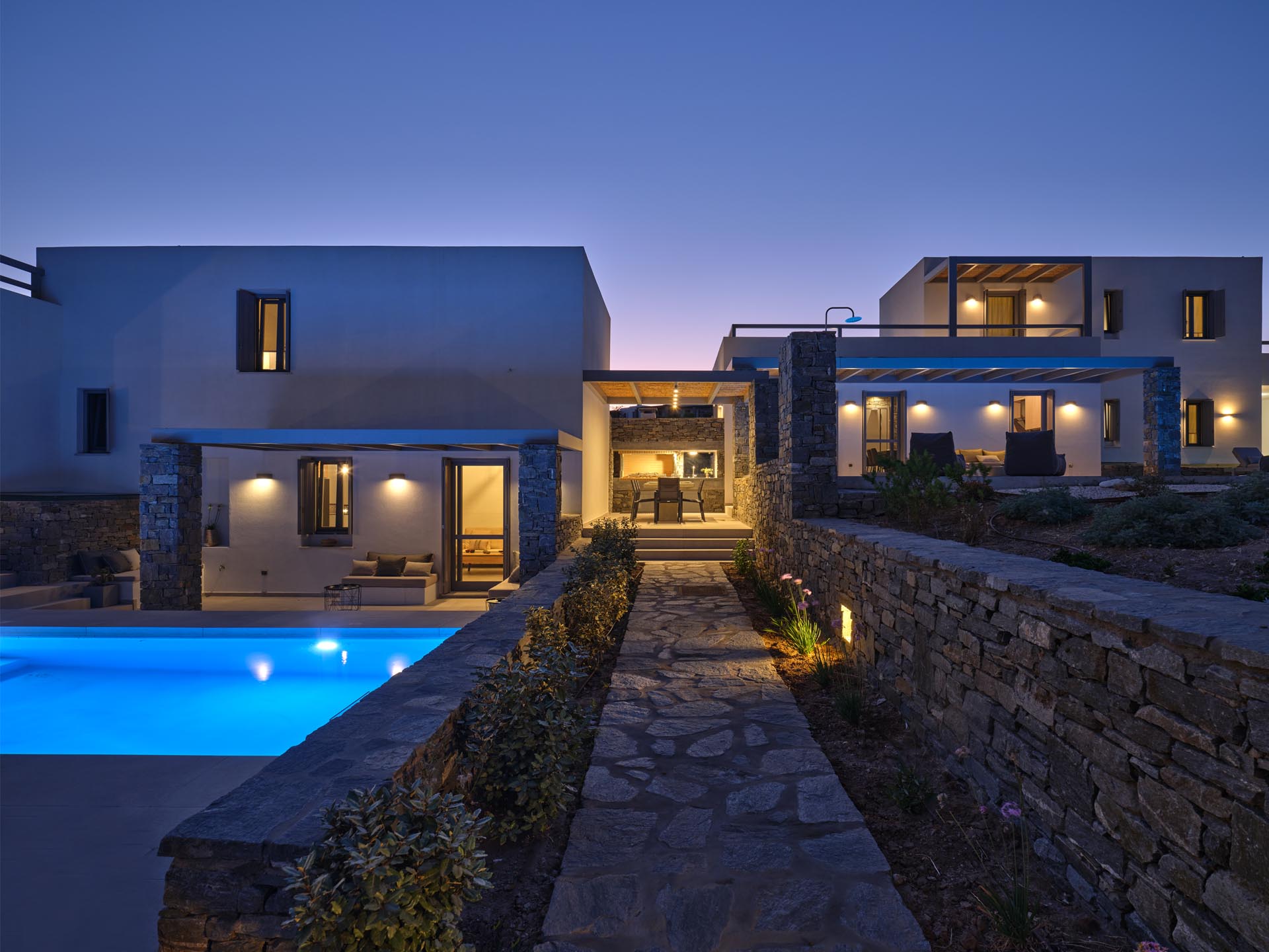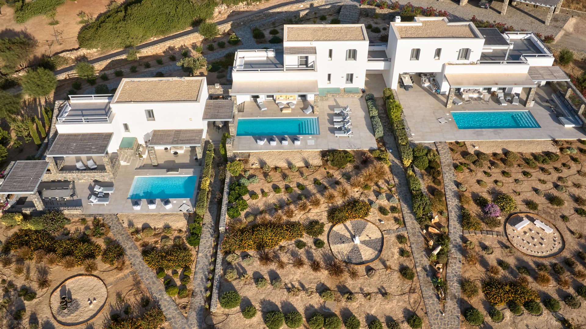 The residences, built in a modern, minimal architectural style, still harmonically combined with the traditional stone and the characteristic white color of the Greek islands, are totally absorbed in the natural environment, surrounded by plants and flowers, one can only meet in this beautiful Cycladic Island. In the inner space the comfortable, rich in natural light living room the minimal lines take turns with the wooden or made of stone elements, creating a unique aesthetic, hospitable home. The open space, fully equipped kitchen is there to host those who want to try their cooking abilities during their vacations. Villa Olivia, having 7 comfortable, lucent double bedrooms, 1 bedroom with 2 single beds, 7 spacy bathrooms and one WC can host up to 16 persons.