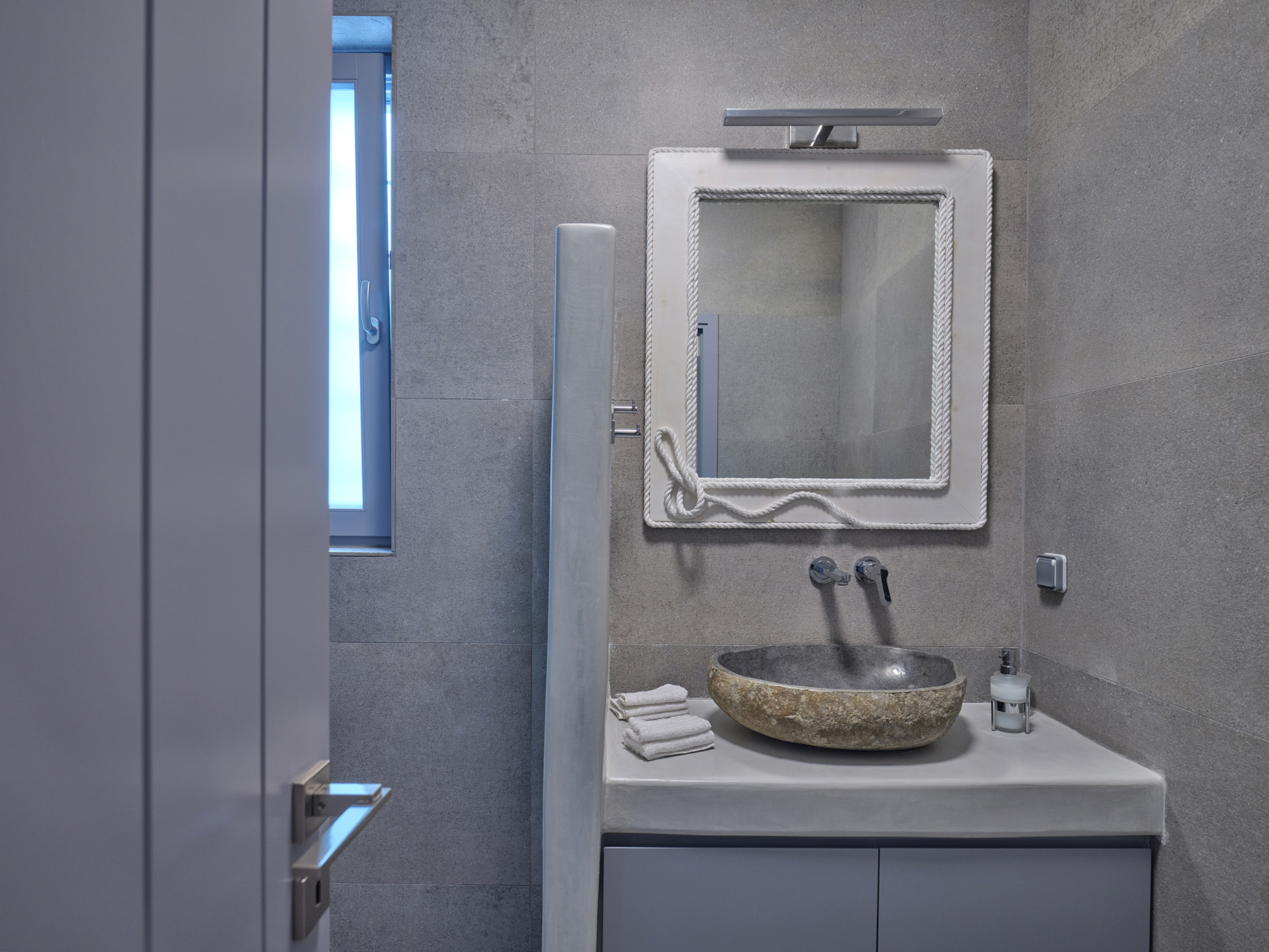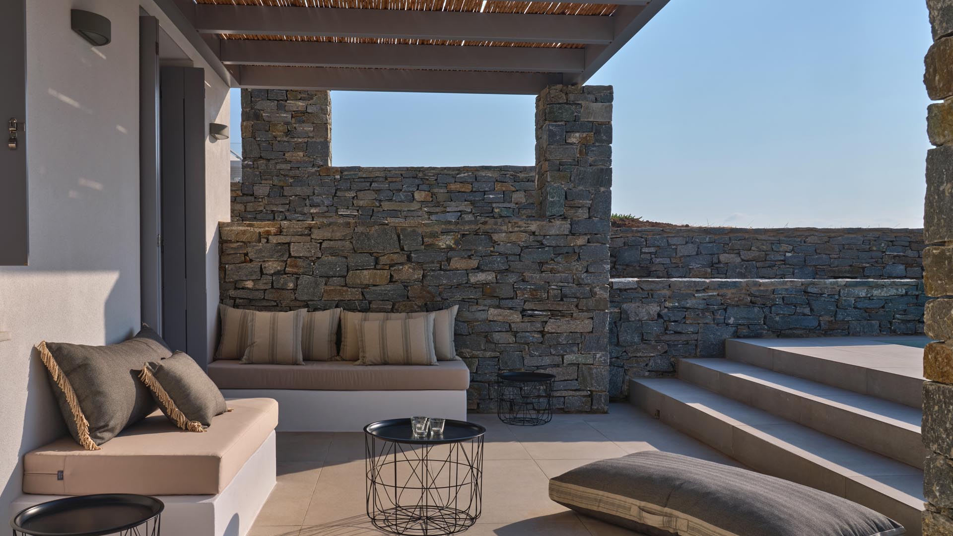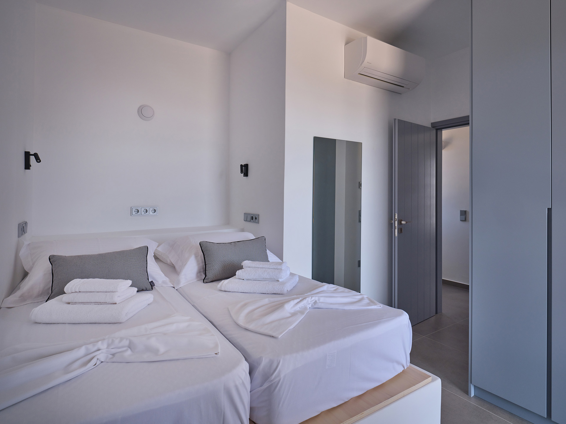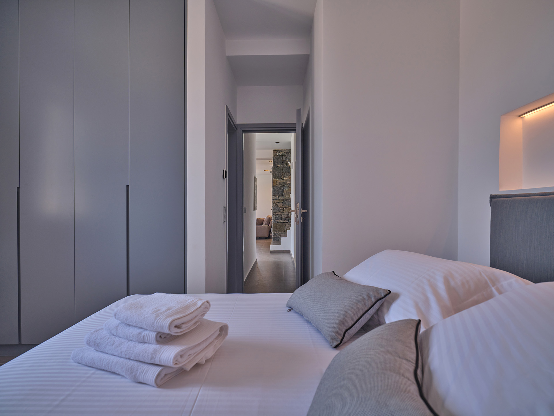 The residences, built in a modern, minimal architectural style, still harmonically combined with the traditional stone and the characteristic white color of the Greek islands, are totally absorbed in the natural environment, surrounded by plants and flowers, one can only meet in this beautiful Cycladic Island. In the inner space the comfortable, rich in natural light living room the minimal lines take turns with the wooden or made of stone elements, creating a unique aesthetic, hospitable home. The open space, fully equipped kitchen is there to host those who want to try their cooking abilities during their vacations. Villa Olivia, having 7 comfortable, lucent double bedrooms, 1 bedroom with 2 single beds, 7 spacy bathrooms and one WC can host up to 16 persons.