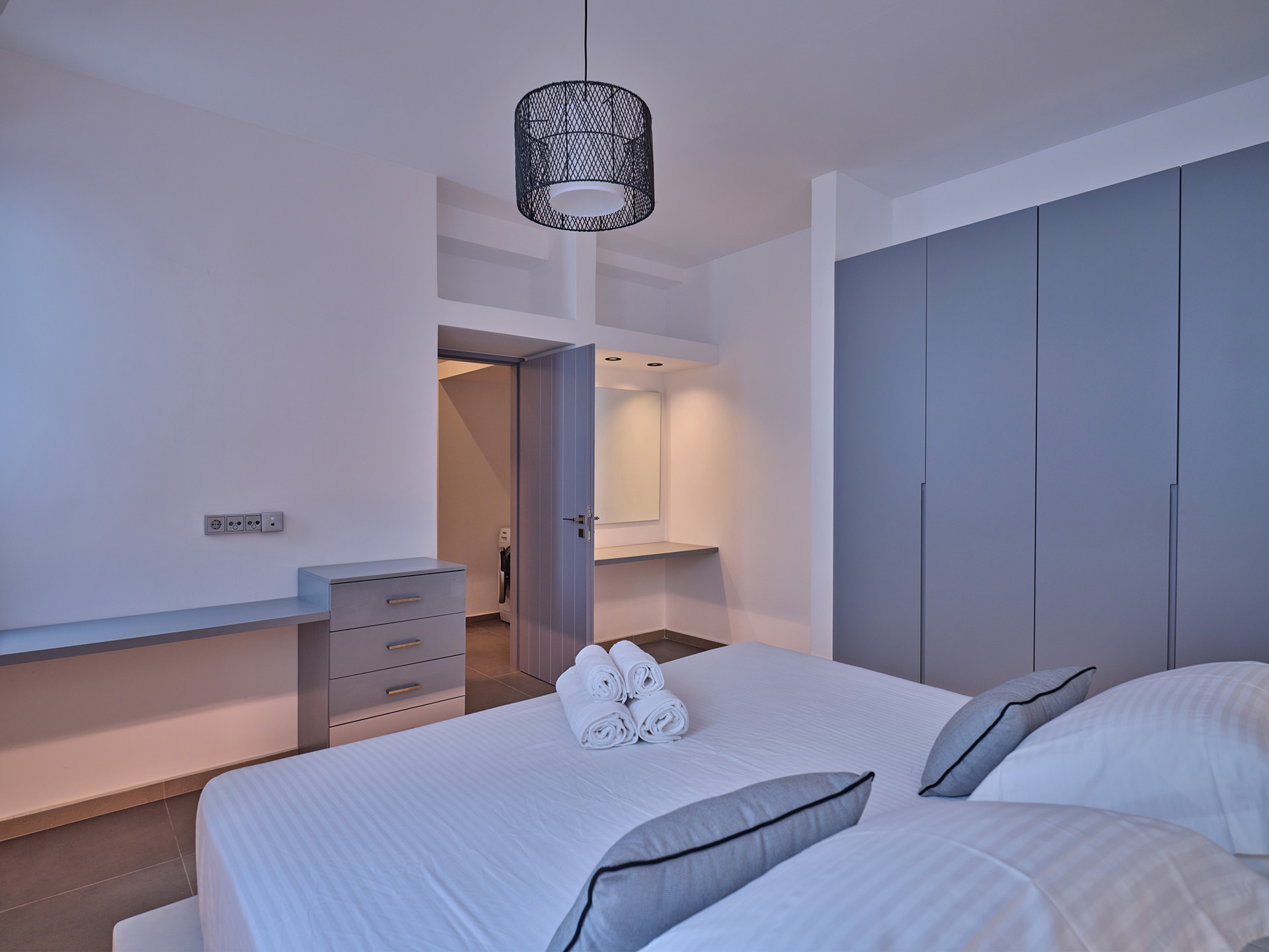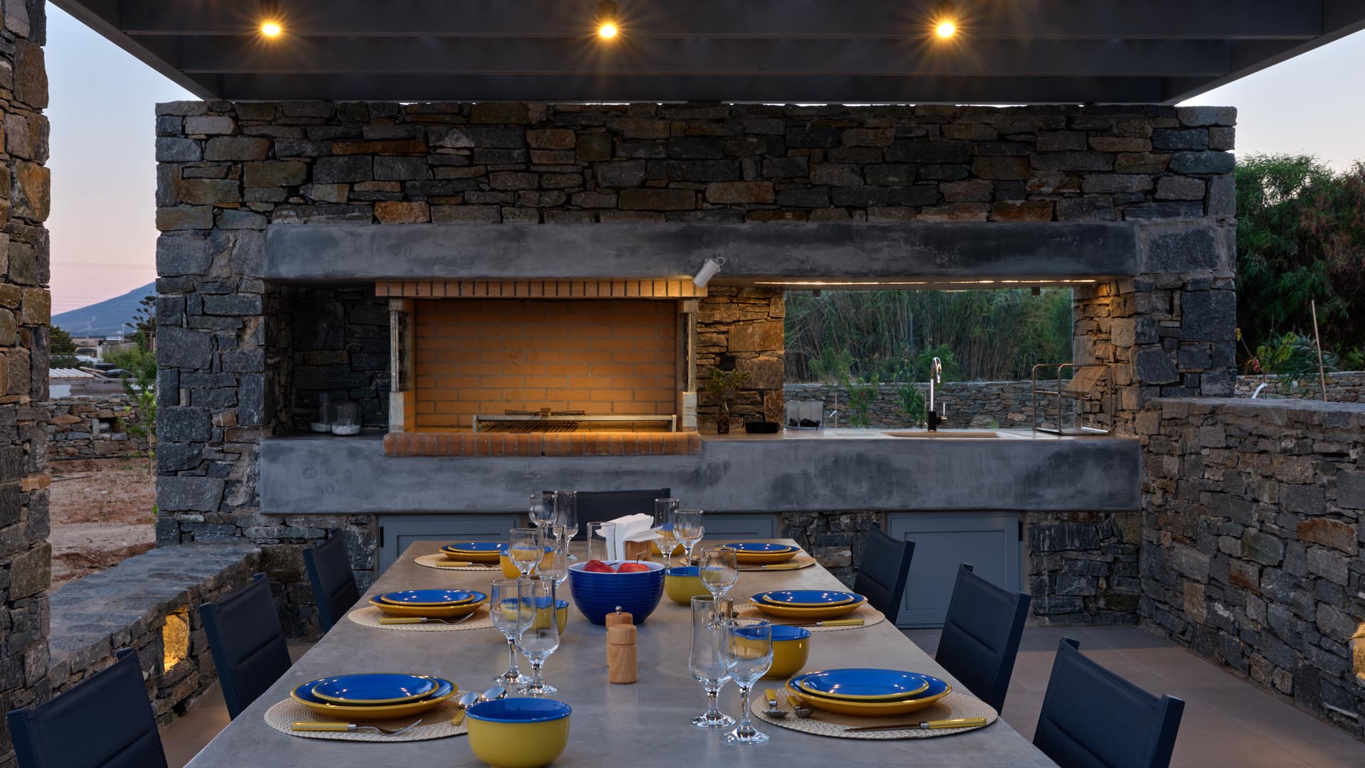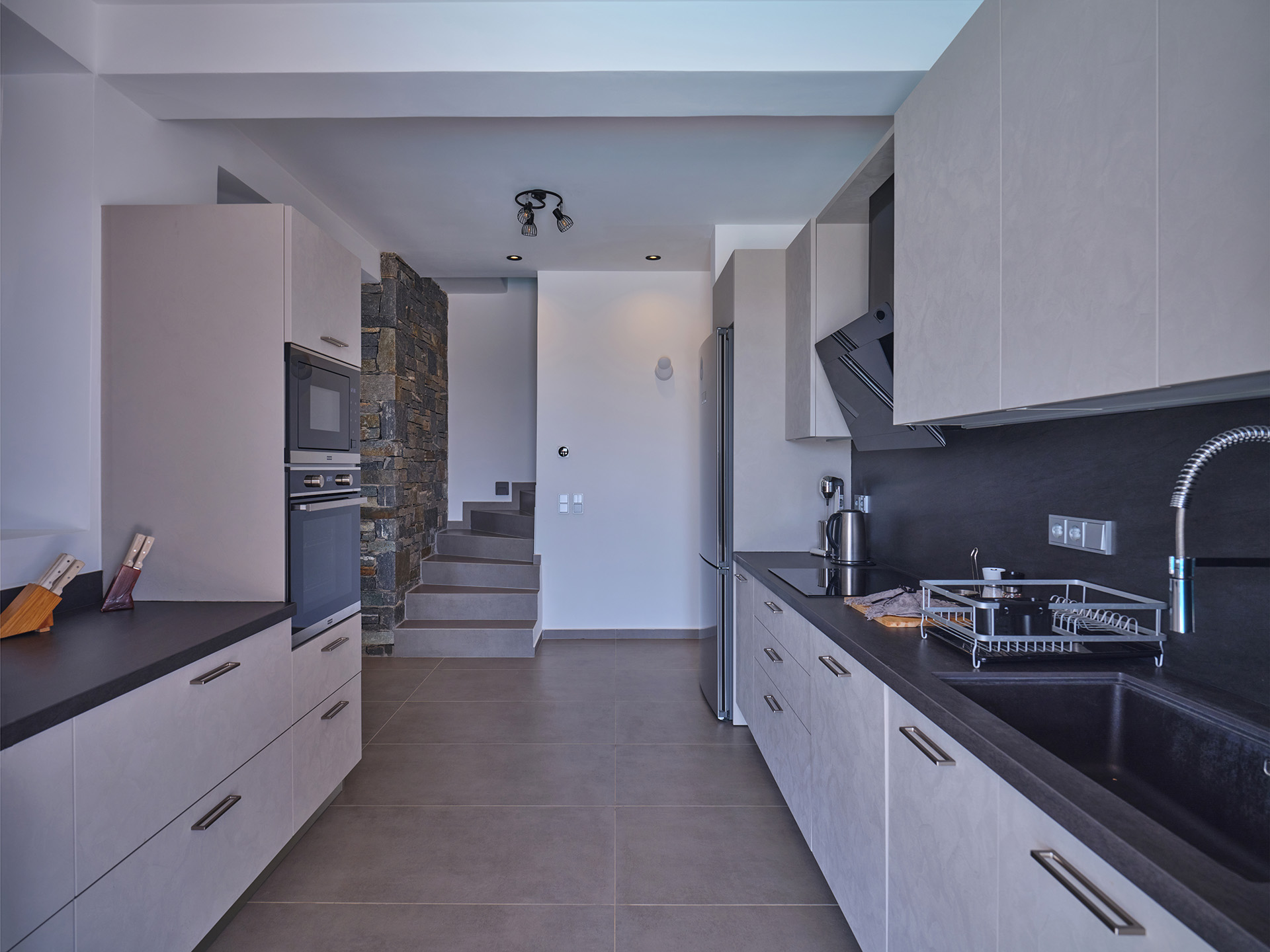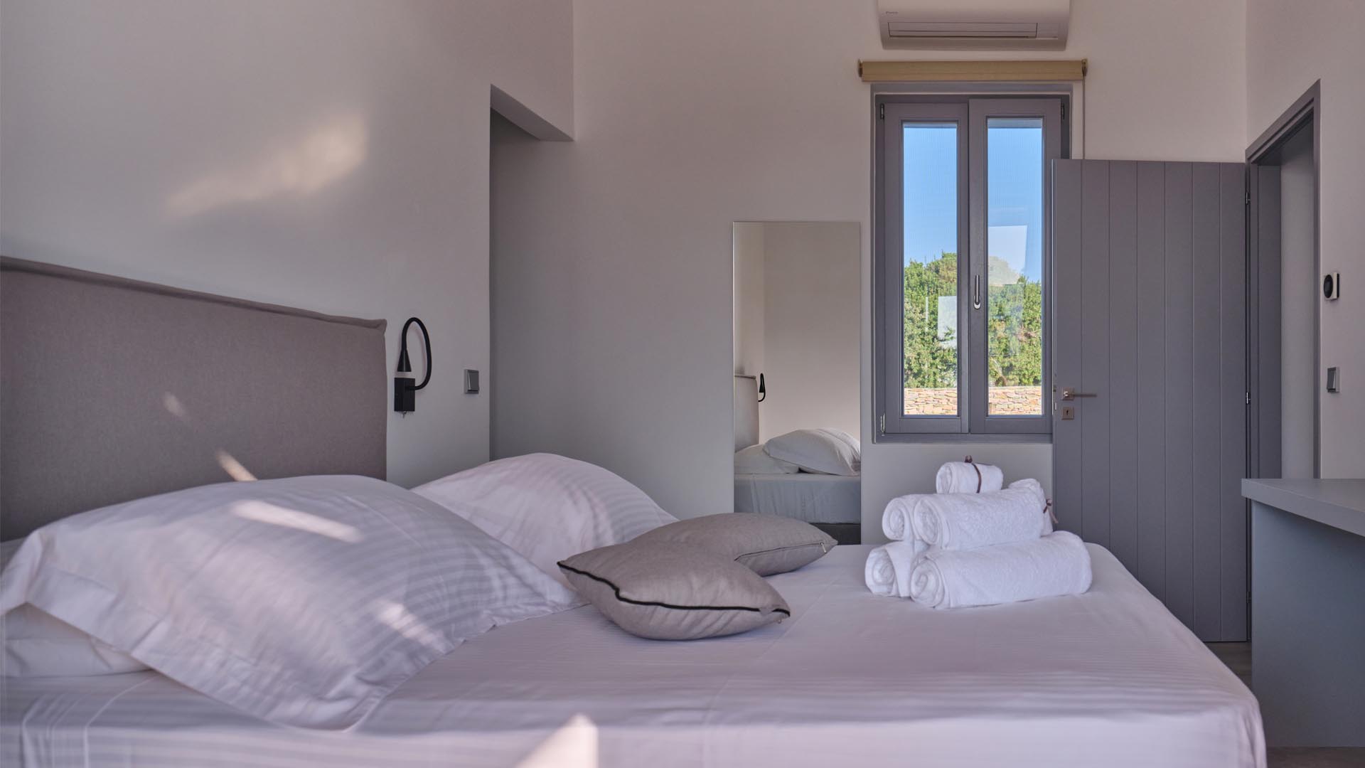 The residences, built in a modern, minimal architectural style, still harmonically combined with the traditional stone and the characteristic white color of the Greek islands, are totally absorbed in the natural environment, surrounded by plants and flowers, one can only meet in this beautiful Cycladic Island. In the inner space the comfortable, rich in natural light living room the minimal lines take turns with the wooden or made of stone elements, creating a unique aesthetic, hospitable home. The open space, fully equipped kitchen is there to host those who want to try their cooking abilities during their vacations. Villa Olivia, having 7 comfortable, lucent double bedrooms, 1 bedroom with 2 single beds, 7 spacy bathrooms and one WC can host up to 16 persons.