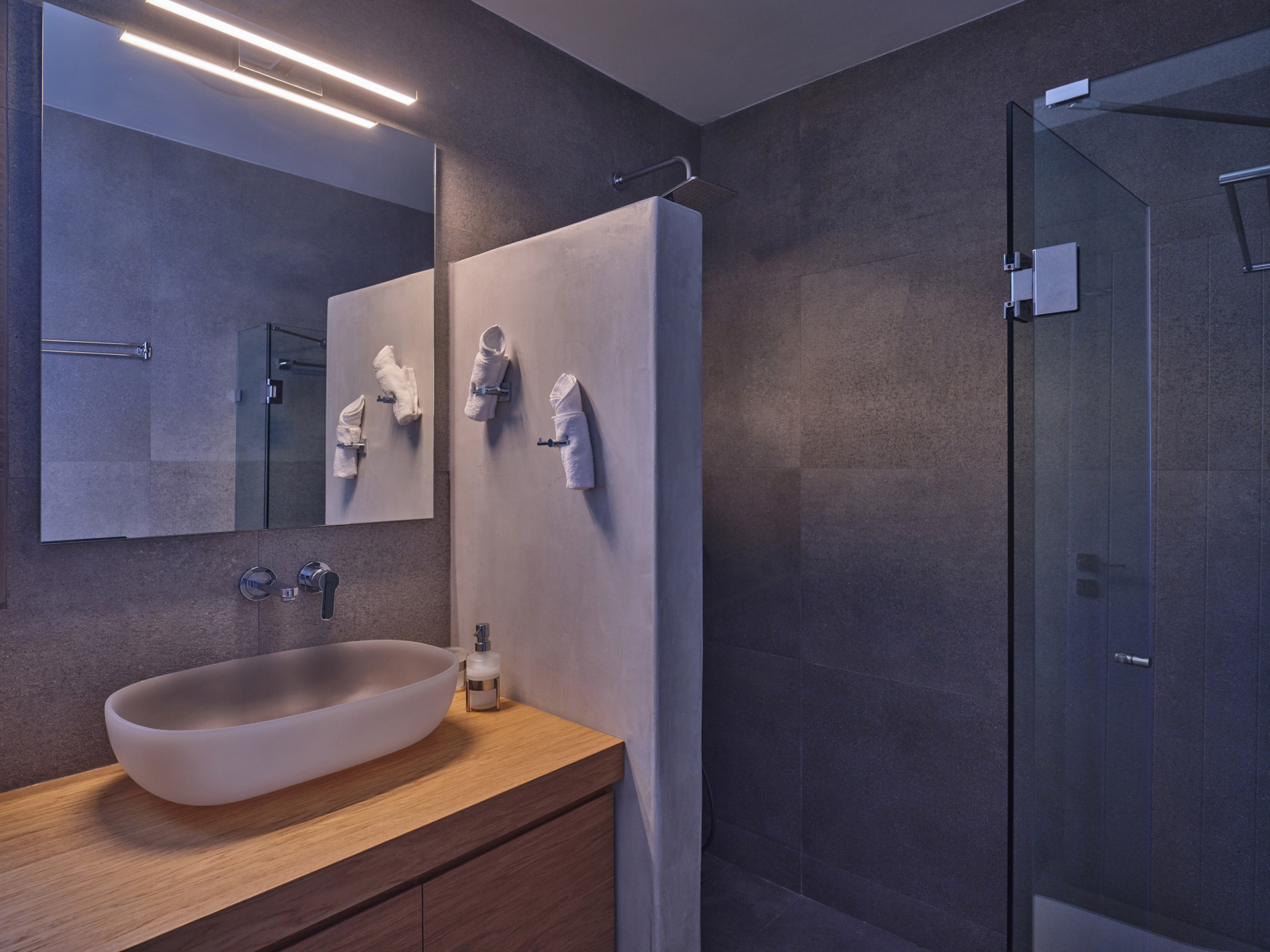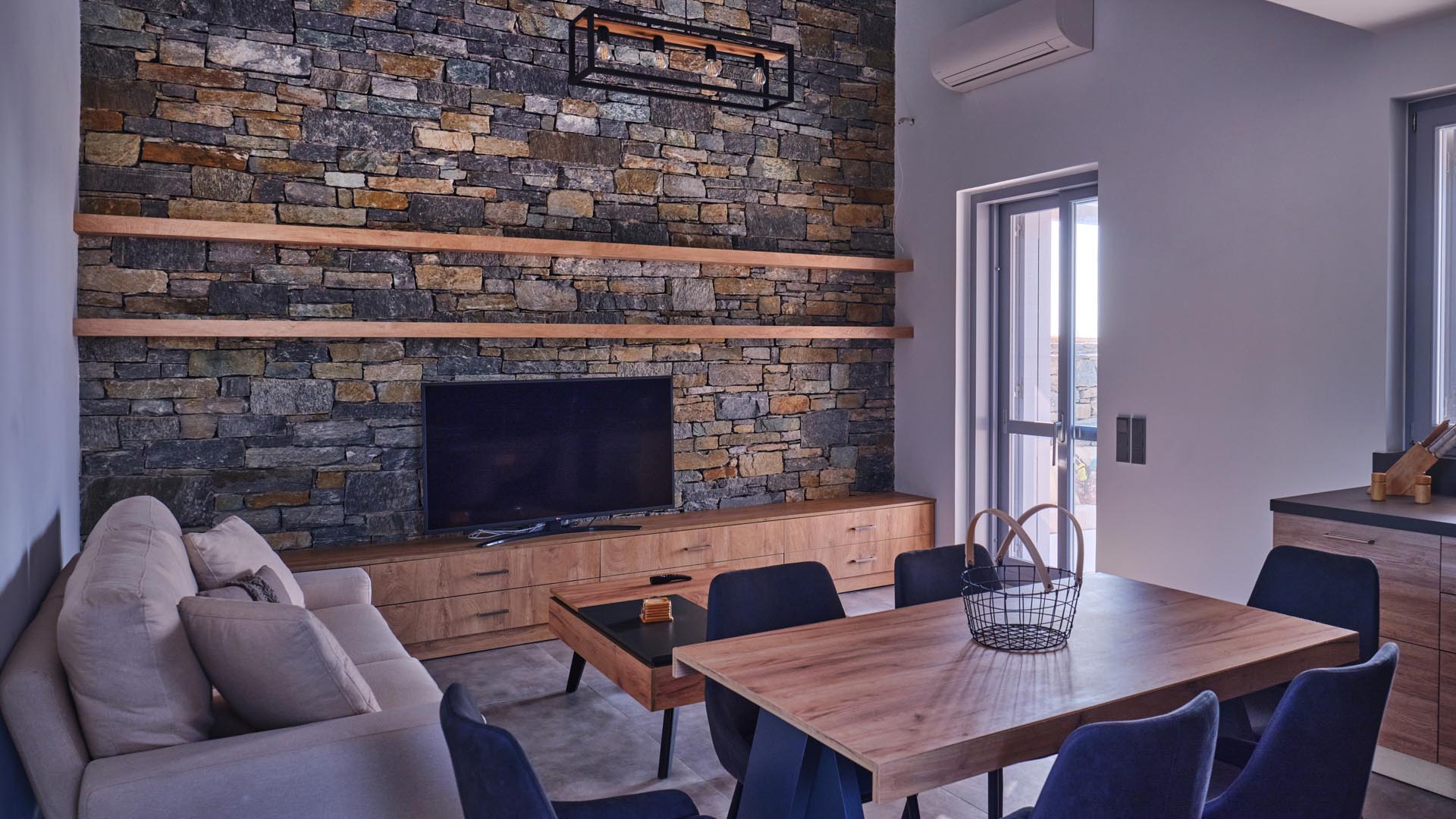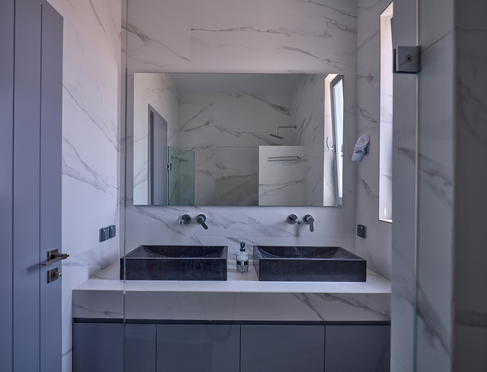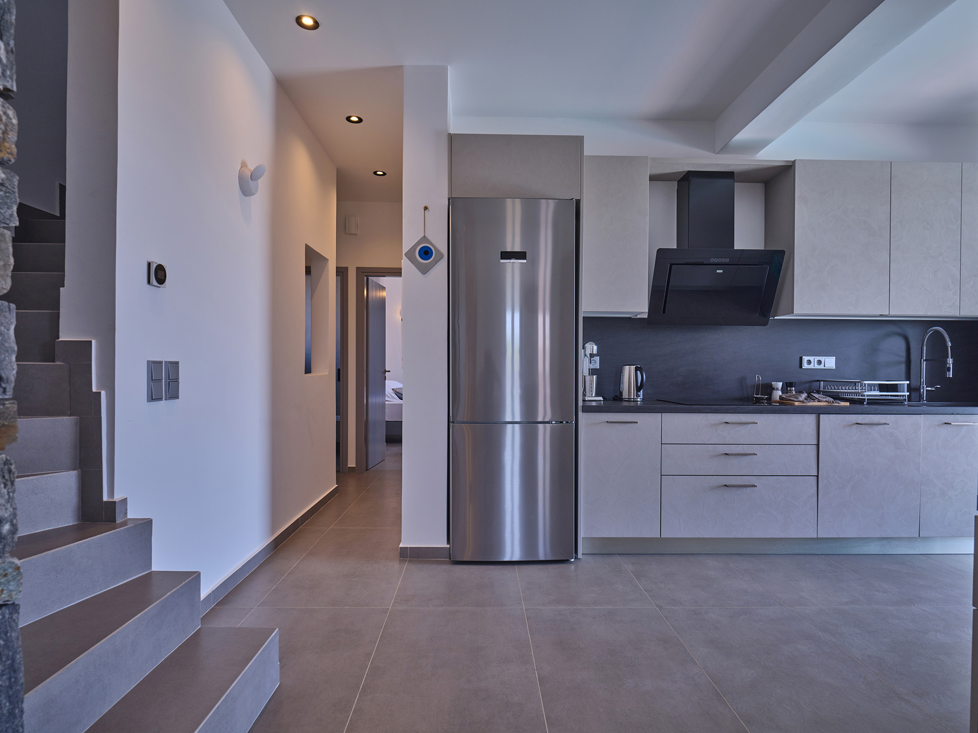 The residences, built in a modern, minimal architectural style, still harmonically combined with the traditional stone and the characteristic white color of the Greek islands, are totally absorbed in the natural environment, surrounded by plants and flowers, one can only meet in this beautiful Cycladic Island. In the inner space the comfortable, rich in natural light living room the minimal lines take turns with the wooden or made of stone elements, creating a unique aesthetic, hospitable home. The open space, fully equipped kitchen is there to host those who want to try their cooking abilities during their vacations. Villa Olivia, having 7 comfortable, lucent double bedrooms, 1 bedroom with 2 single beds, 7 spacy bathrooms and one WC can host up to 16 persons.