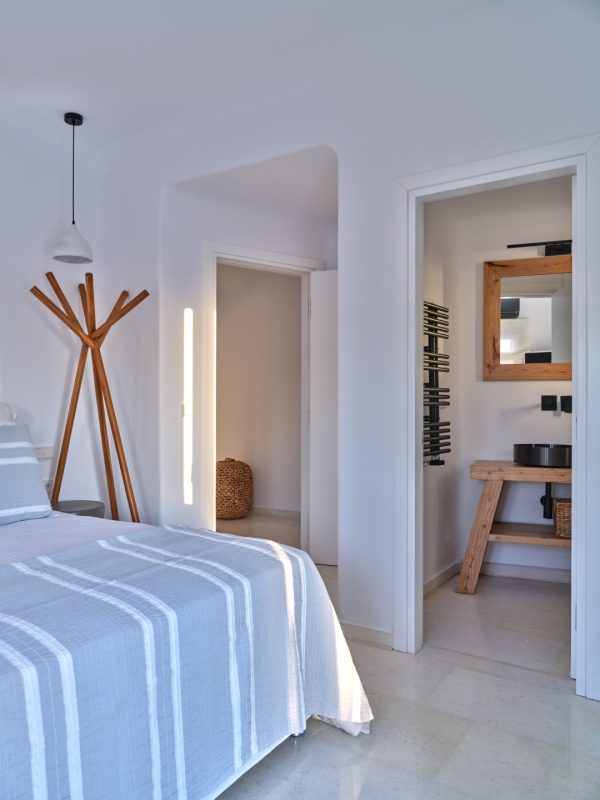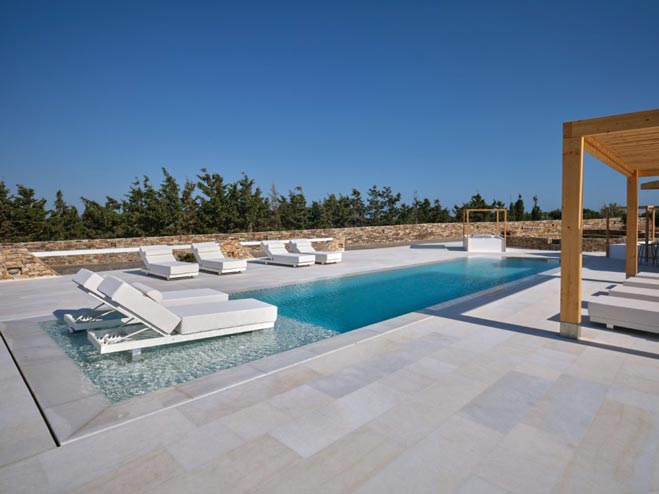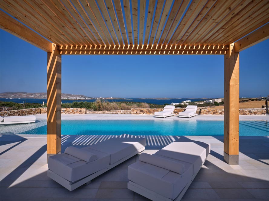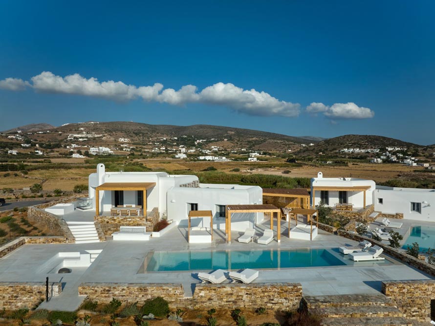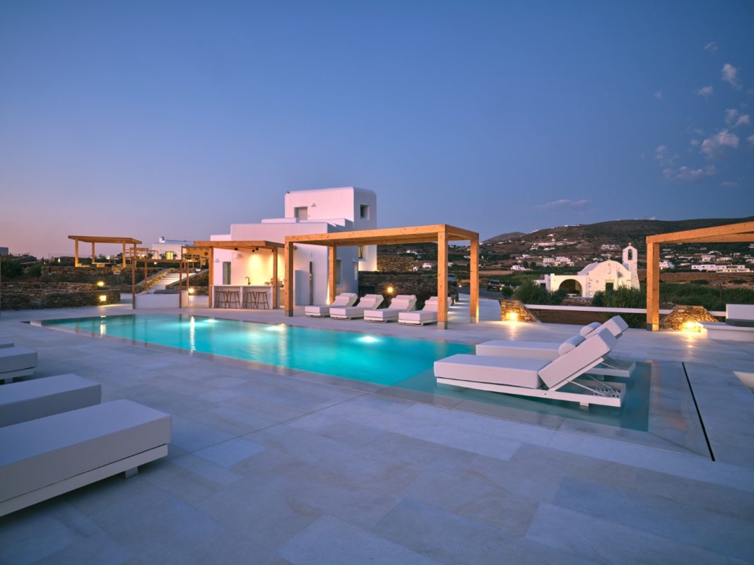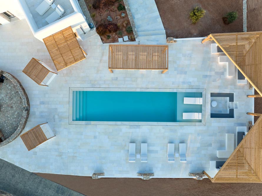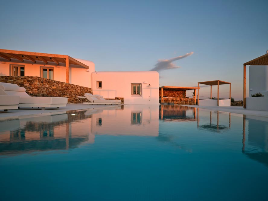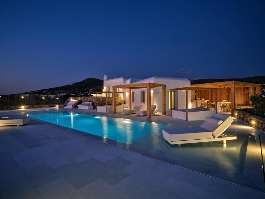 Villa Pegasus sits elegantly on an amazing plot in an unparalleled position facing the Aegean sea and located just 300 m from a swimming spot close to Agia Irini. It is a complex that consists of 3 independent villas, each one with its private pool. Villa Pegasus combines contemporary clean line architecture with a Cycladic influence creating a modern luxurious setting both in and outdoors. Indoors the Villa’s white predominates with wooden and marble touches.