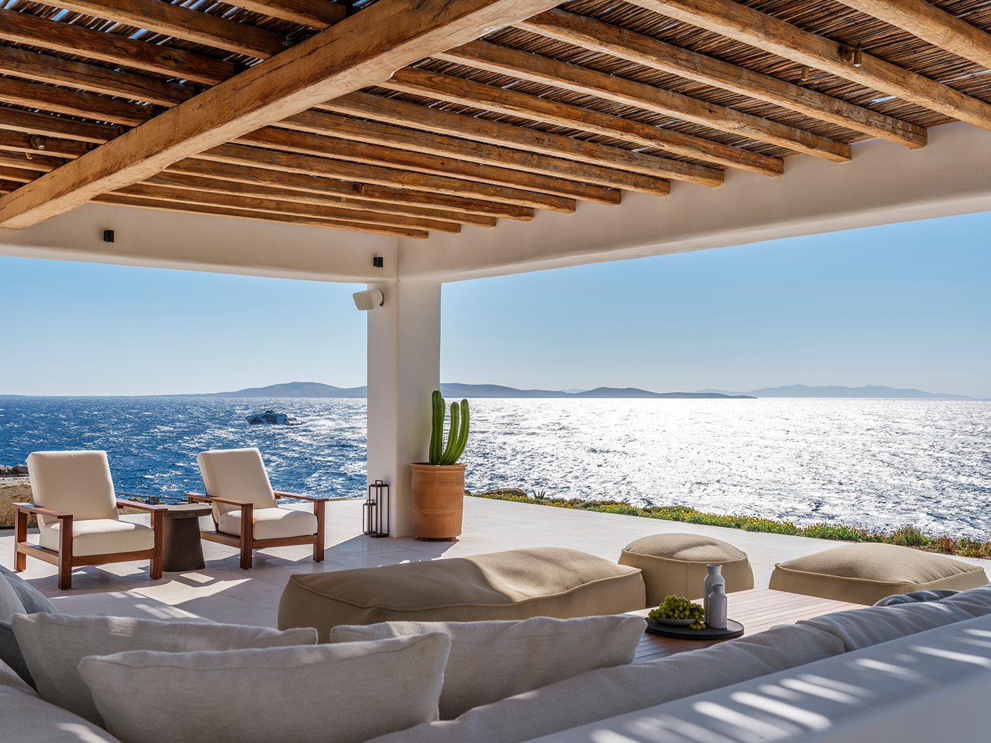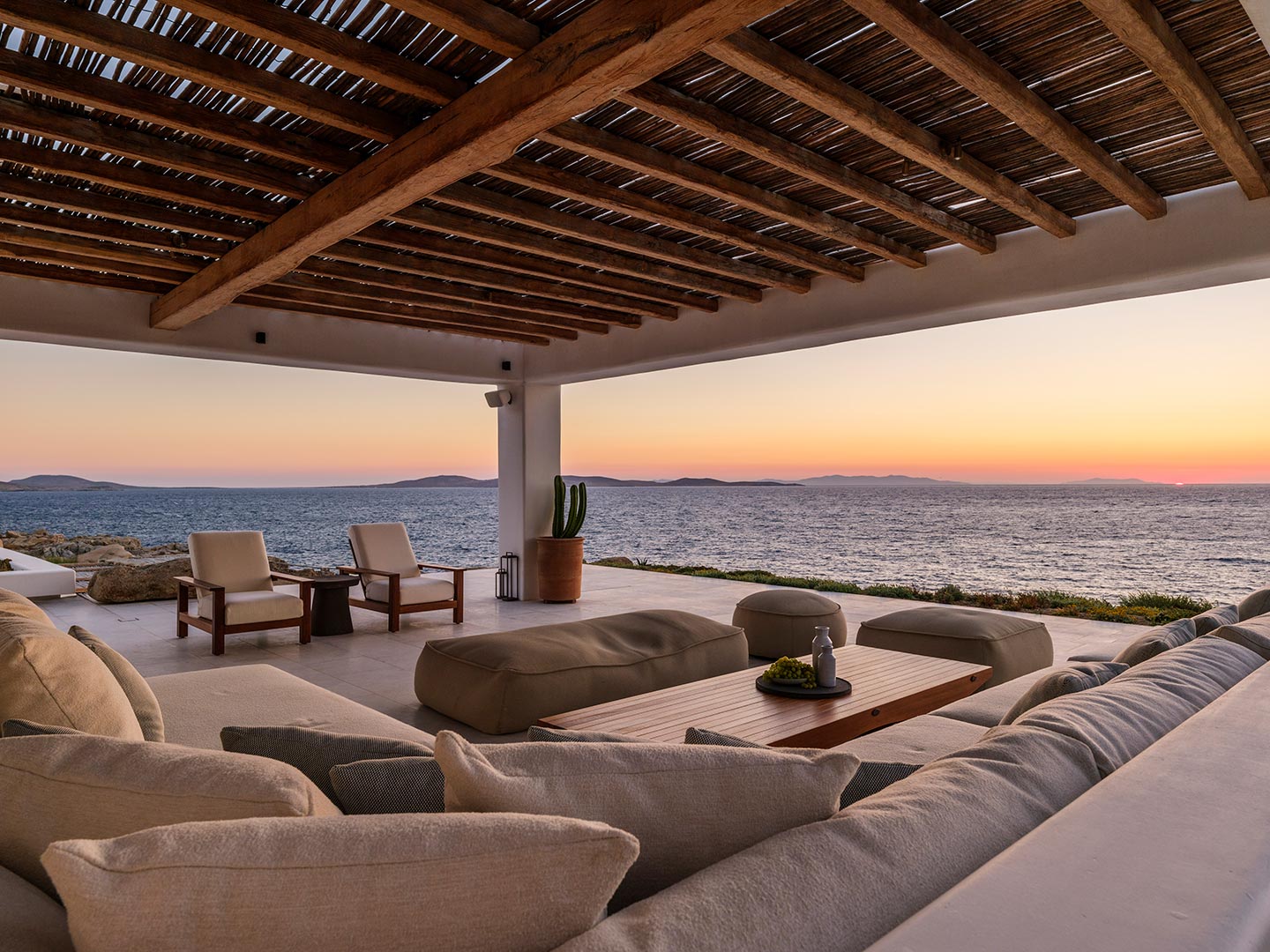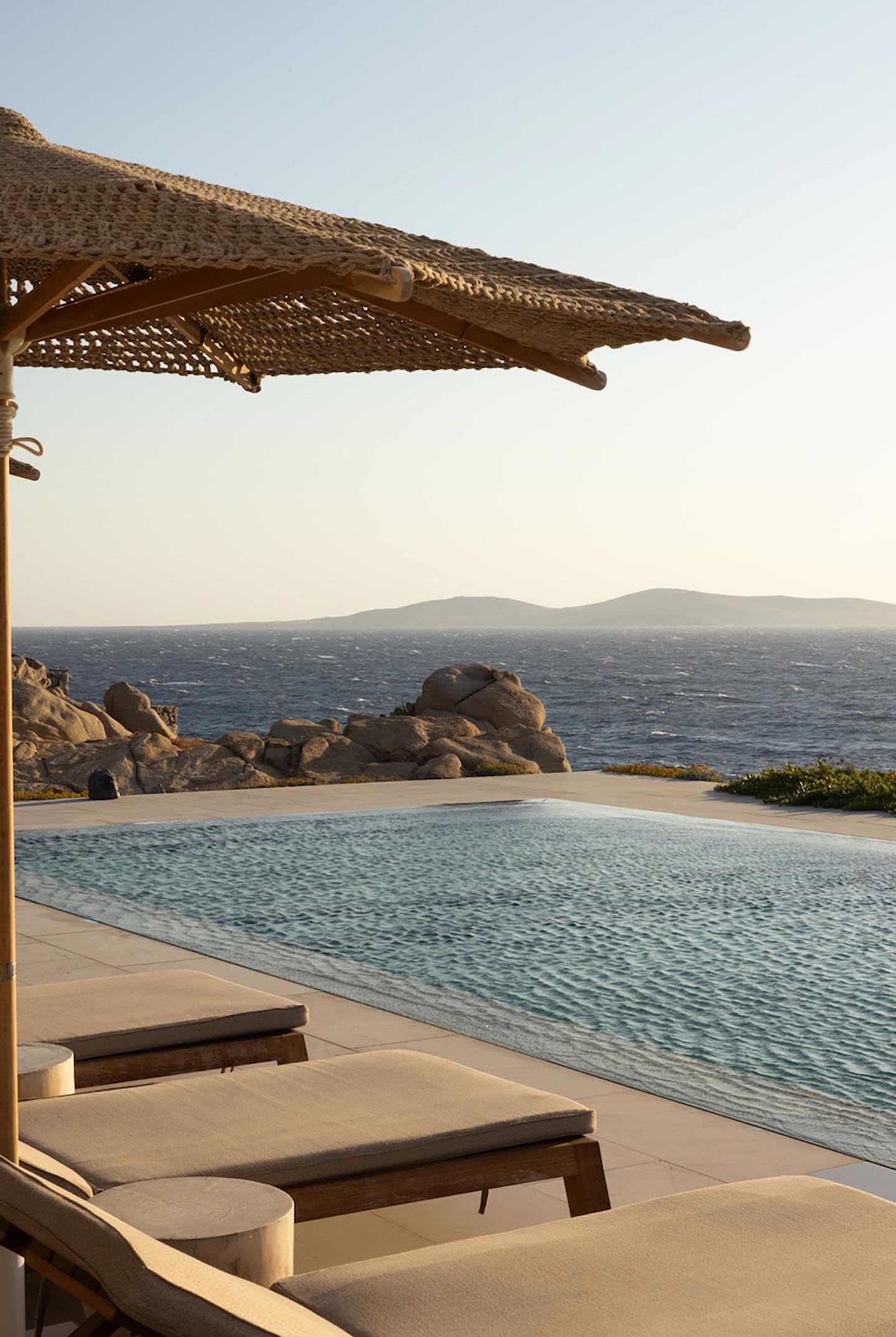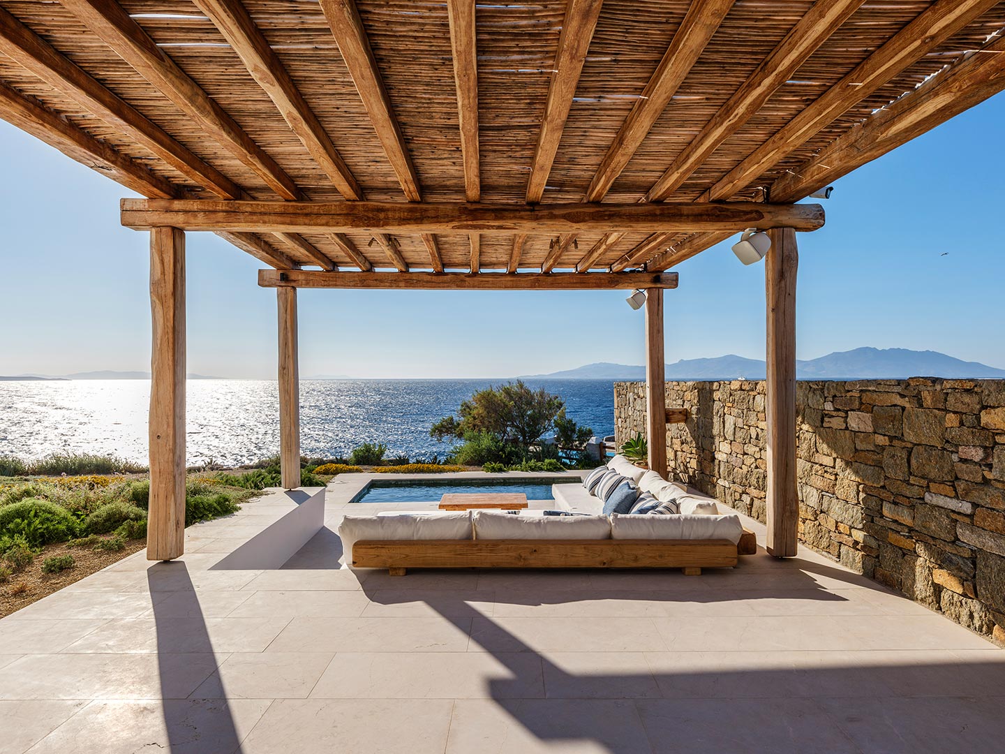 Perched on a southwest-facing cliff in Kanalia, Villa Pennie is a 2023 architectural gem designed by K Studio, offering panoramic views of Delos, Renia, and Tinos. With its own small private beach and a stunning heated marble pool, the villa delivers exceptional exclusivity and comfort. Designed with timeless Greek aesthetics, Villa Pennie features natural materials, whitewashed lines, and bright, open living spaces that seamlessly blend indoor and outdoor living. Spacious terraces, warm textures, and abundant natural light create a serene atmosphere ideal for relaxation. As the sun sets, the villa transforms into a sanctuary of color and calm, perfect for poolside lounging or alfresco dining while taking in breathtaking Aegean views.