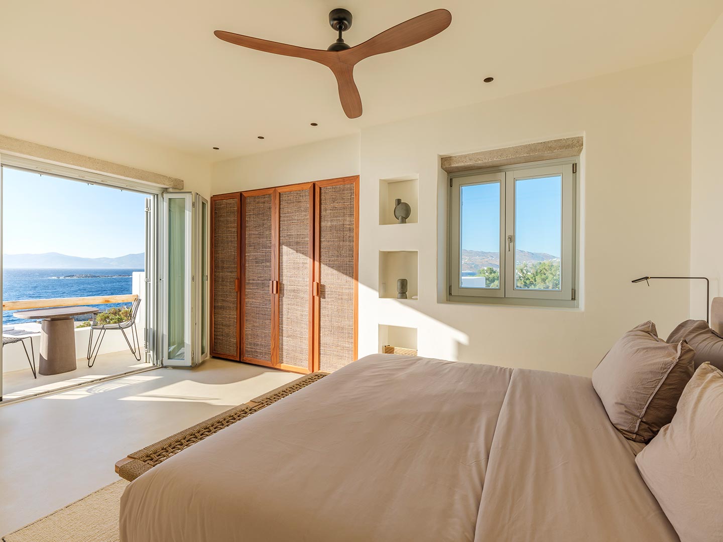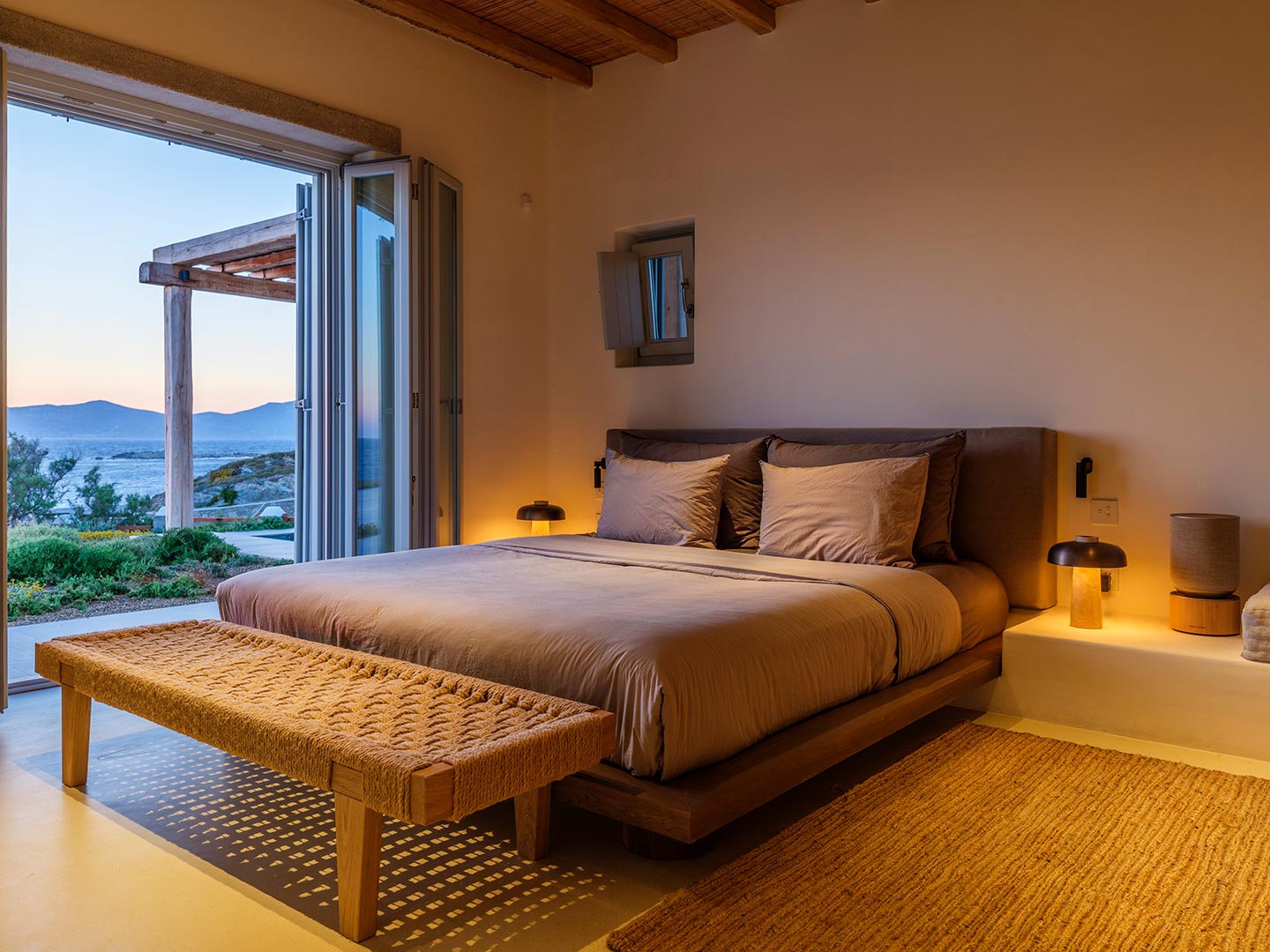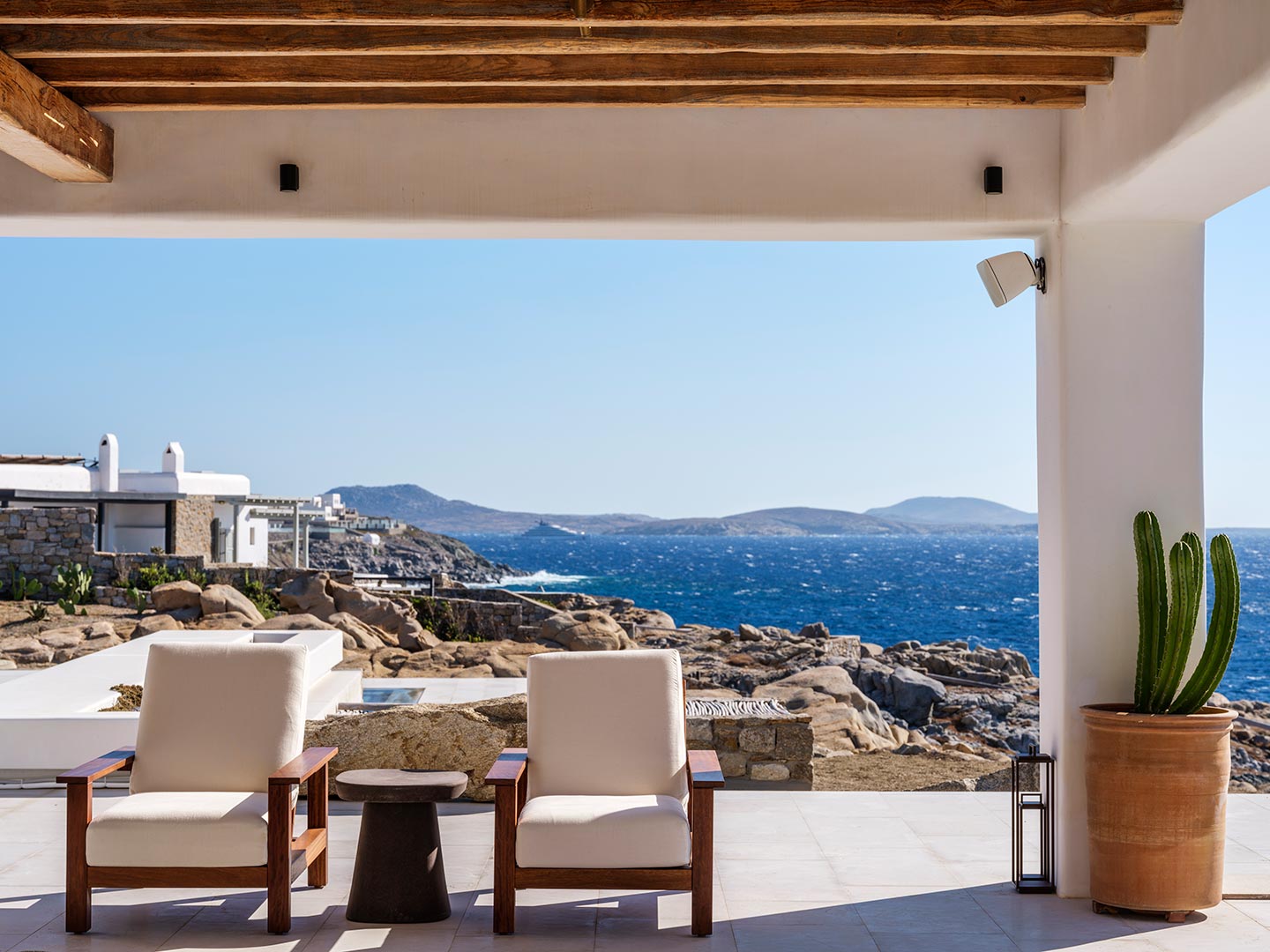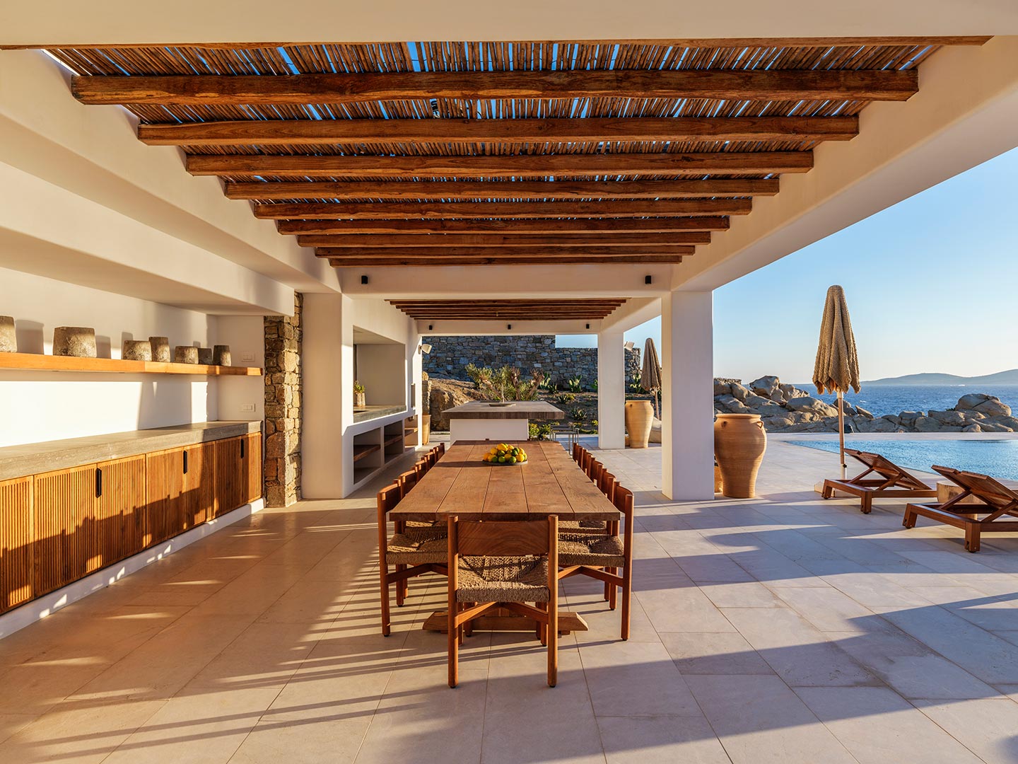 Perched on a southwest-facing cliff in Kanalia, Villa Pennie is a 2023 architectural gem designed by K Studio, offering panoramic views of Delos, Renia, and Tinos. With its own small private beach and a stunning heated marble pool, the villa delivers exceptional exclusivity and comfort. Designed with timeless Greek aesthetics, Villa Pennie features natural materials, whitewashed lines, and bright, open living spaces that seamlessly blend indoor and outdoor living. Spacious terraces, warm textures, and abundant natural light create a serene atmosphere ideal for relaxation. As the sun sets, the villa transforms into a sanctuary of color and calm, perfect for poolside lounging or alfresco dining while taking in breathtaking Aegean views.