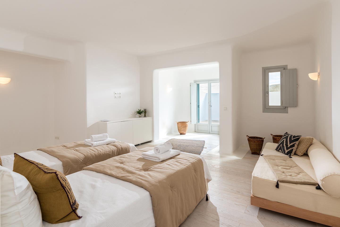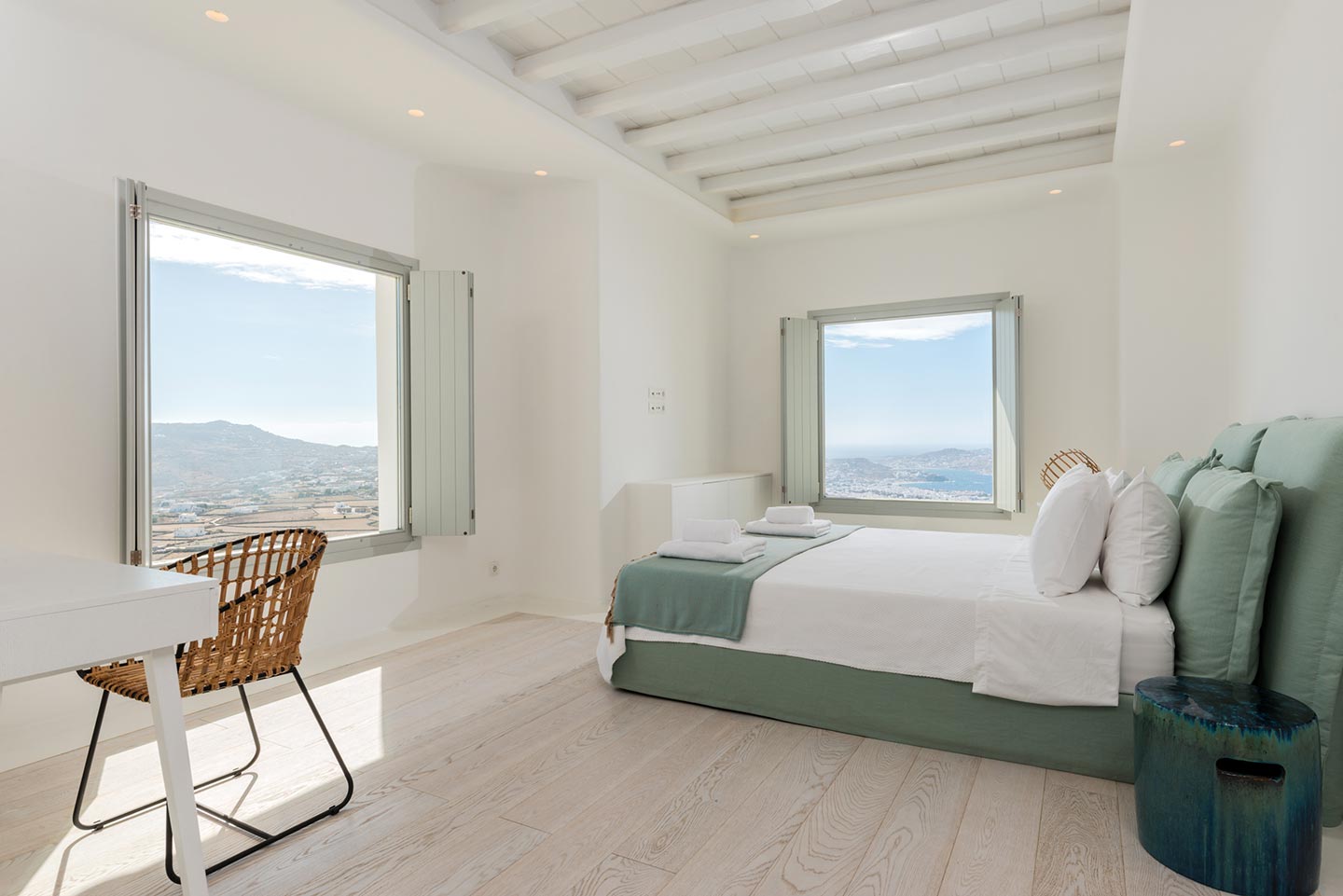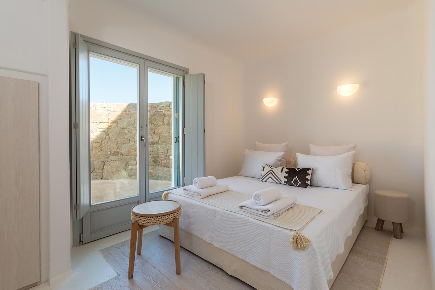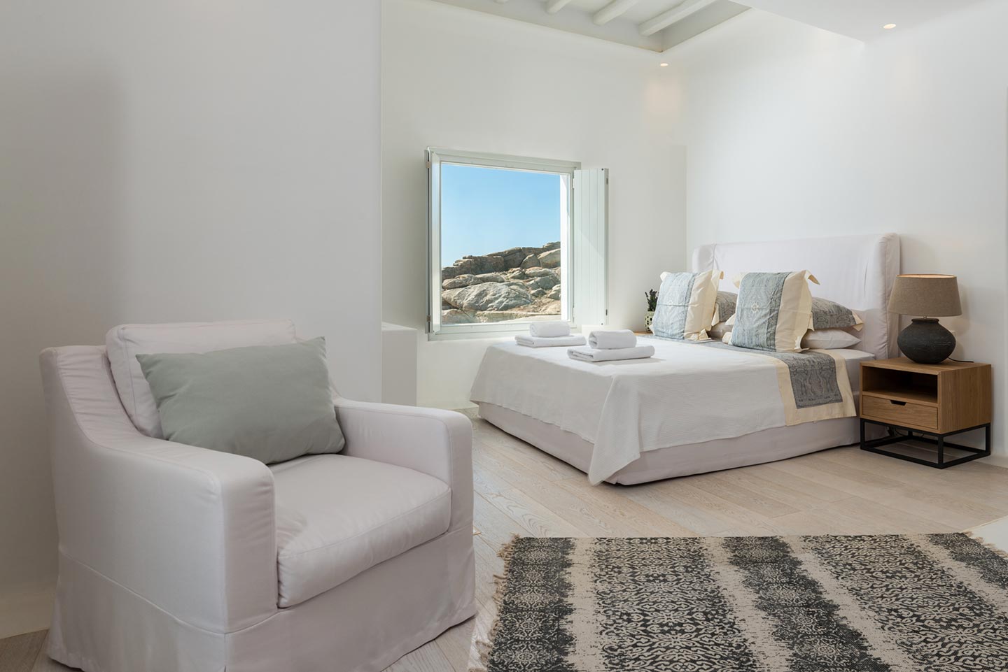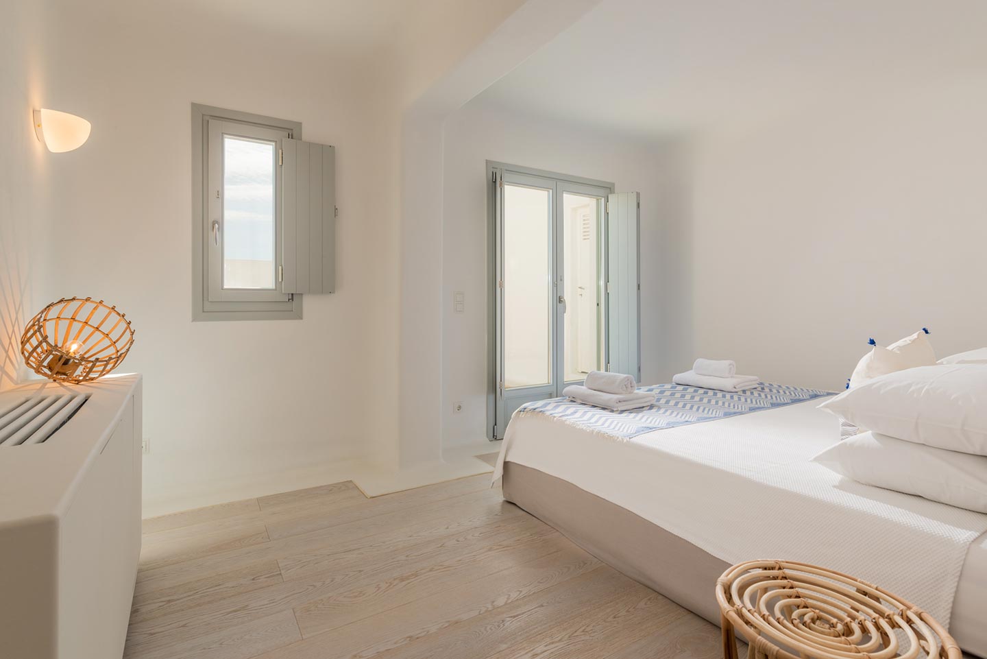 One master bedroom with king size bed, A/C, en-suite bathroom with shower, safe box, hairdryer, walk-in closet, Wi-Fi, amazing view of Mykonos town, access to private terrace