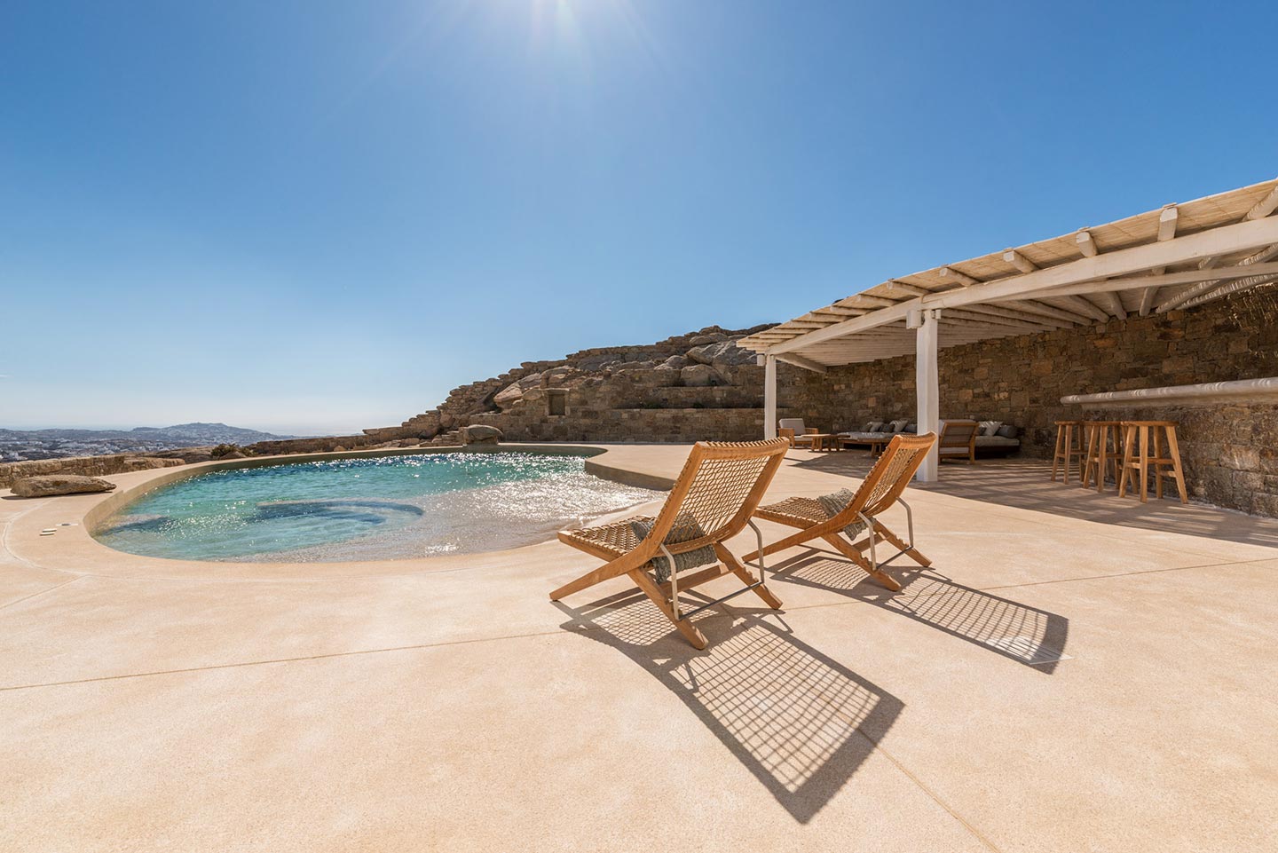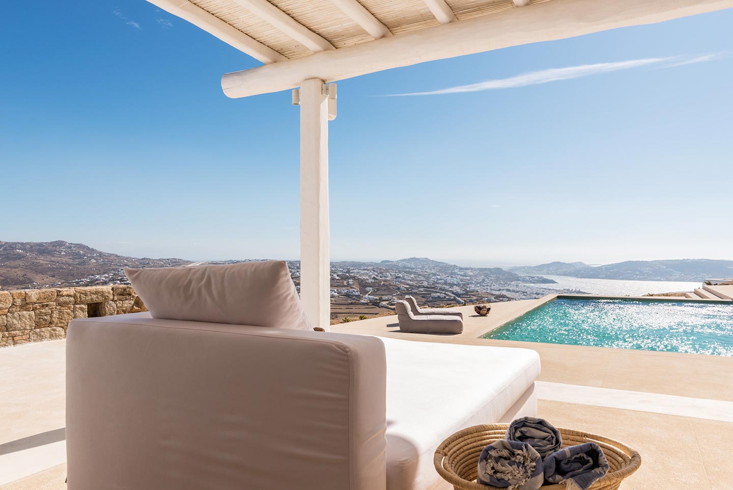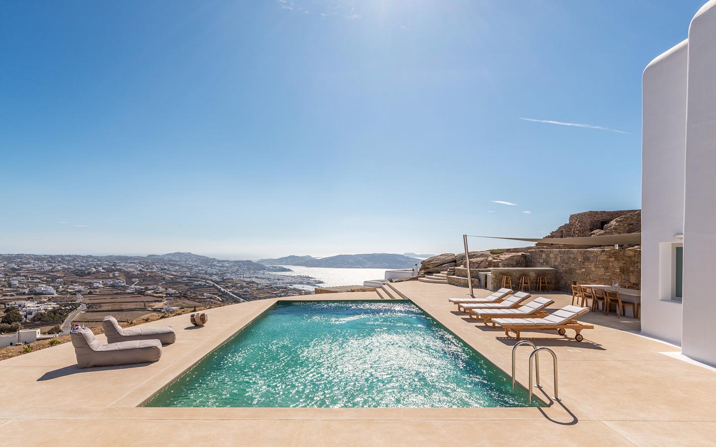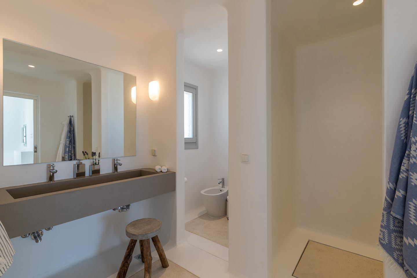 One master bedroom with king size bed, A/C, en-suite bathroom with shower, safe box, hairdryer, walk-in closet, Wi-Fi, amazing view of Mykonos town, access to private terrace