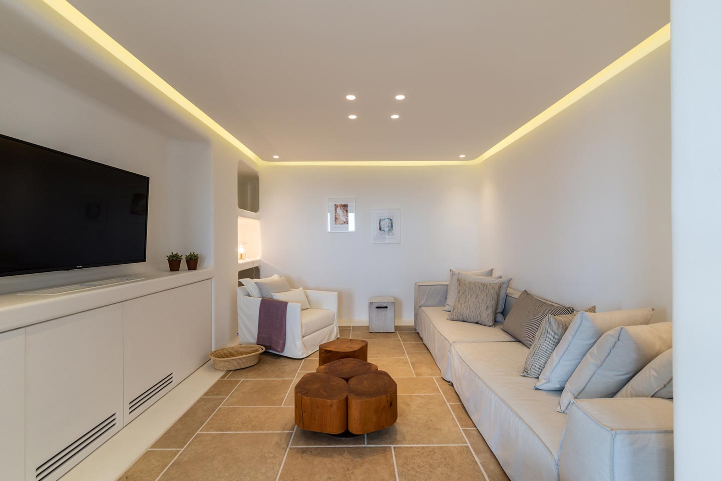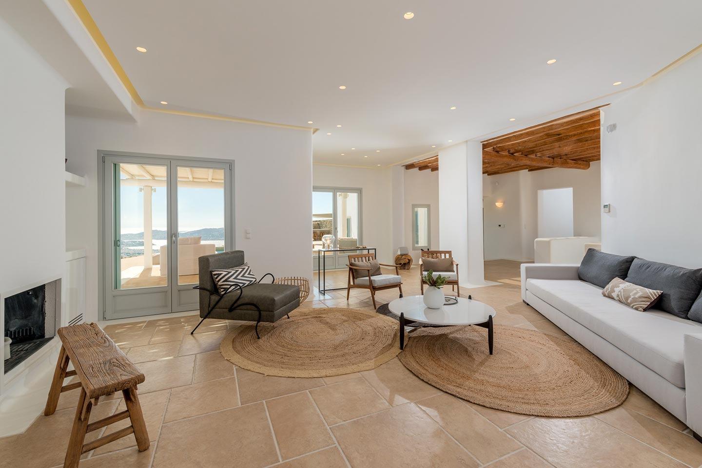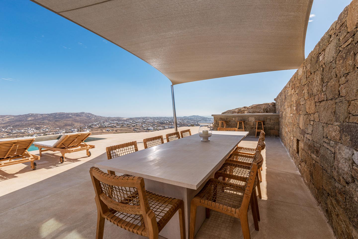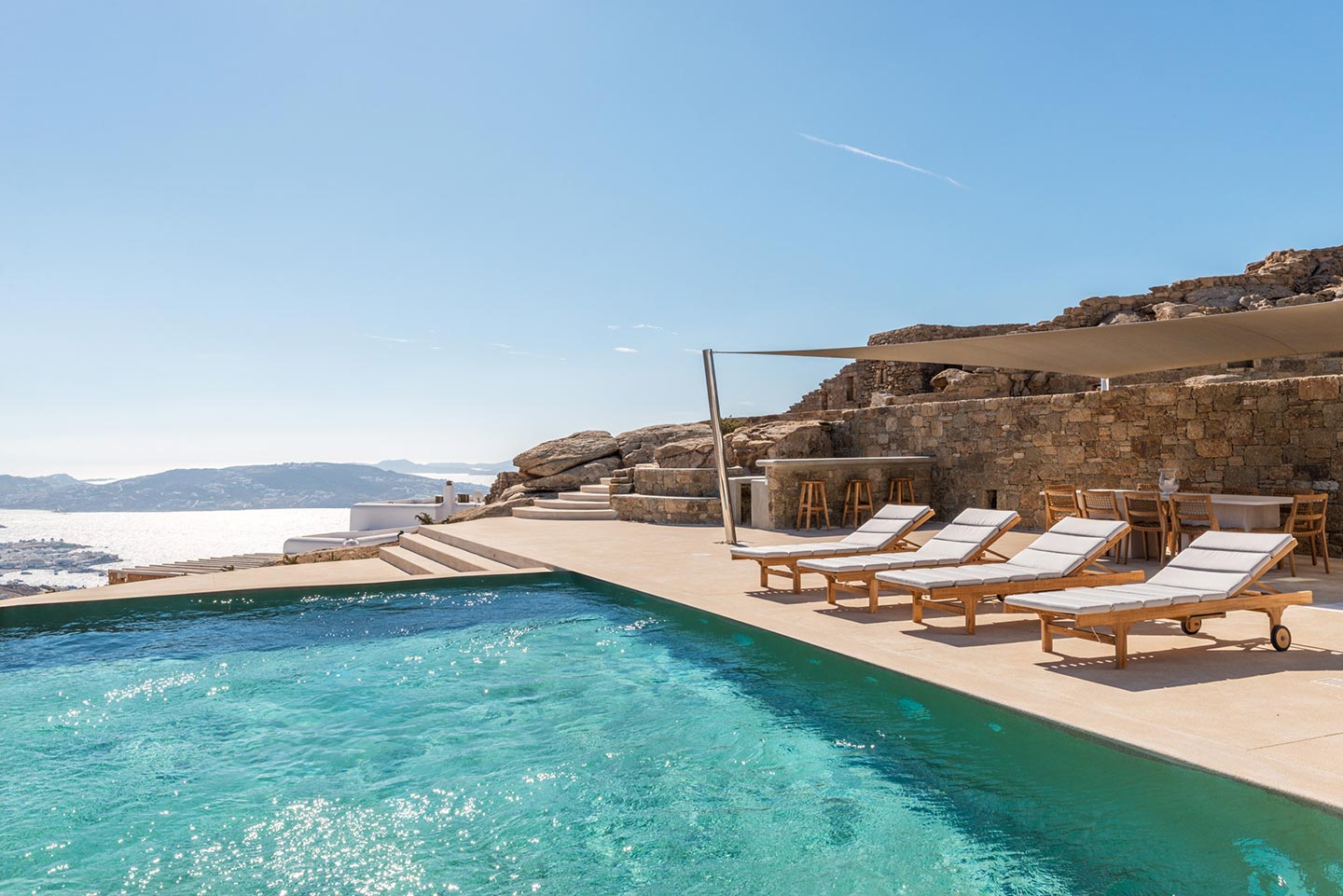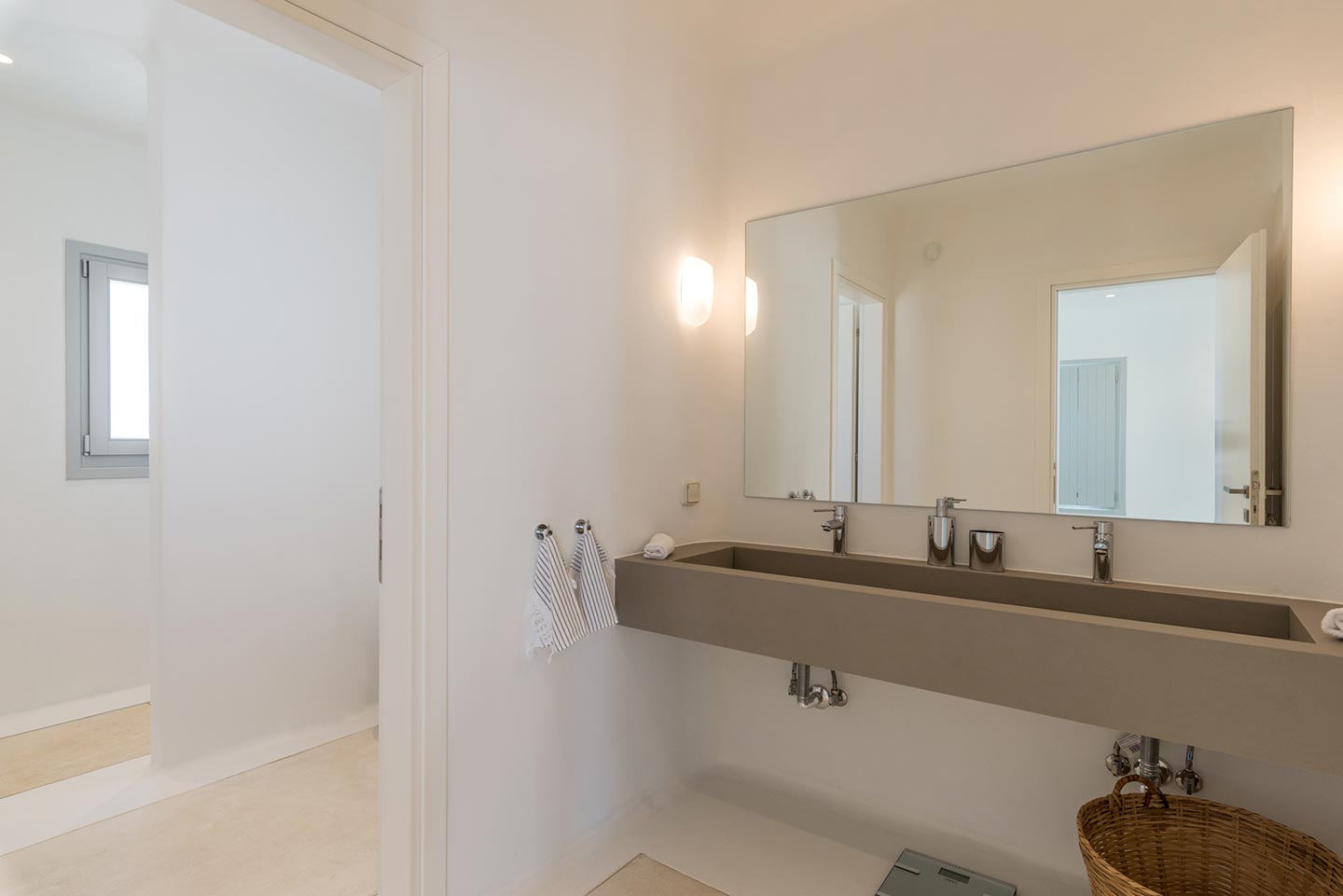 One master bedroom with king size bed, A/C, en-suite bathroom with shower, safe box, hairdryer, walk-in closet, Wi-Fi, amazing view of Mykonos town, access to private terrace