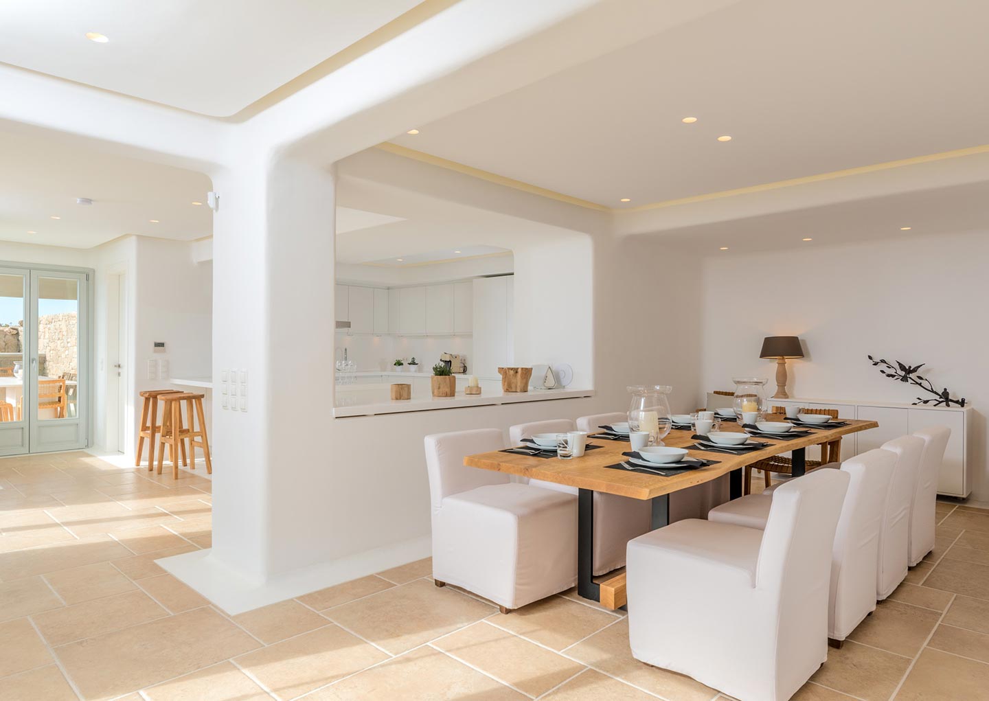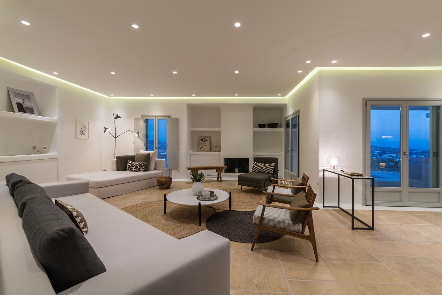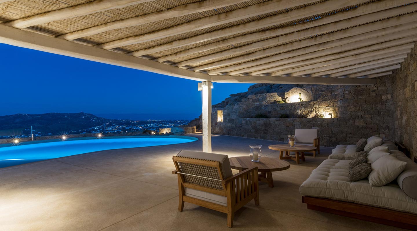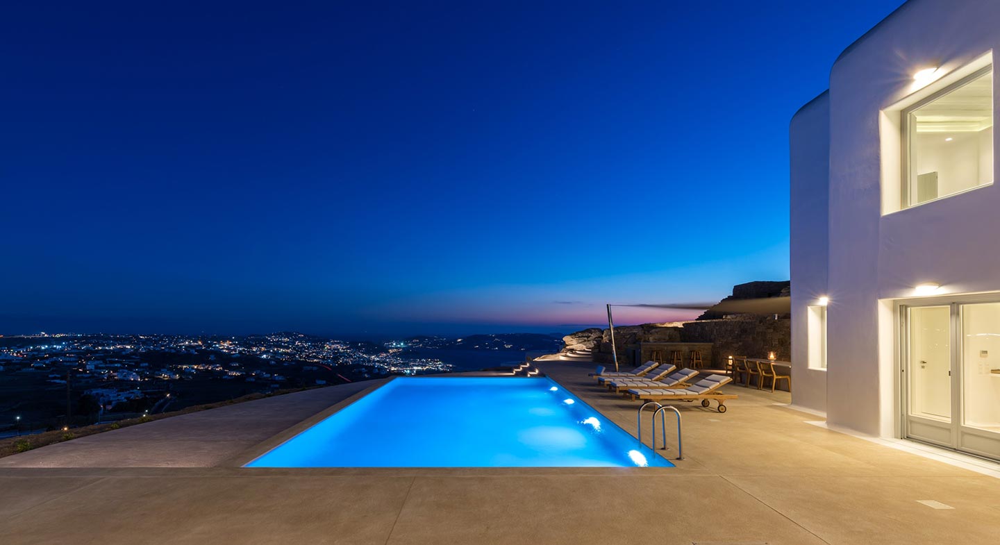 Villa Popi is ideally located in the Agia Sofia area, offering breathtaking panoramic views of Mykonos island and the new port. The setting is private and serene, offering luxurious accommodations. The estate can accommodate 14 guests and consists of multiple levels and 7 bedrooms total. On the upper level, the villa hosts a double bedroom with en– suite bathroom and direct access to private balcony with stunning Aegean views.
