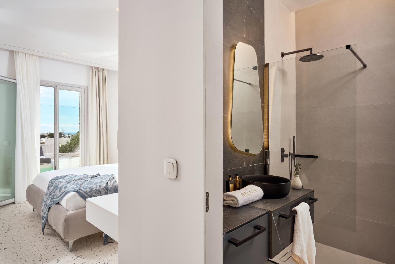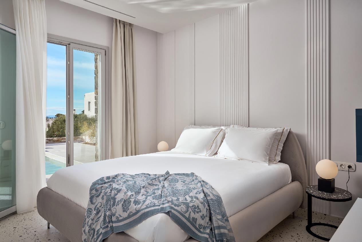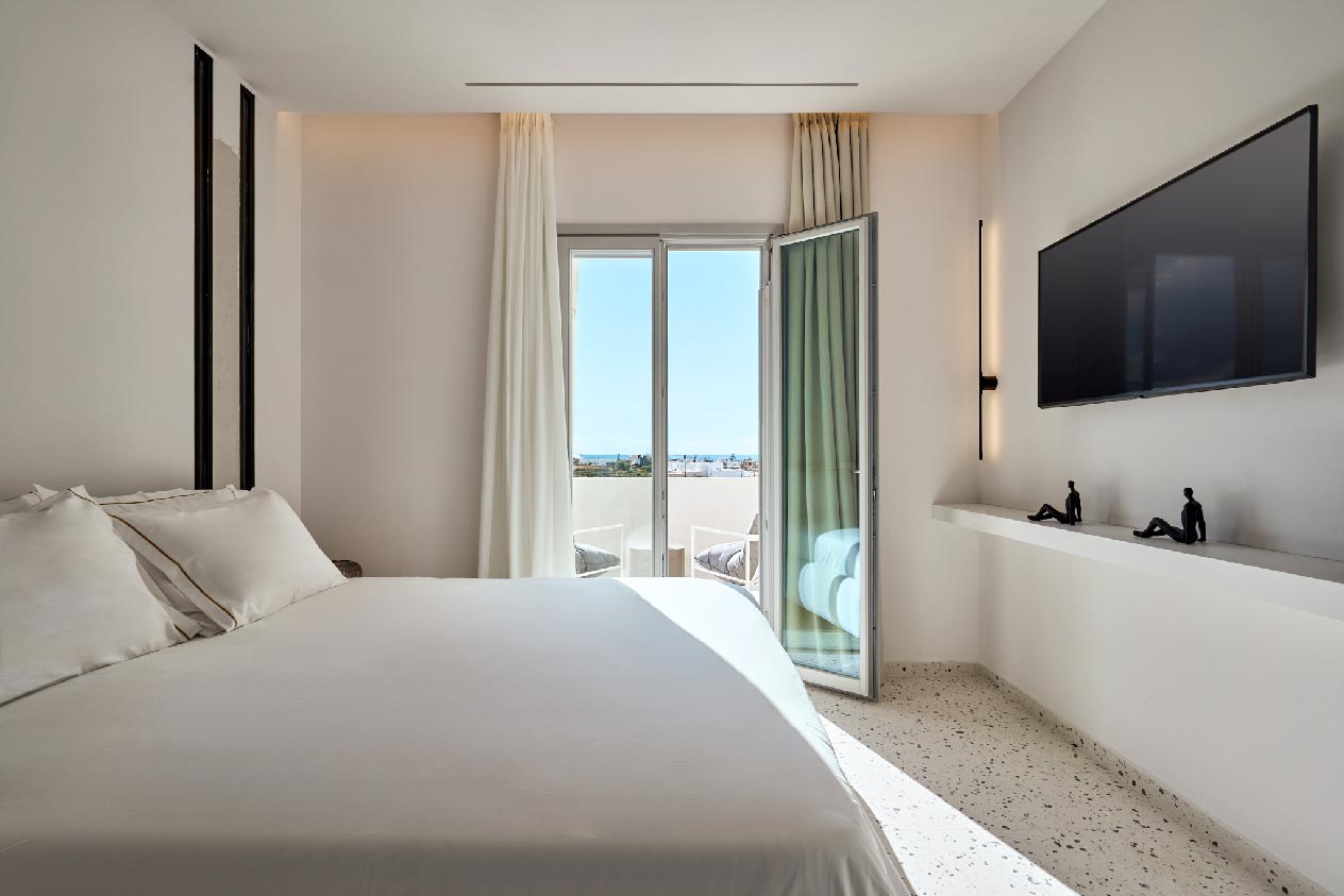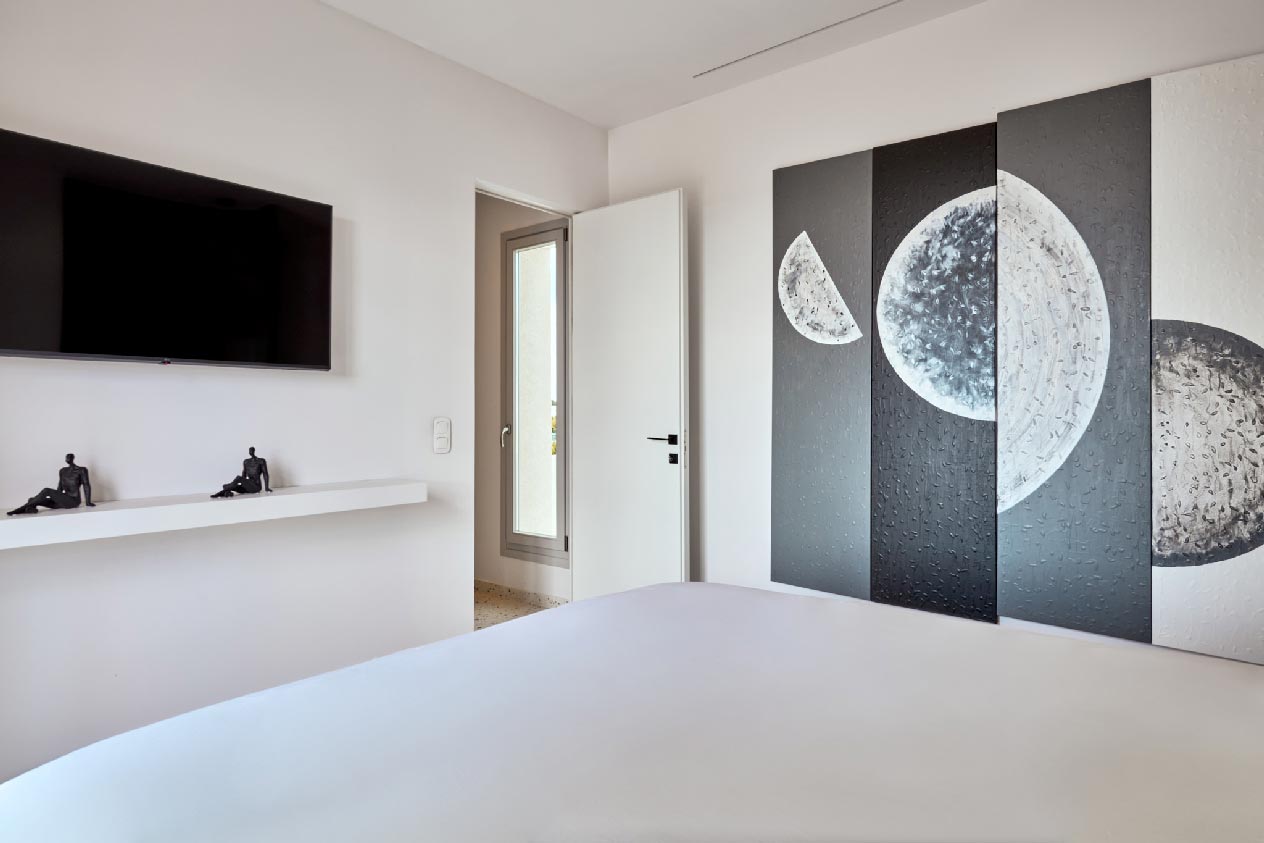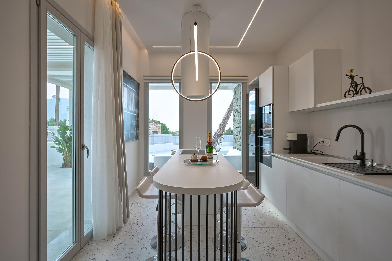 Villa Rene features one bedroom on the ground floor and two on the first floor, each with en-suite bathrooms and comfortable beds, all adorned in soothing white tones. Its all-white interiors complement traditional Cycladic design, offering a refined yet simple atmosphere. The villa includes a spacious sitting room and a fully equipped kitchen with minimal yet contemporary decor and original modern art.
