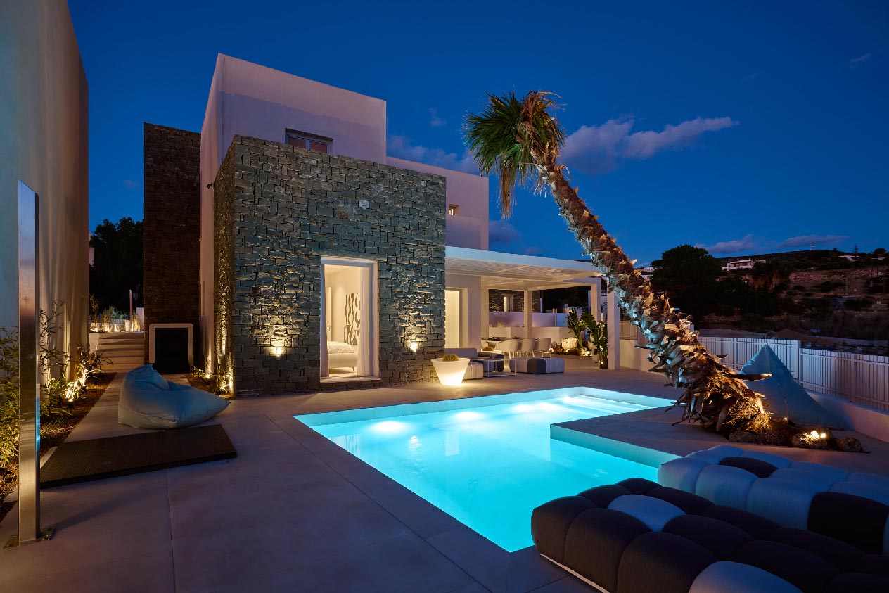 A cozy sitting area and lounging space under the stars invite relaxation with family and friends, while you enjoy the stars of the Greek sky.