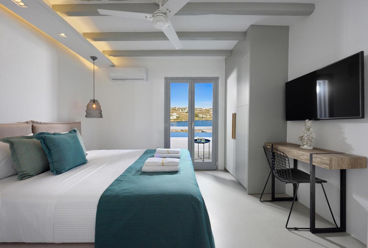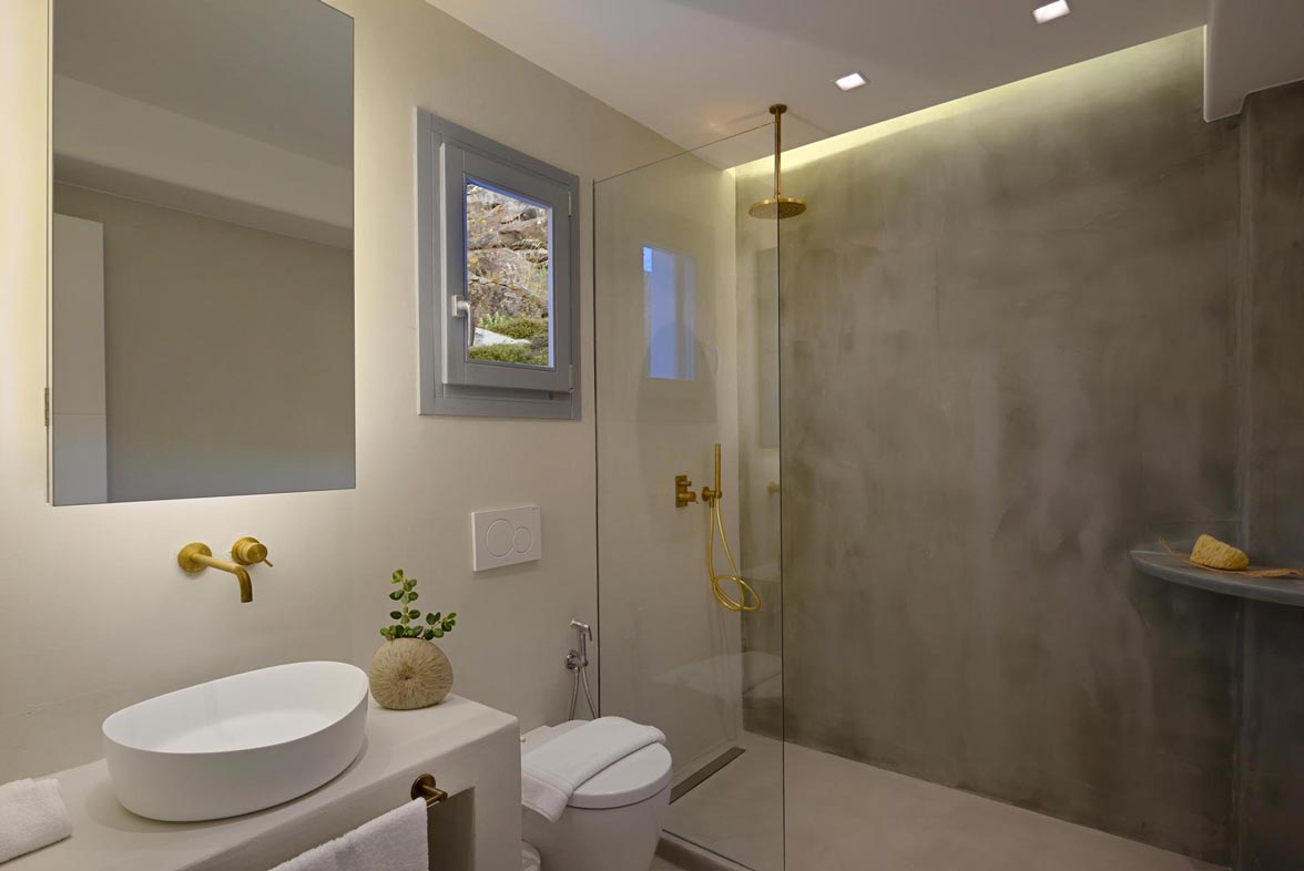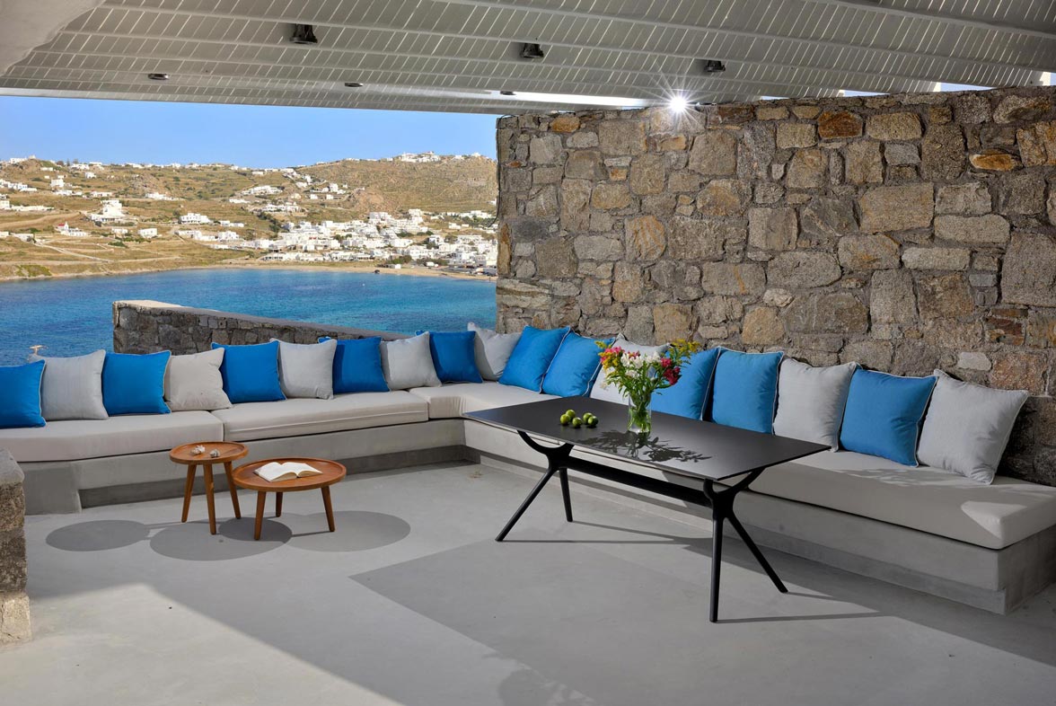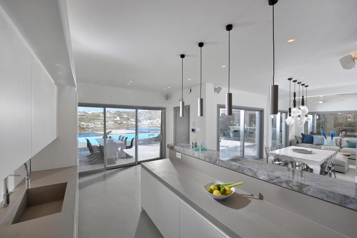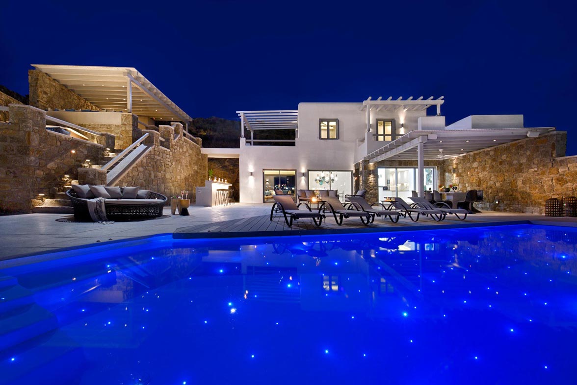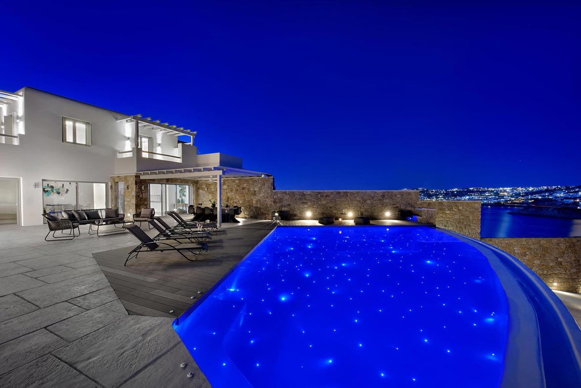 The impressive, newly built Mykonos Villa Stardust is situated at a privileged location with breath-taking, unobstructed panoramic views of Corfos bay and Mykonos Town. The area combines easy and quick accessibility to popular destinations of the island as well as absolute privacy due to its location. Only a 2-minute drive from the world famous Ornos beach and a 6 minute drive to Mykonos Town. A 230 square meters, two-level property, all modern and minimal, boasting large open plan living room areas, indoors and outdoors, offering privacy and seclusion at a very idyllic spot.