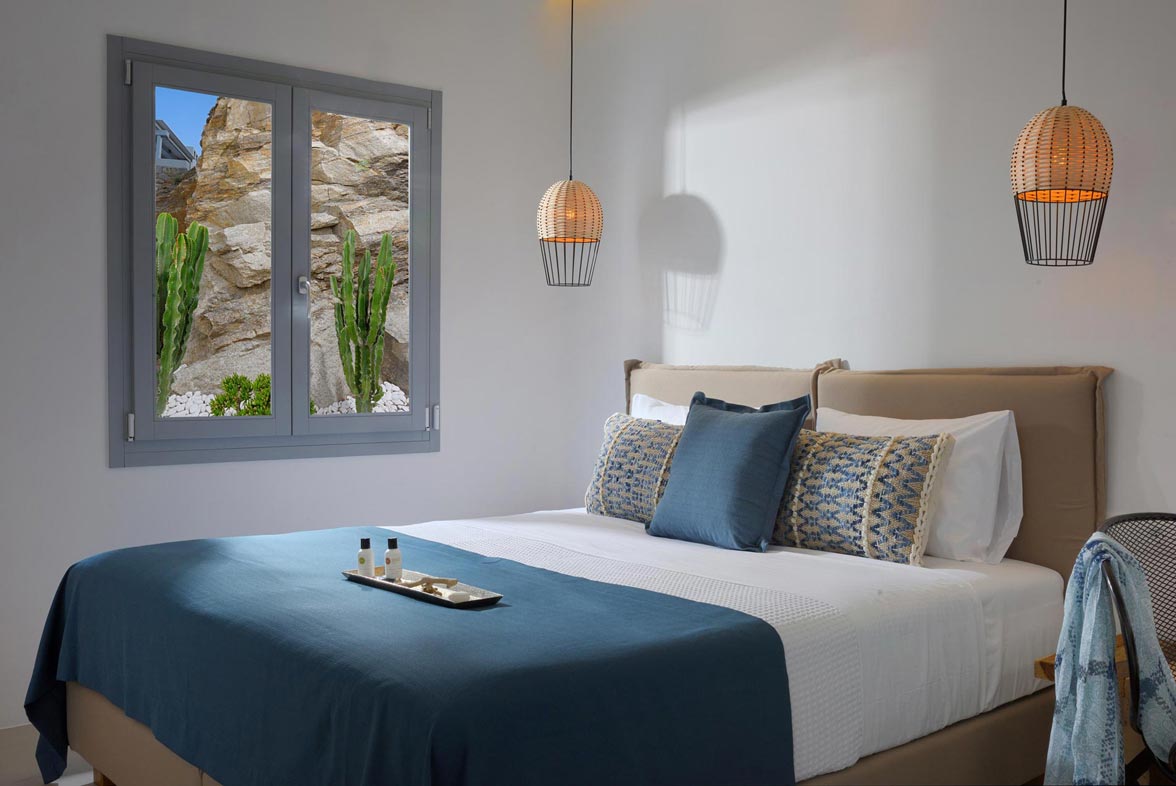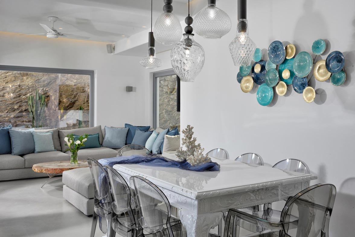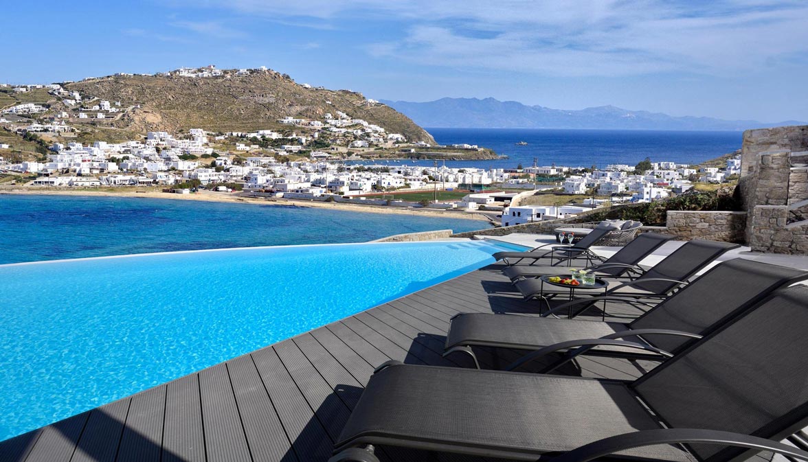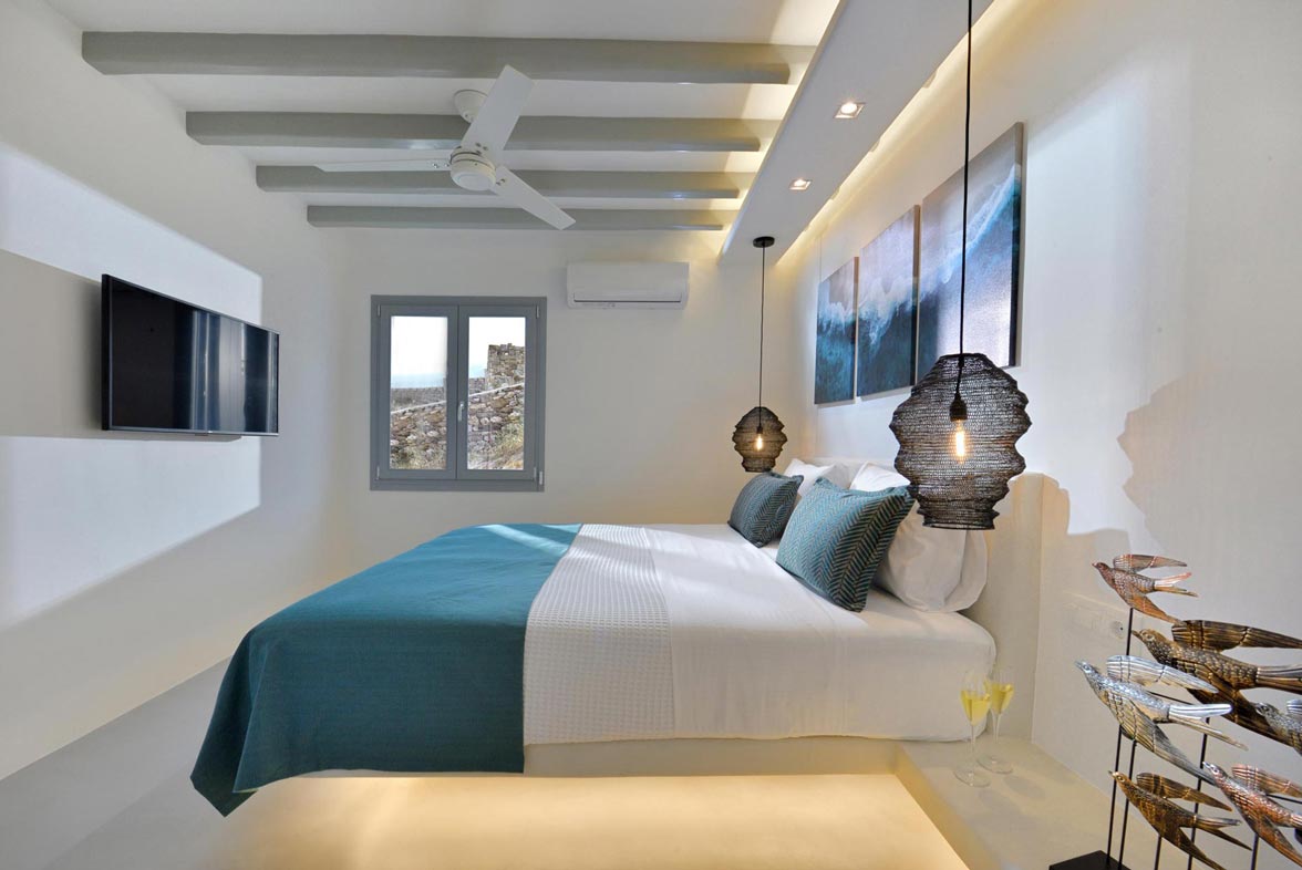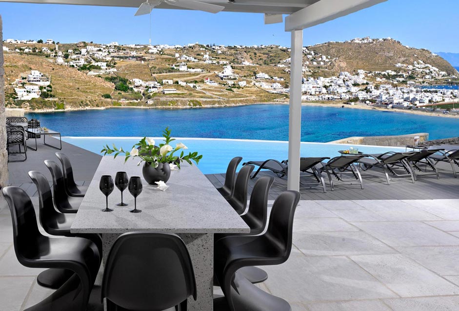 Villa Stardust offers a comfortable and welcoming stay for 10 people, with 5 double bedrooms & 4 en suite bathrooms. The indoor spaces are appointed with cutting-edge minimal décor featuring all modern design furniture and objects. Outdoors, there is a private infinity swimming pool with sun loungers, jacuzzi, a bar as well as sitting and dining areas with stylish furnishing. The traditional Greek touch is fused with the luxurious and tasteful design of the villa and the colorful sunset view complete the perfect picture that makes every Greek myth a reality. Mykonos Villa Stardust is considered a luxurious and sensational choice for all kinds of guests.